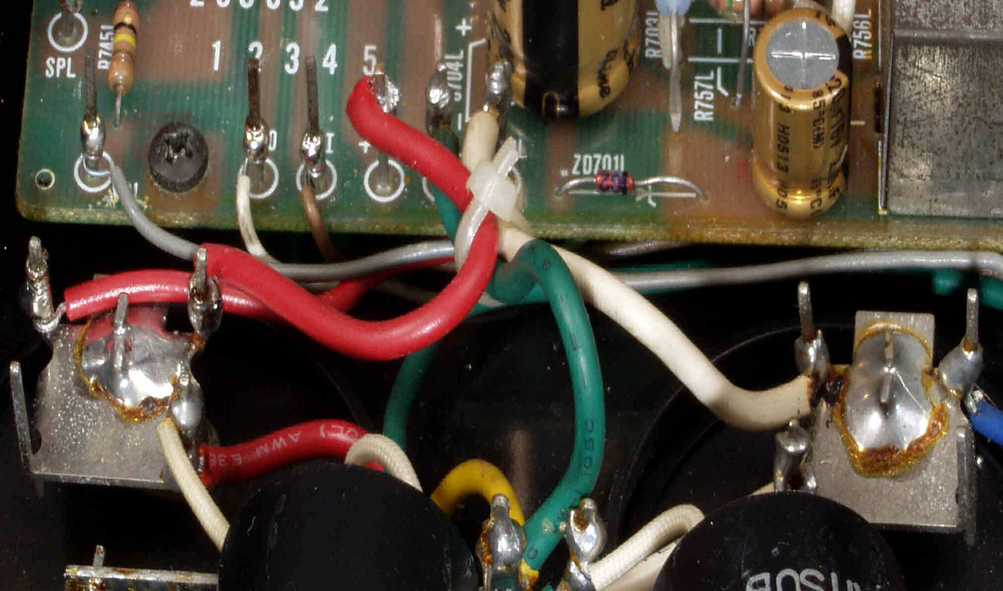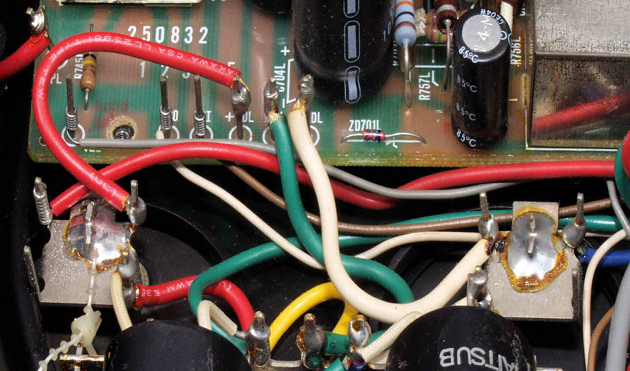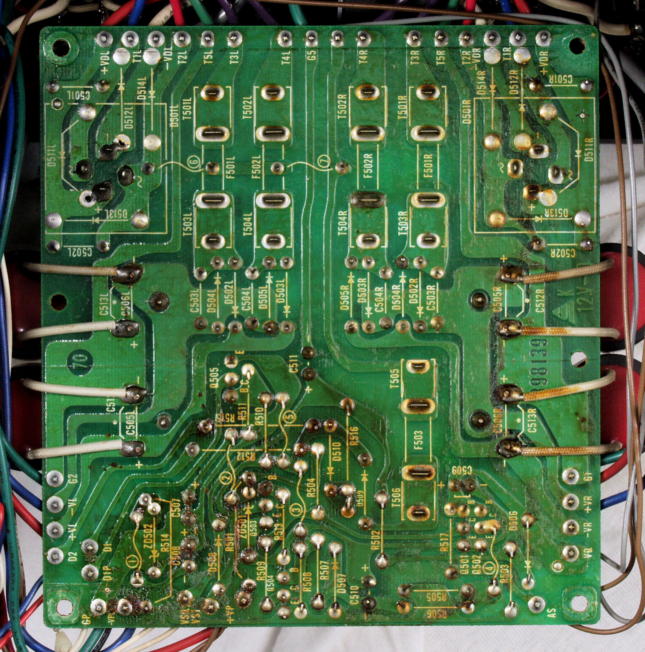| CAF. 修理後 R側ドライブ基板−電源基板へのラッピング線に半田を浸み込ませる |