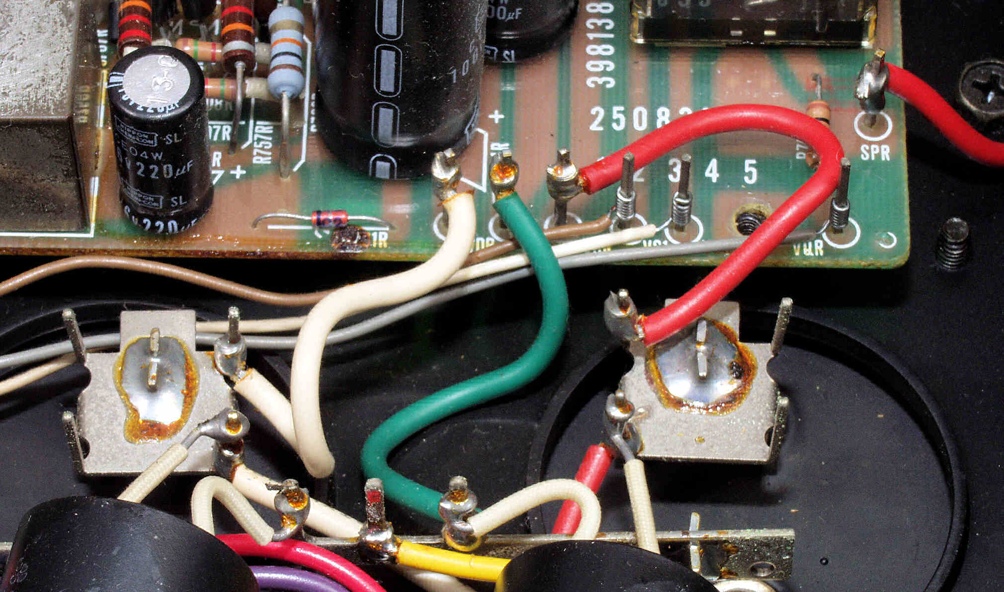| C6F. 修理(半田補正)後 RCA端子基板裏 半田を全部やり直す フイルムコンデンサー2個交換、2個増設 |