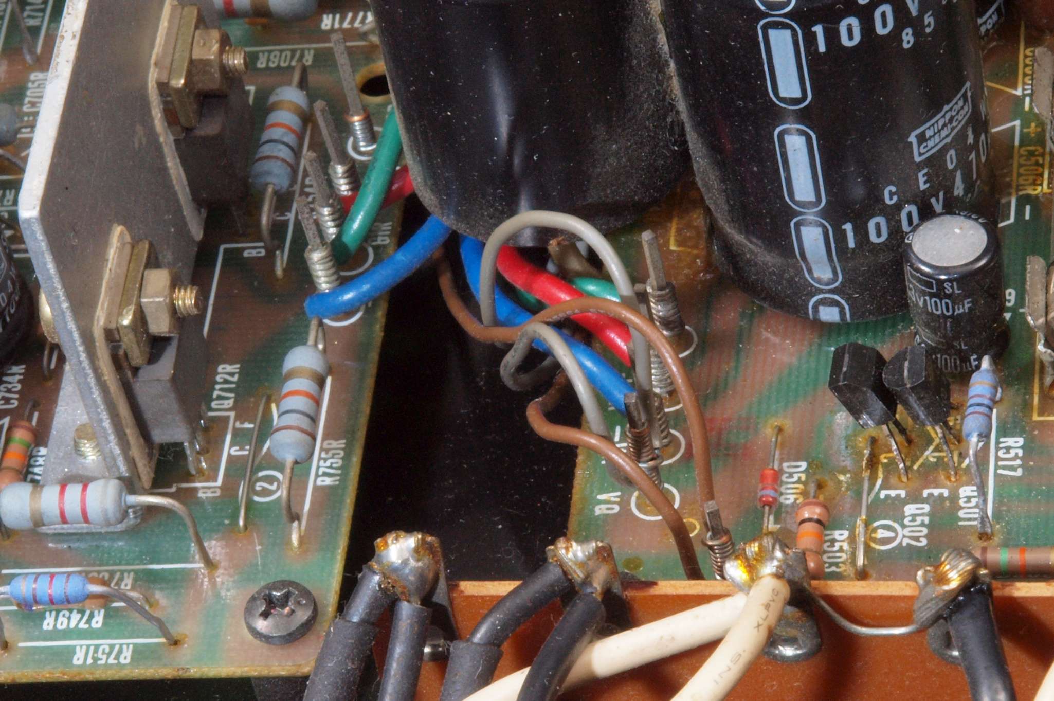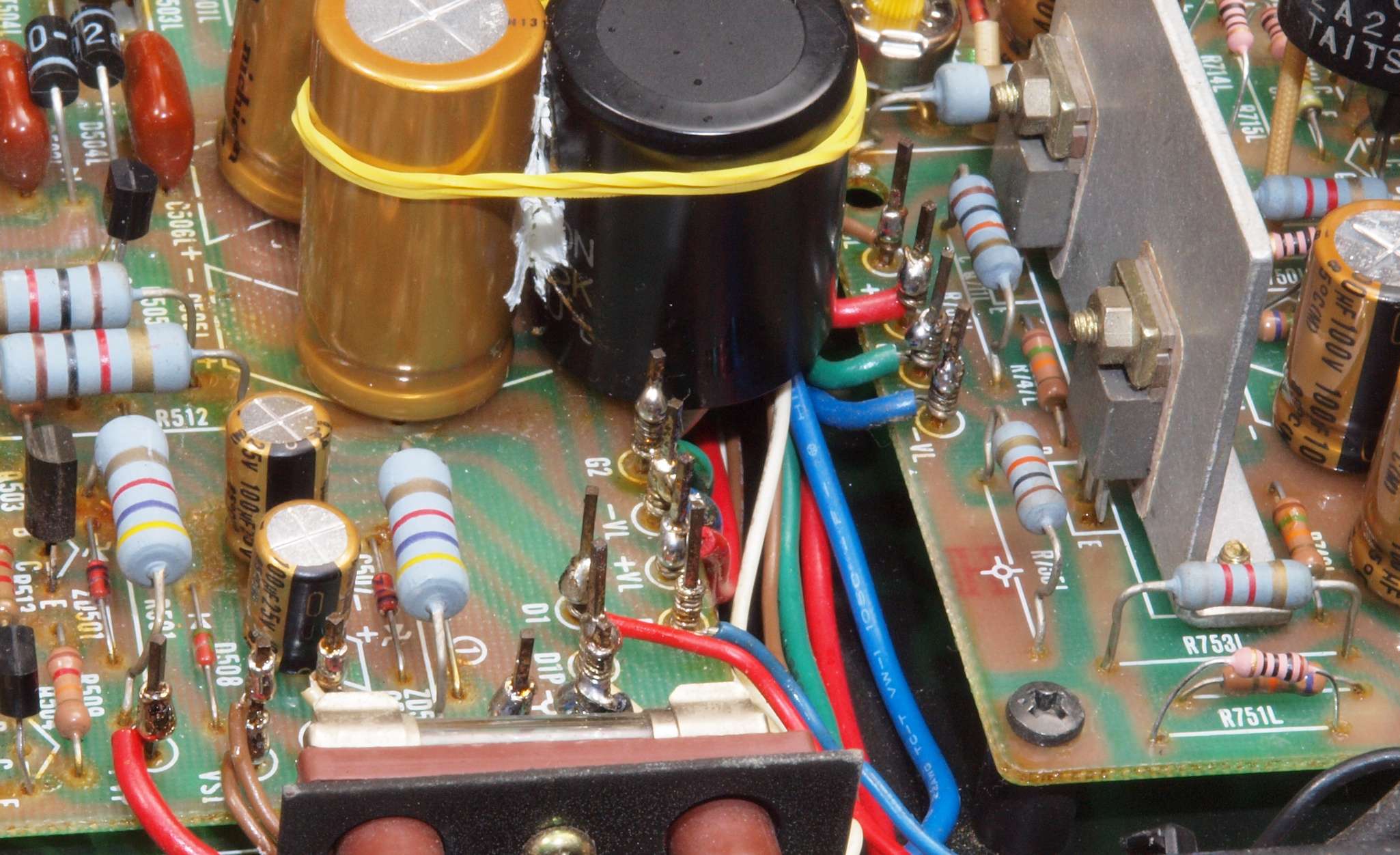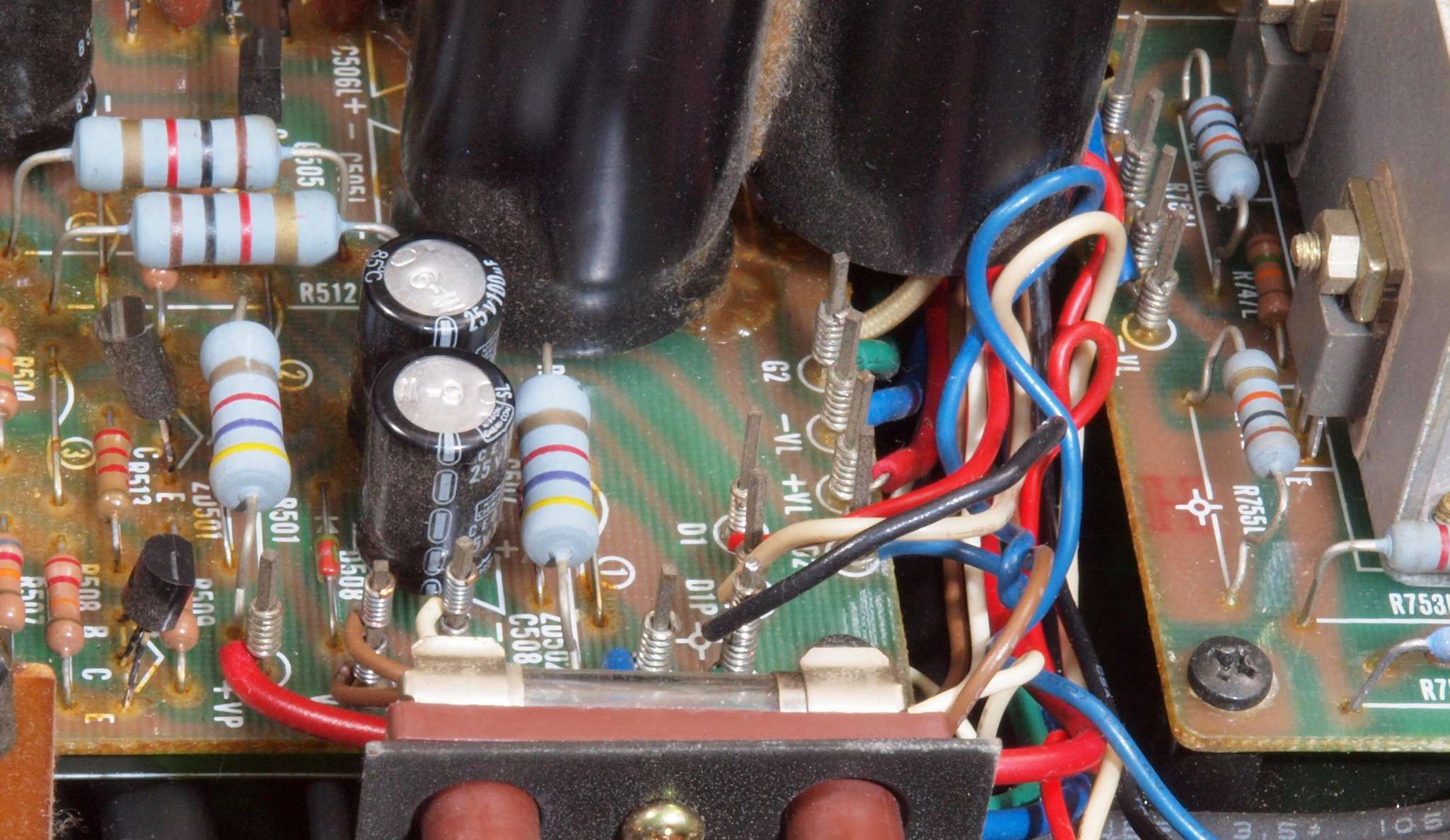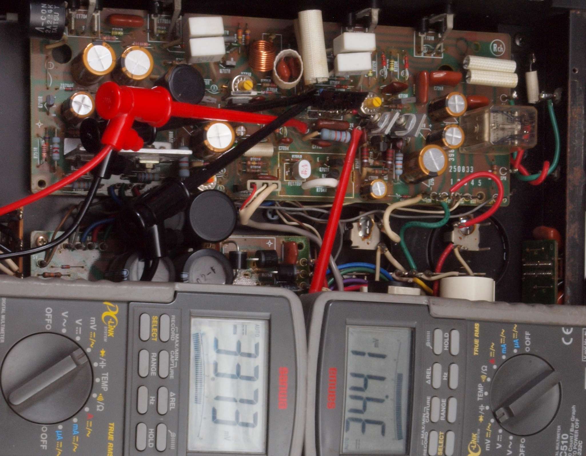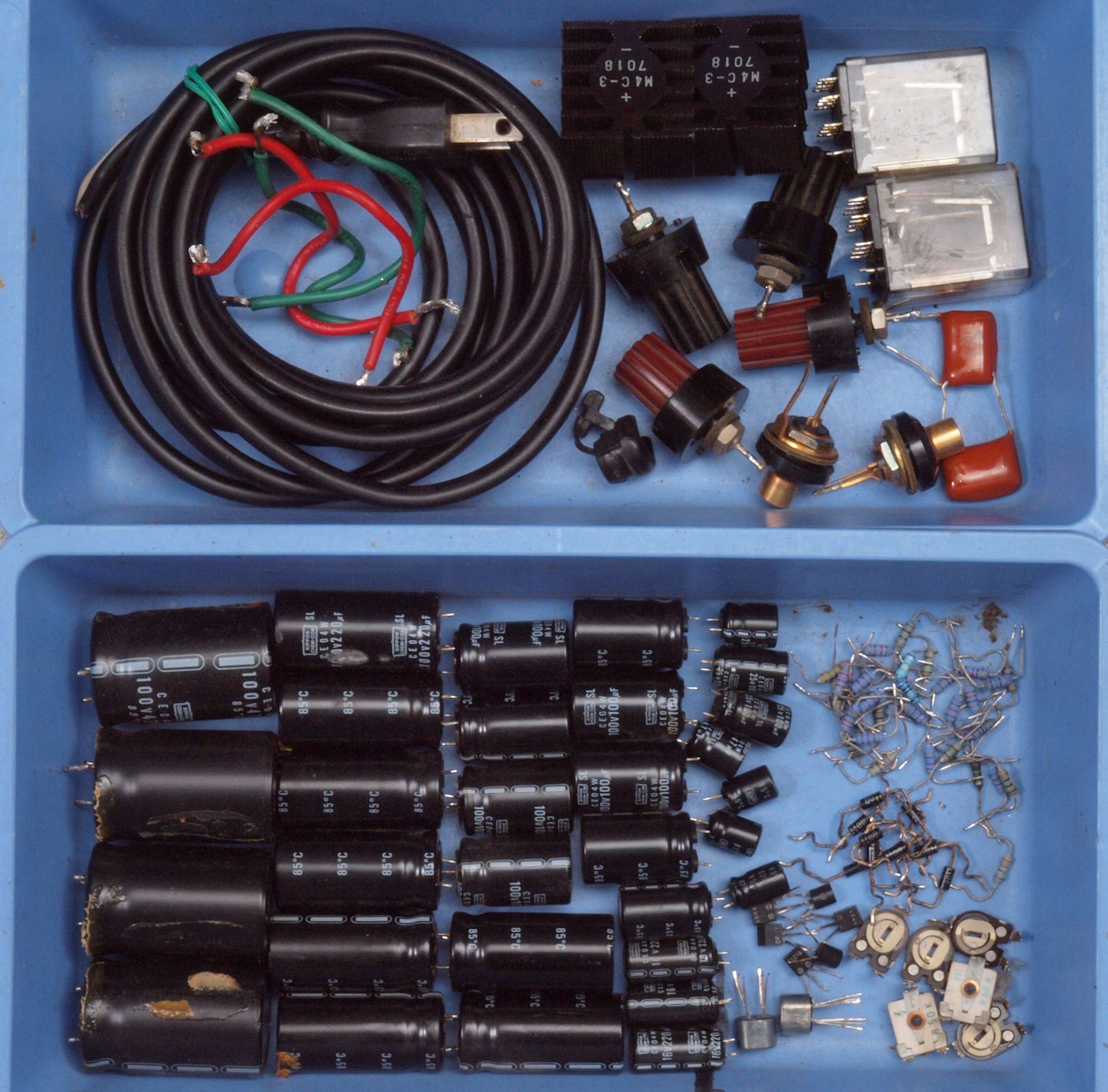 ヒューズ入り抵抗全部、電解コンデンサー11個、足黒TR(トランジスター)1個交換。