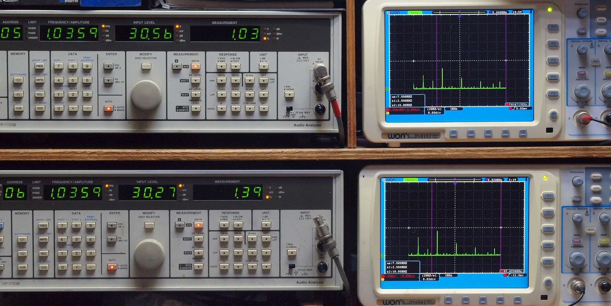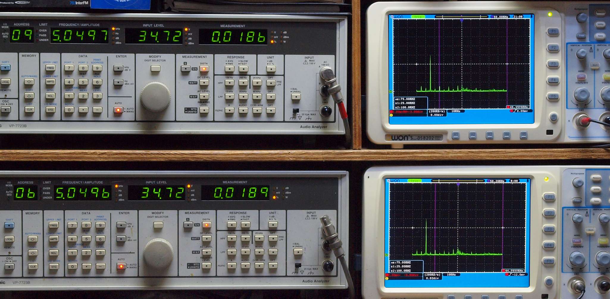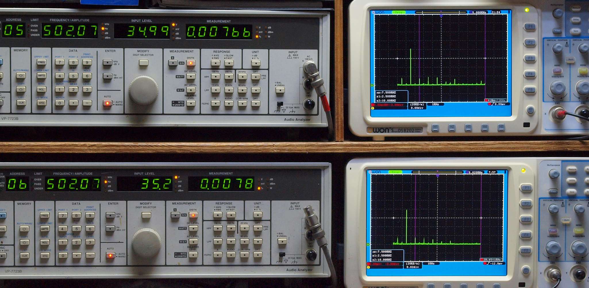 上段右端 VP−7723Bの基本波除去出力を「owon SDS8202(200MHZ)」で「FFT分析」表示。