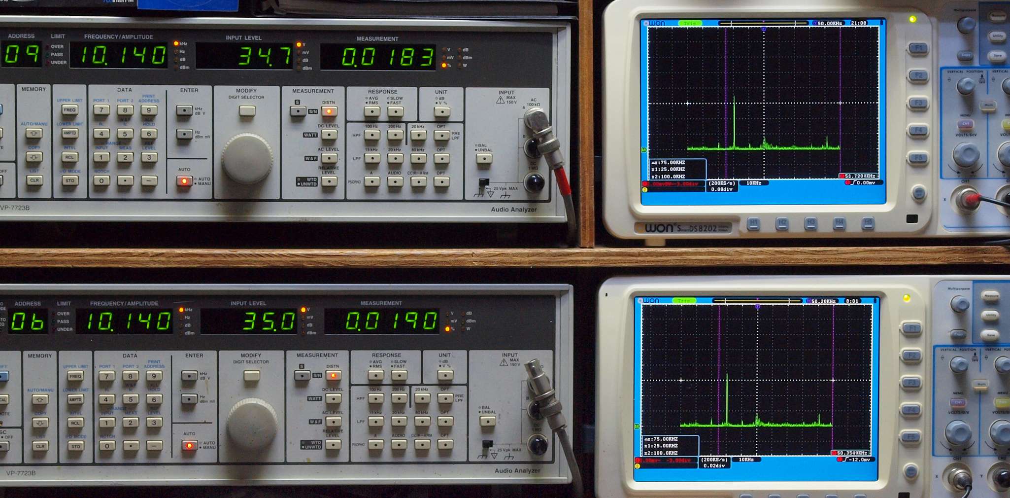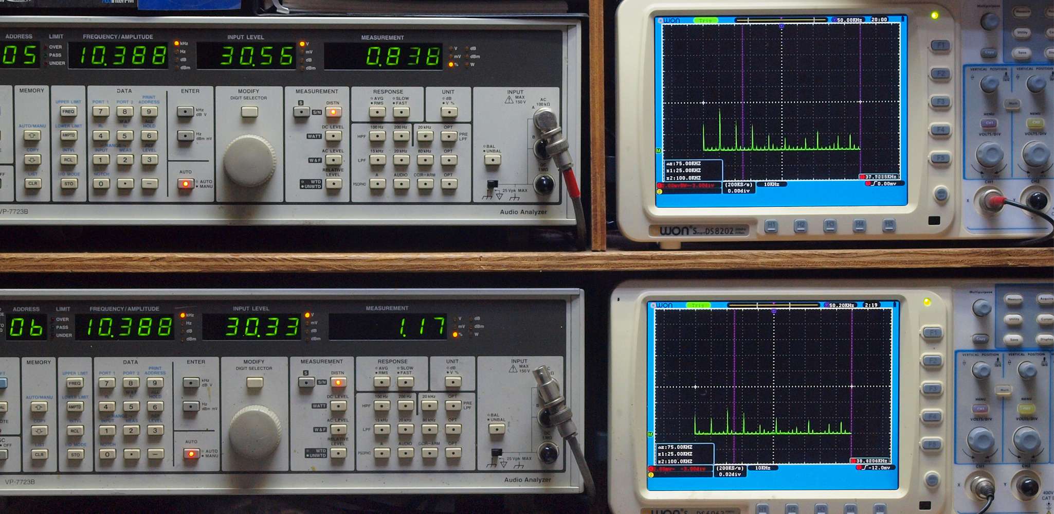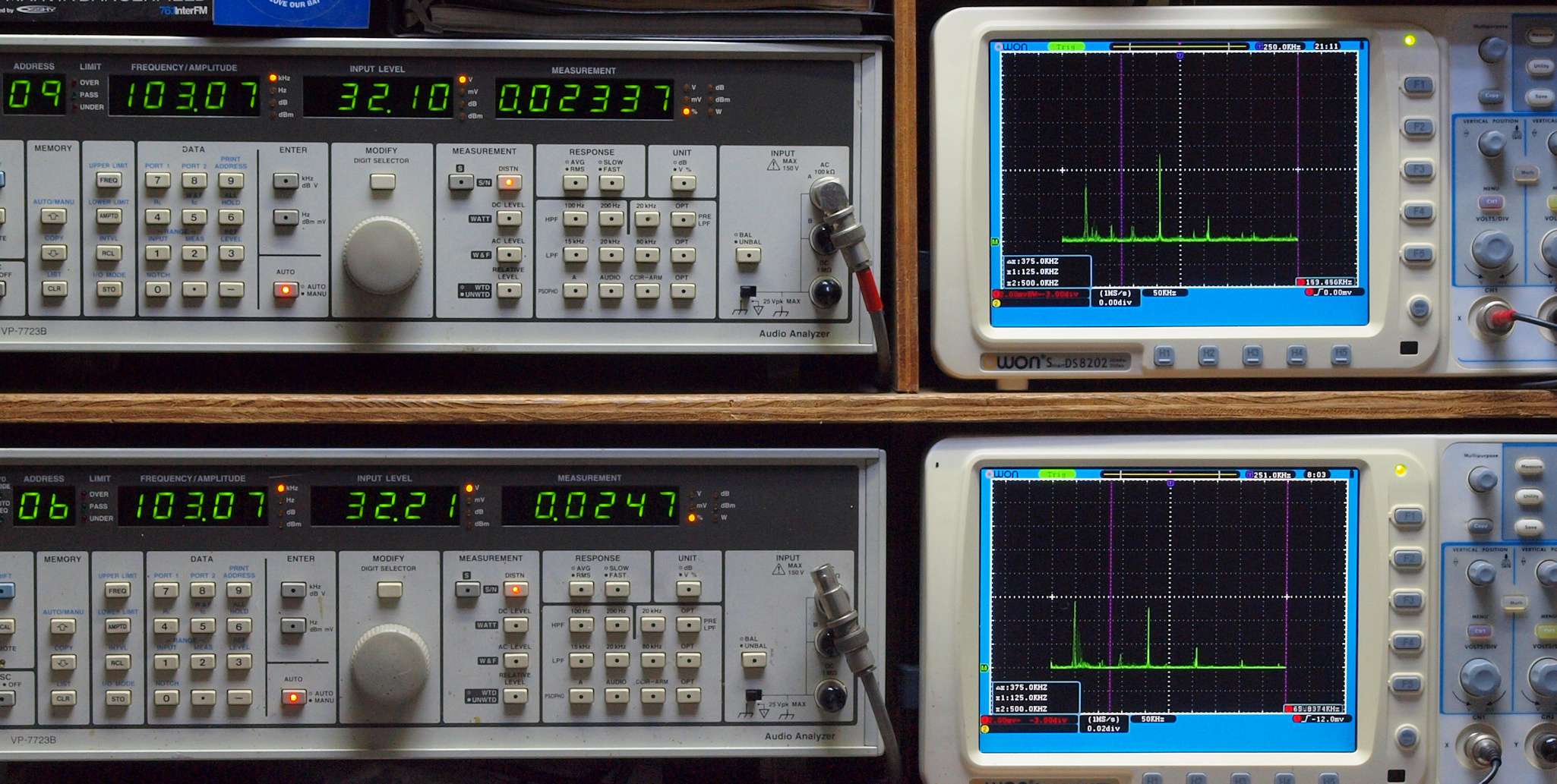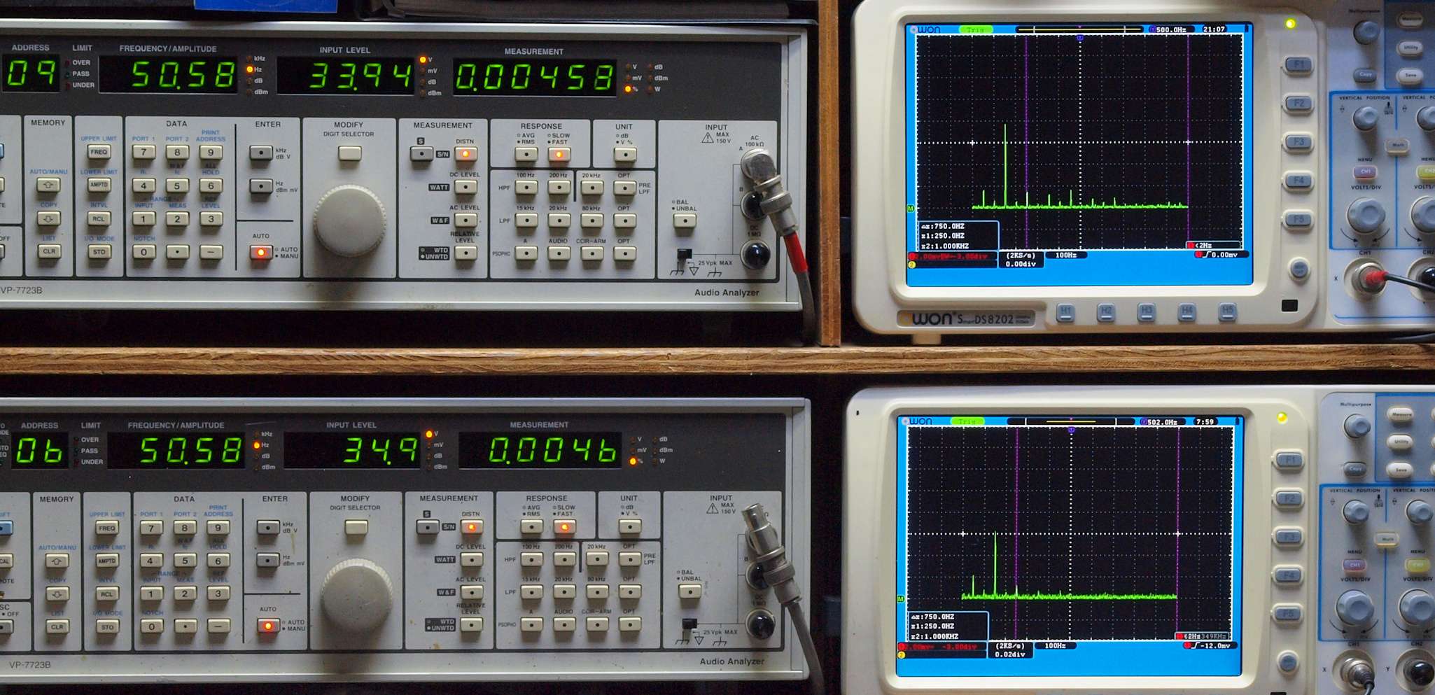 上段右端 VP−7723Bの基本波除去出力を「owon SDS8202(200MHZ)」で「FFT分析」表示。