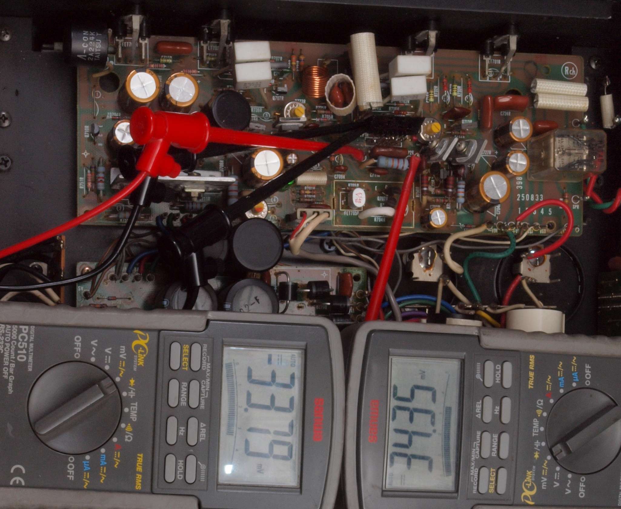 A33. 点検中  R側ドライブ基板の電解コンデンサー頭のビニールのむけは無。