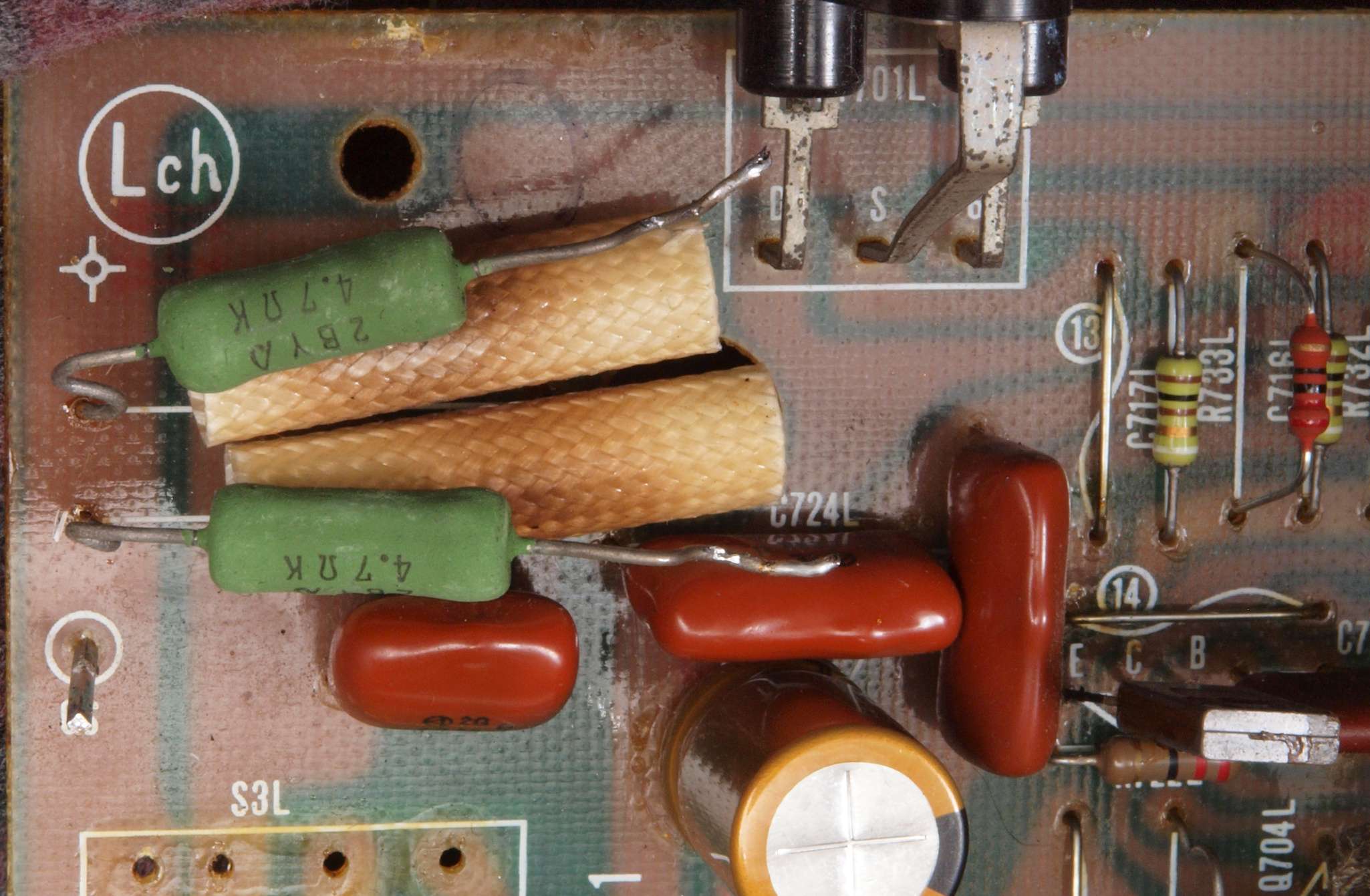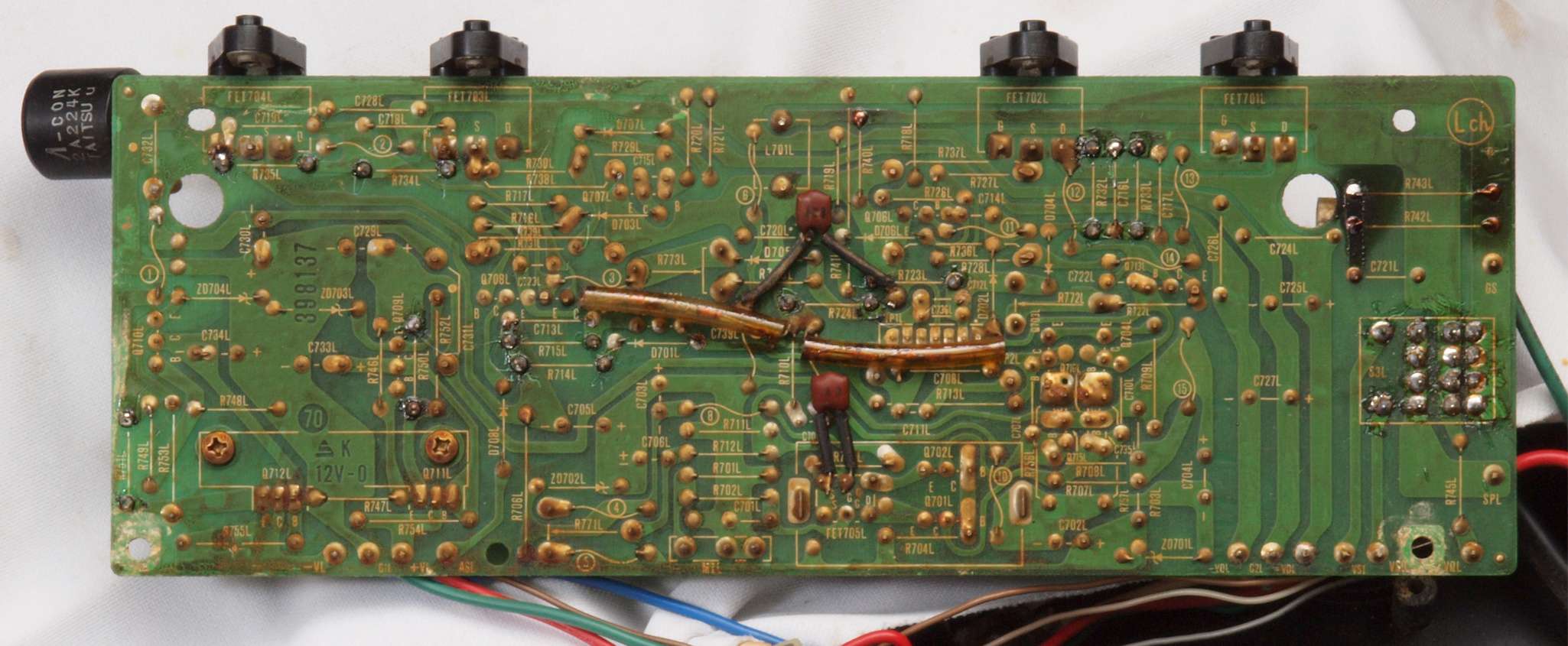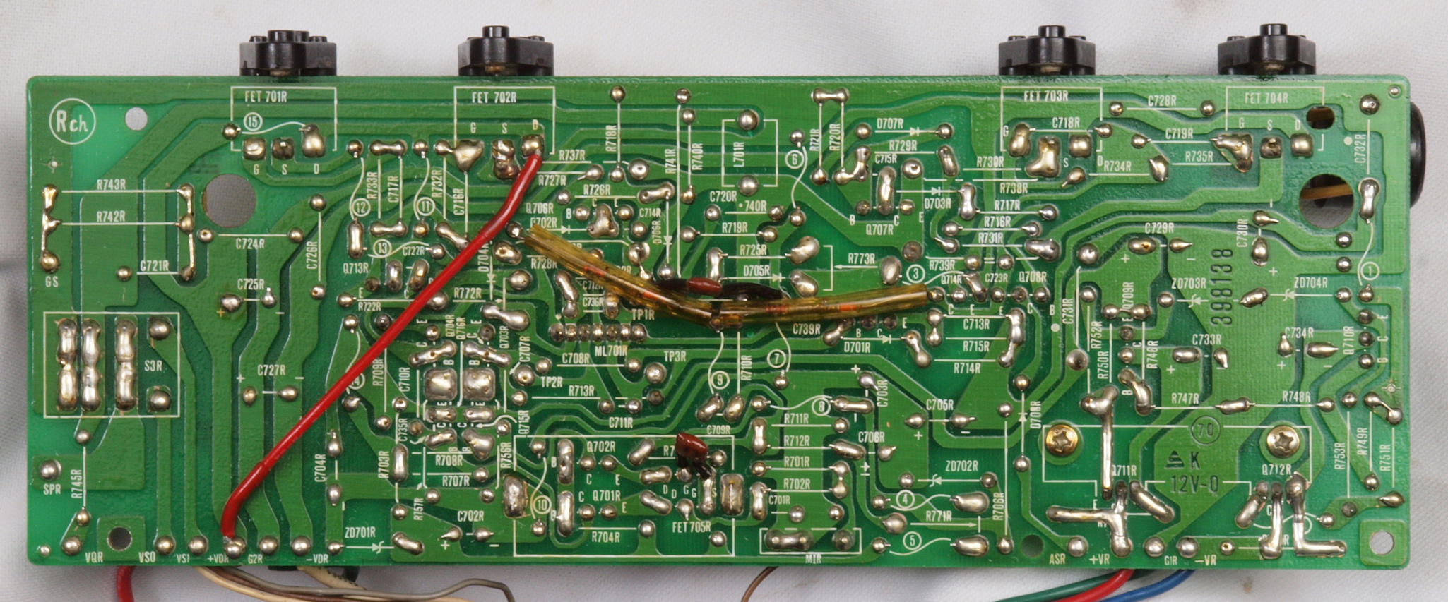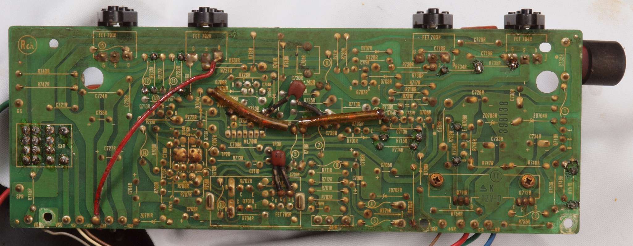 C11. 修理前 R側ドライブ基板。 入手難のヒューズ入り抵抗が全て普通の抵抗に交換されている。