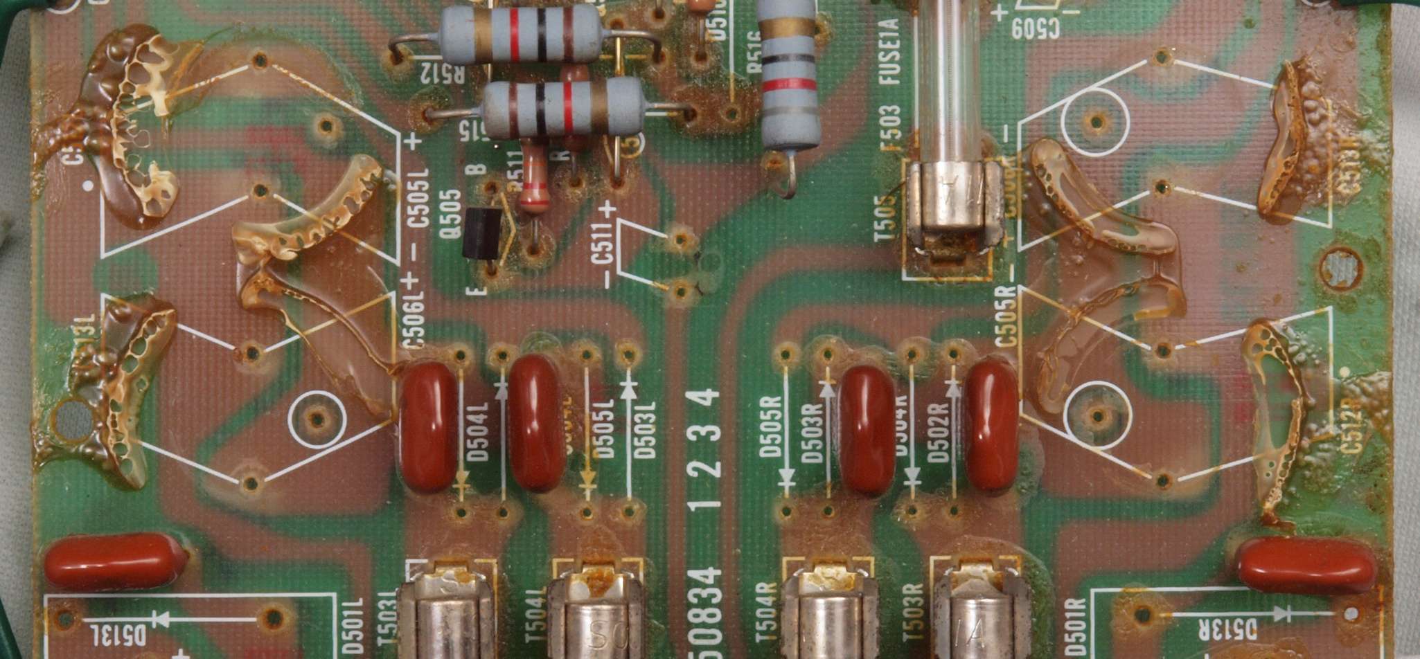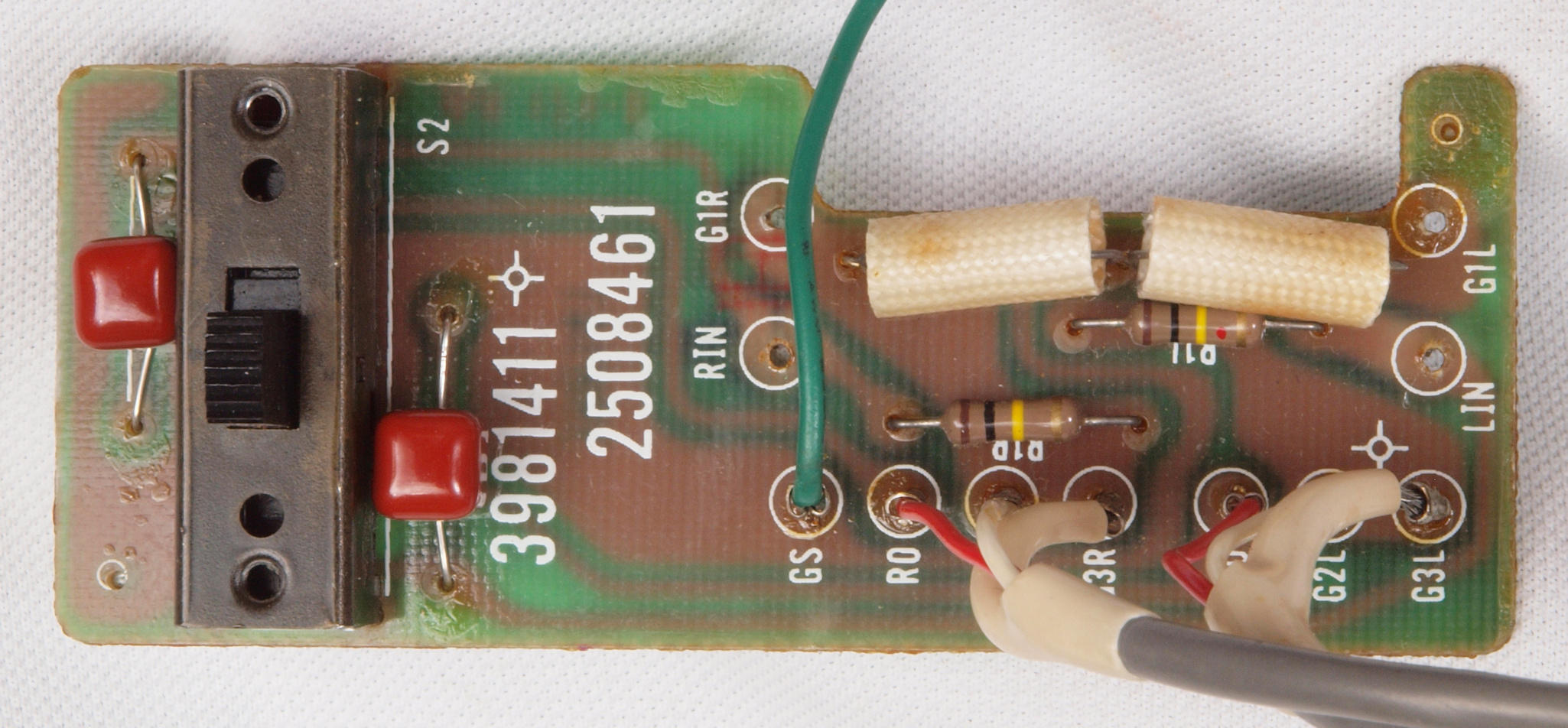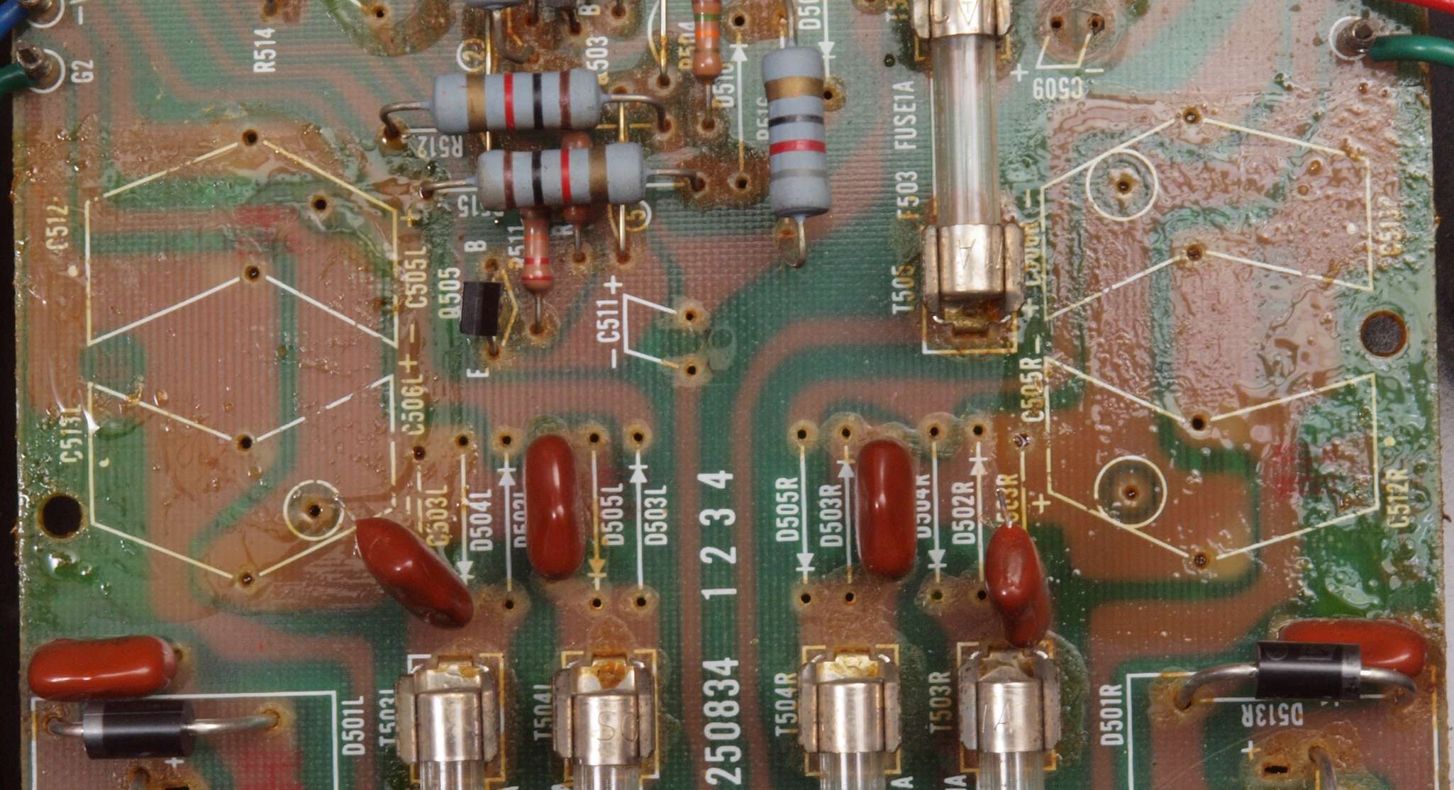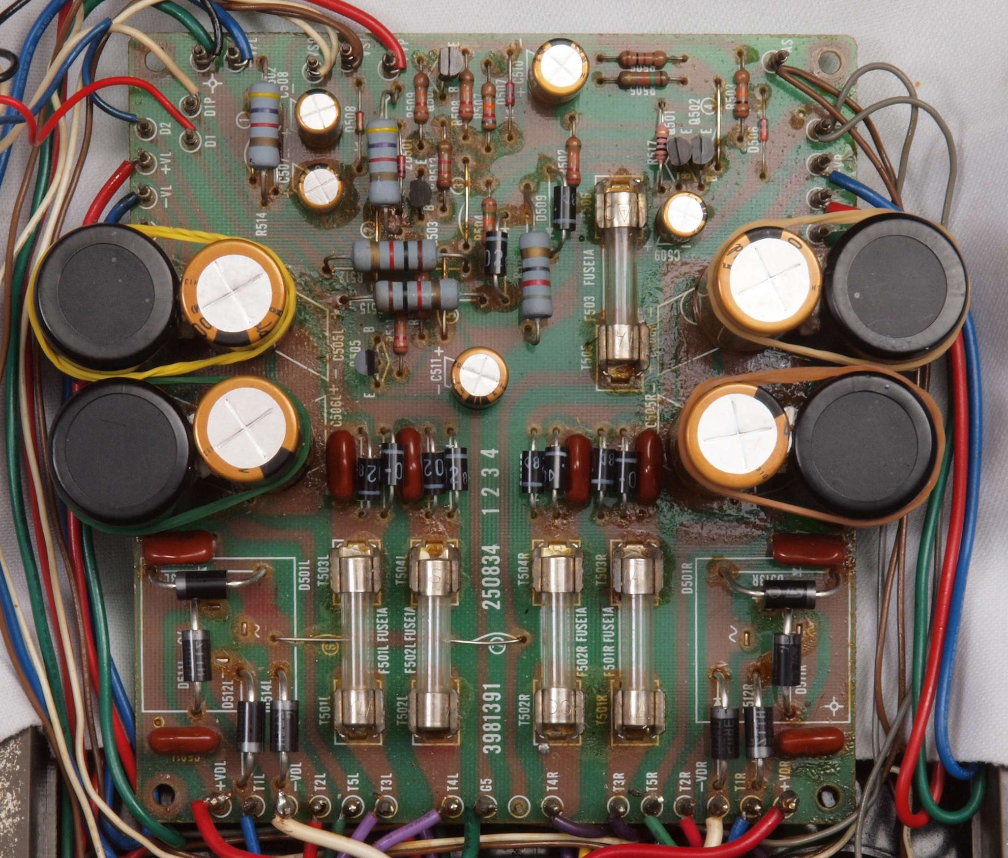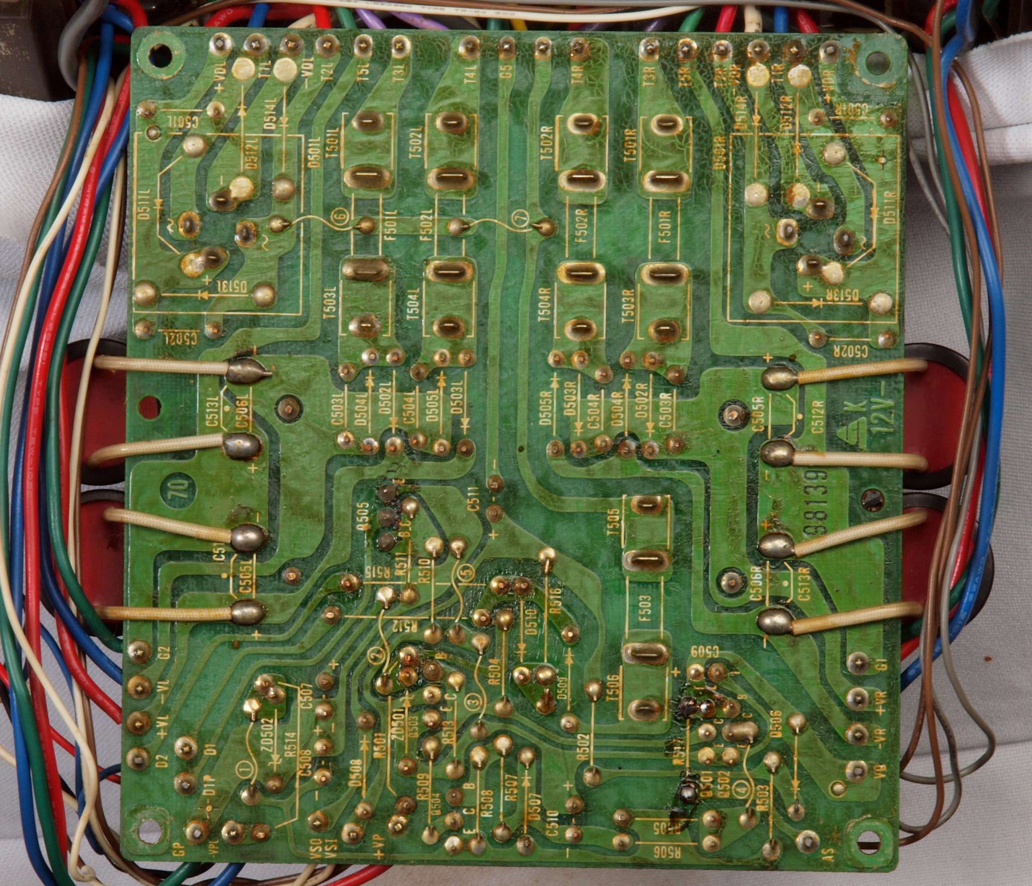 C11. 修理前 R側ドライブ基板。 入手難のヒューズ入り抵抗が全て普通の抵抗に交換されている。