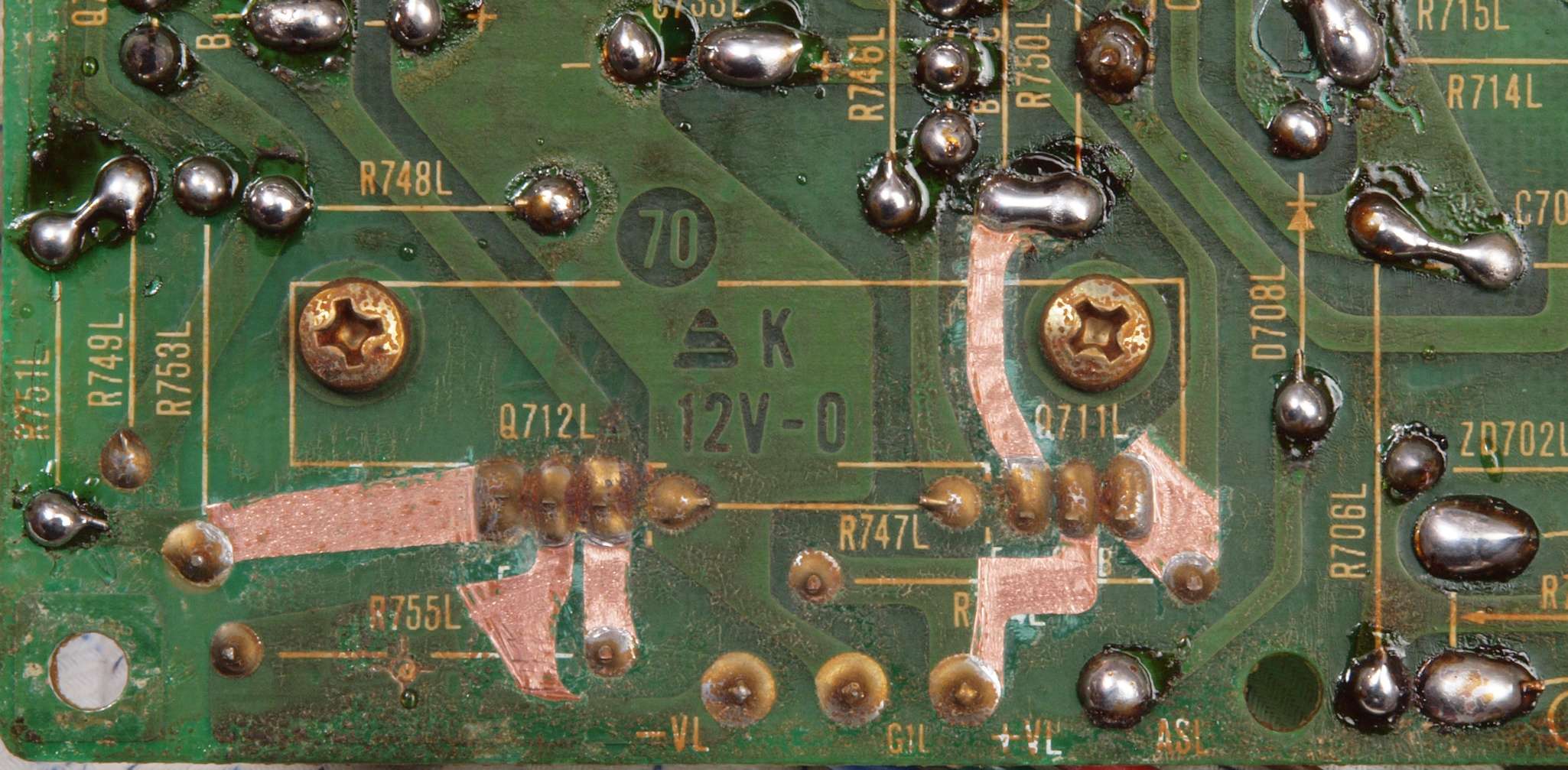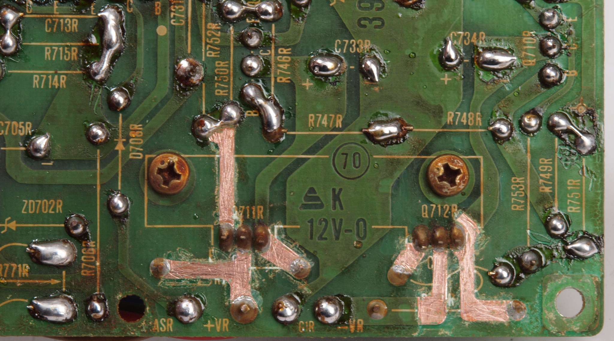 C14. 修理中 R側ドライブ基板裏 定電圧TR(トランジスター)の足の銅箔を広げる。