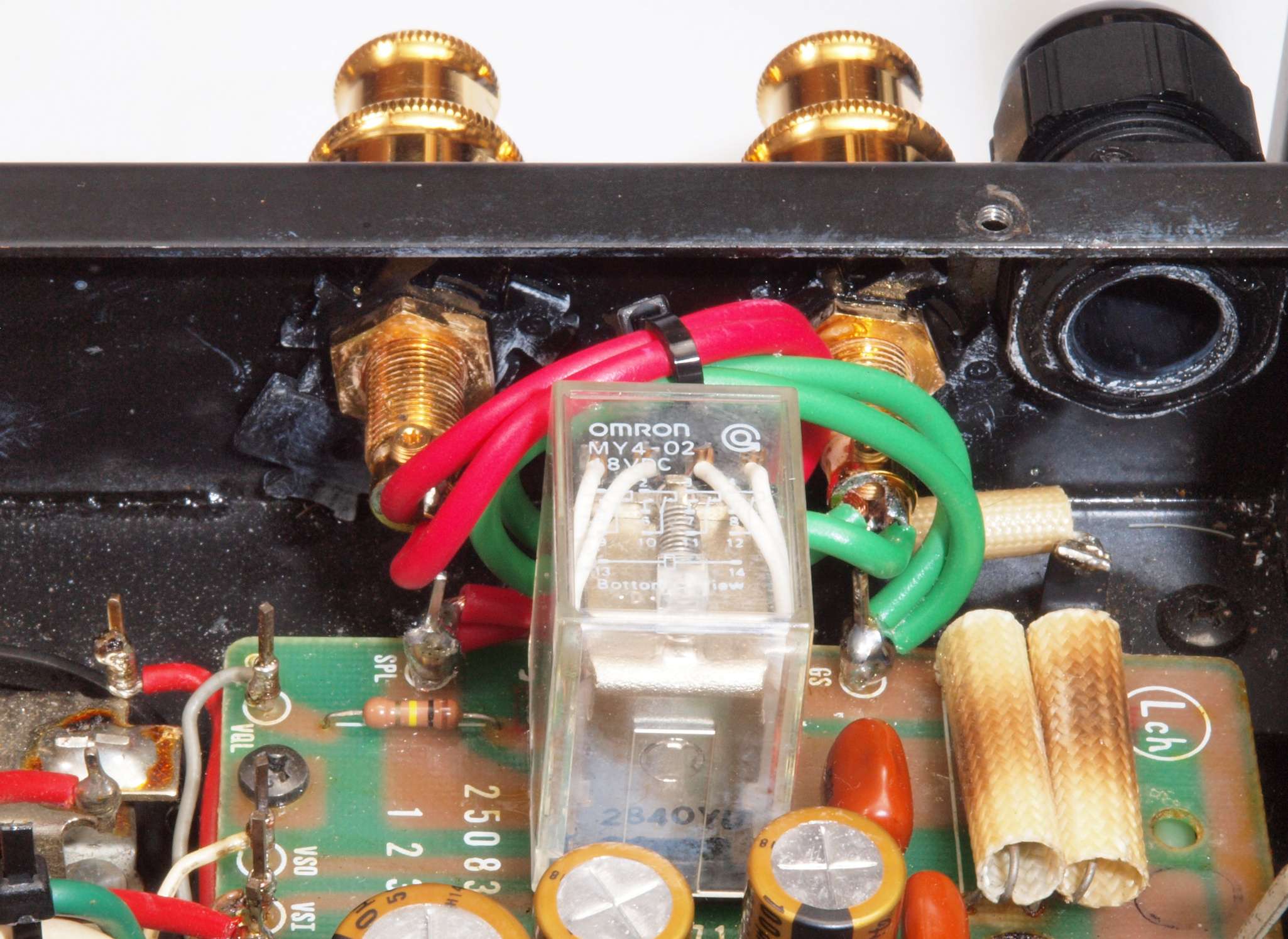 初段FET(電界効果トランジスター)、バランス・バイアス調整用半固定VR3個、SP接続リレー交換