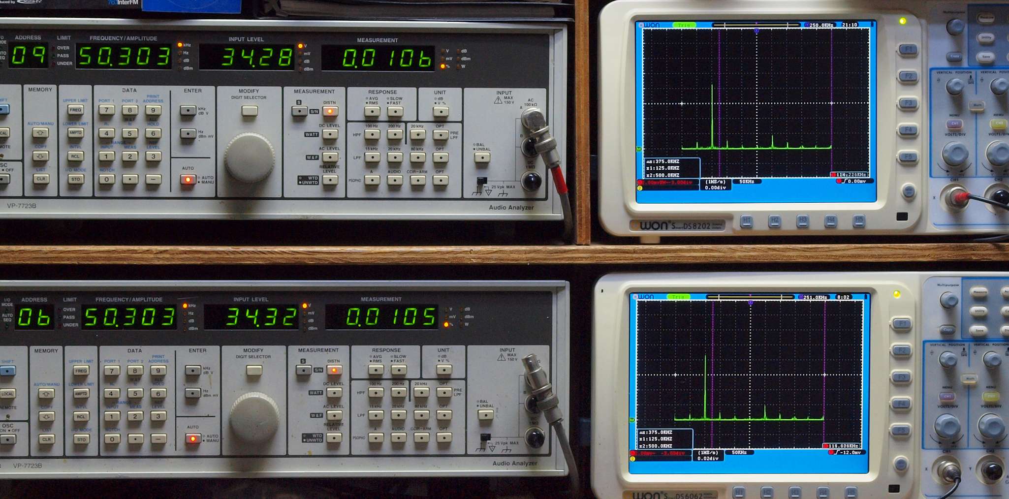 よって、ダイアル設定出力レベルより低なります。測定機器の仕様や整備の様子はこちら、「VP−7723B」「VP−7201A」。 FFT画面の見方はこちら。
