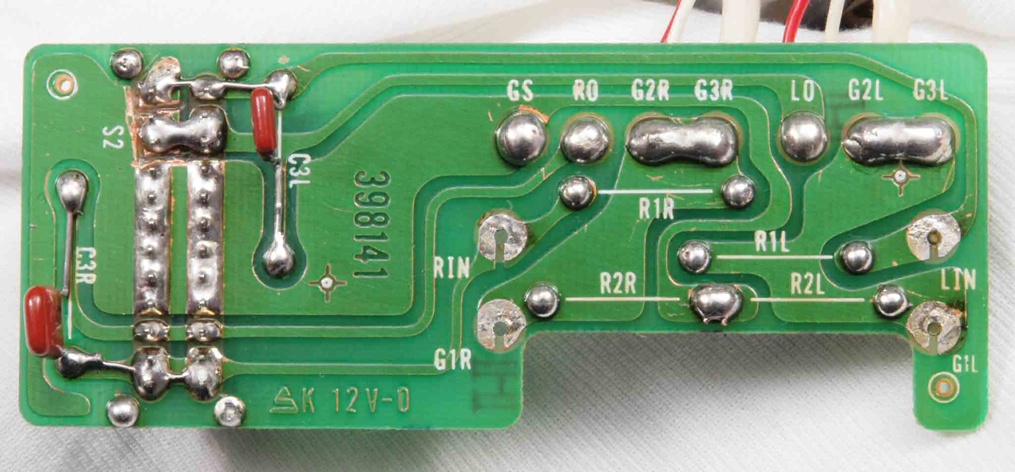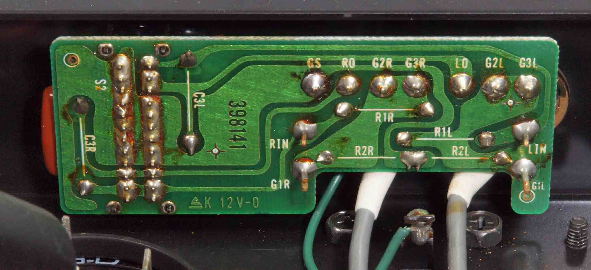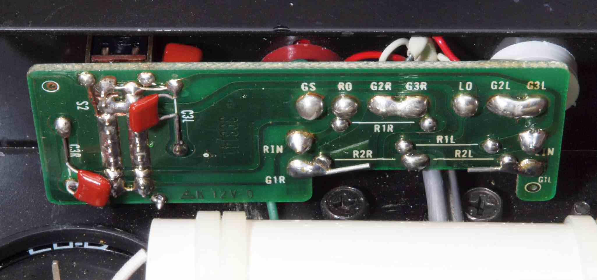 C75. 修理(半田補正)後 入力RCA端子基板裏  半田を全部やり直す。 フイルムコンデンサー2個増設。