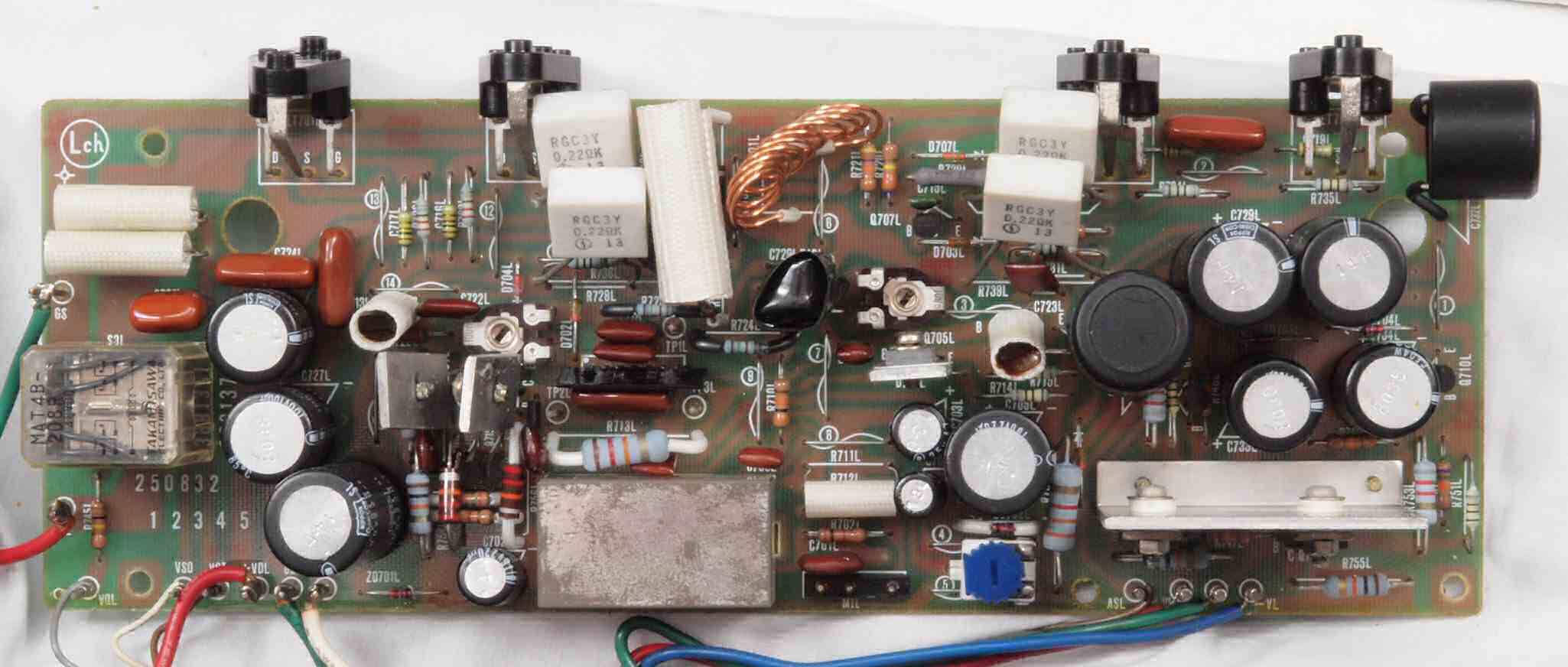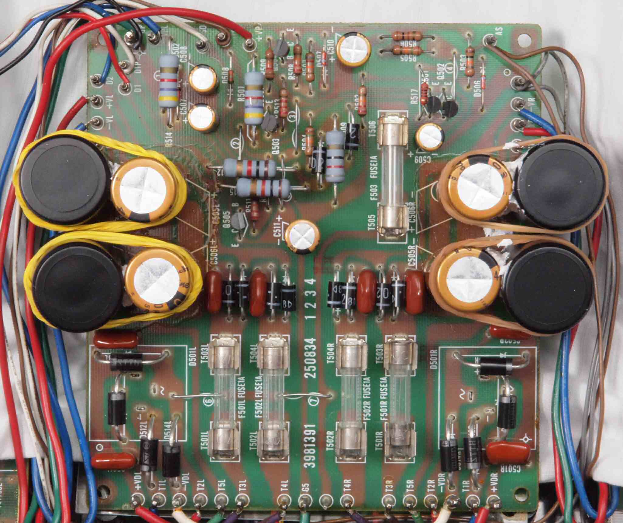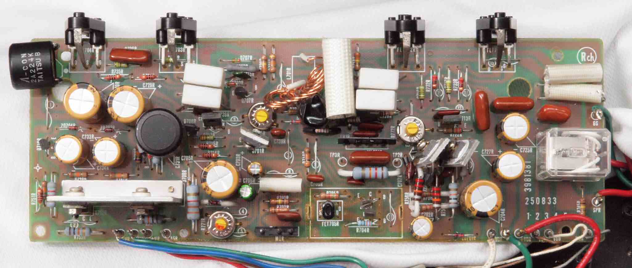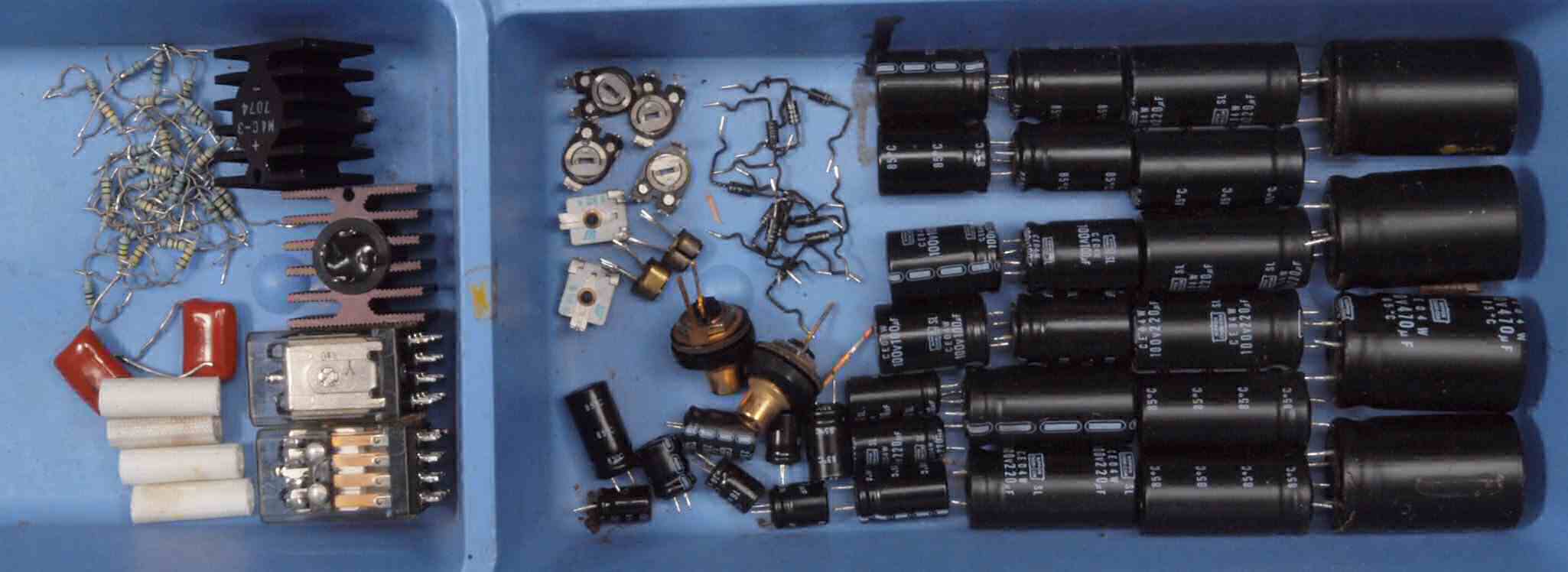 ヒューズ入り抵抗全部、電解コンデンサー11個、TR(トランジスター)2個交換、モジュール修理交換部品は除く。