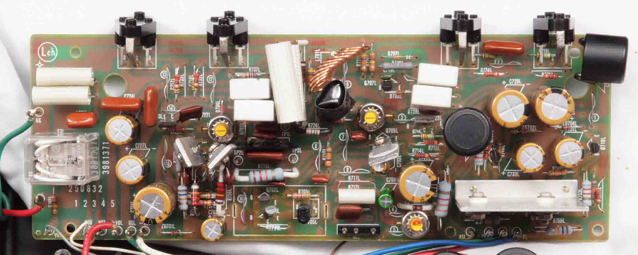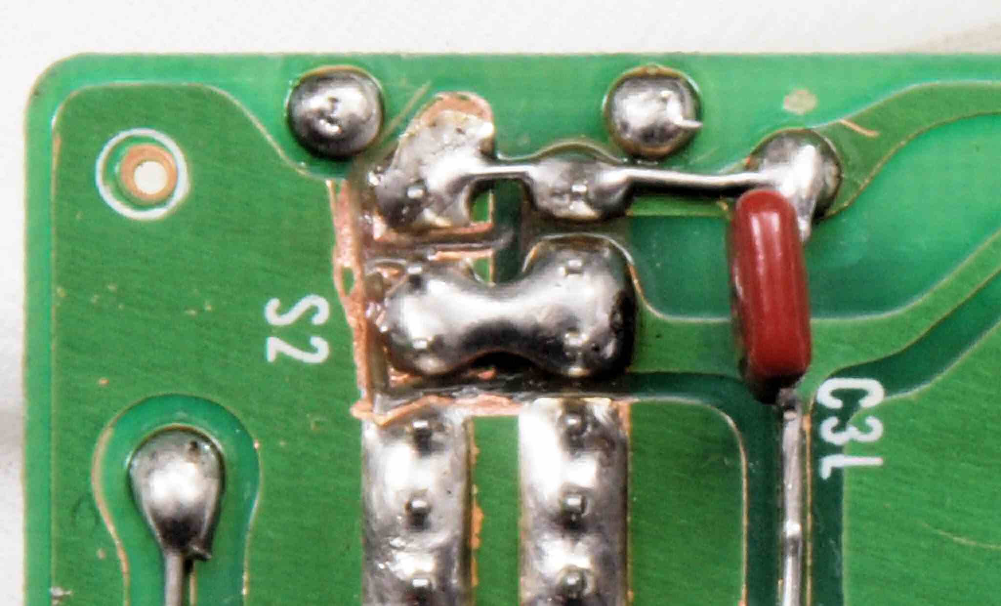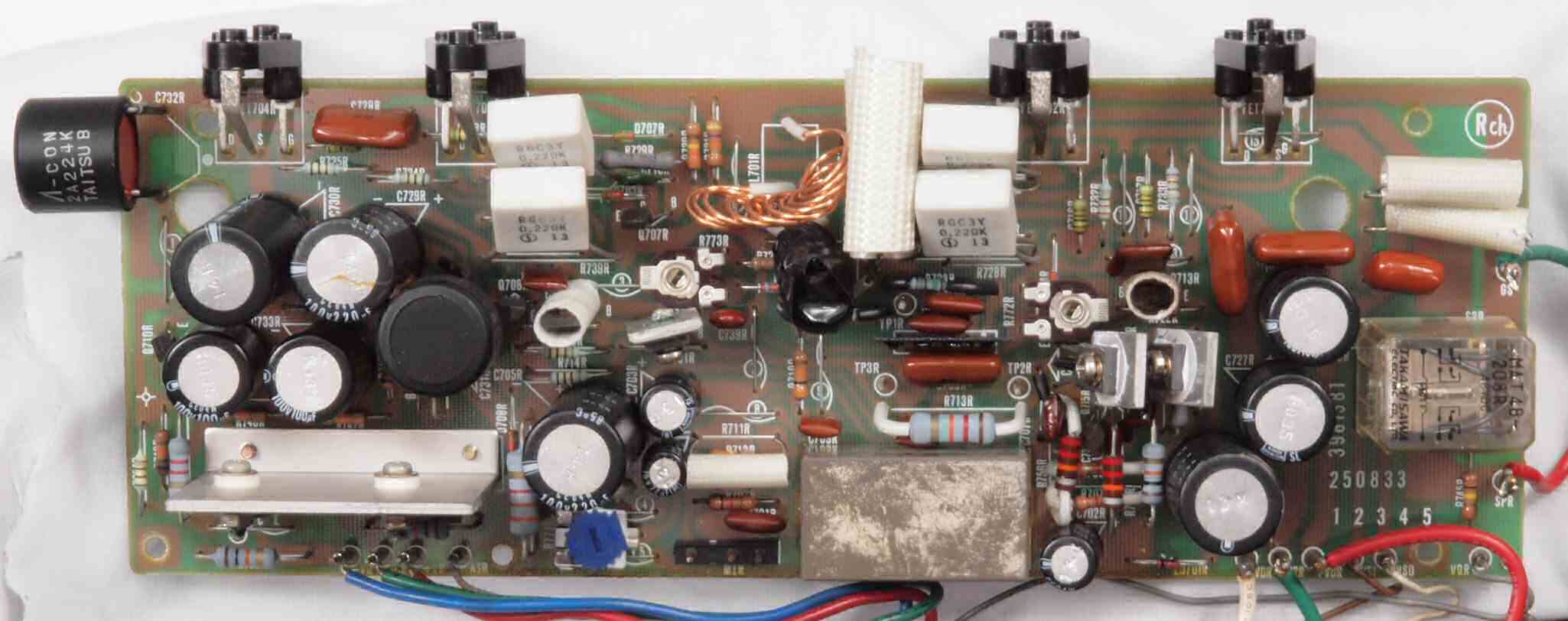 C43. 修理中 RLモジュール裏。 TR(トランジスター)6個交換し、洗浄後軽くラッカーを吹く。