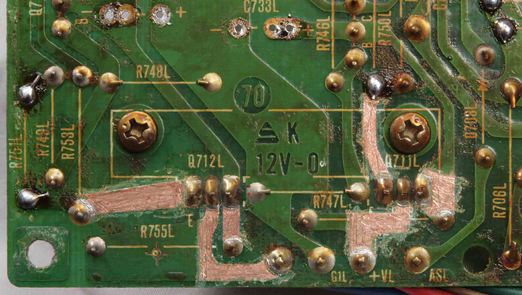 C14. 修理中 R側ドライブ基板裏 定電圧TR(トランジスター)の足の銅箔を広げる。