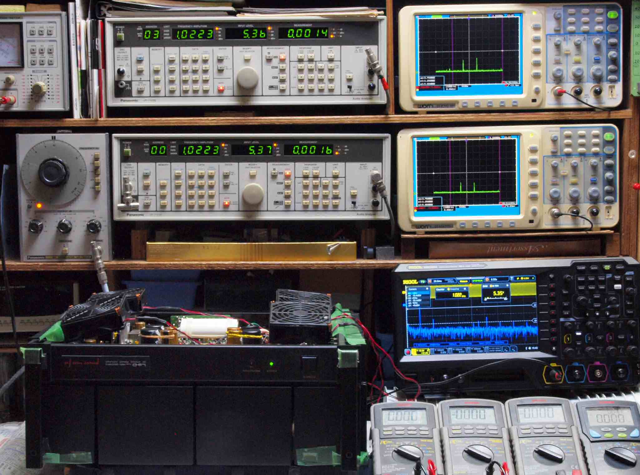 下段左端 オーディオ発振器 VP−7201A より50Hz〜100kHzの信号を出し(歪み率=約0.003%)、ATT+分配器を通し、AMPに入力。