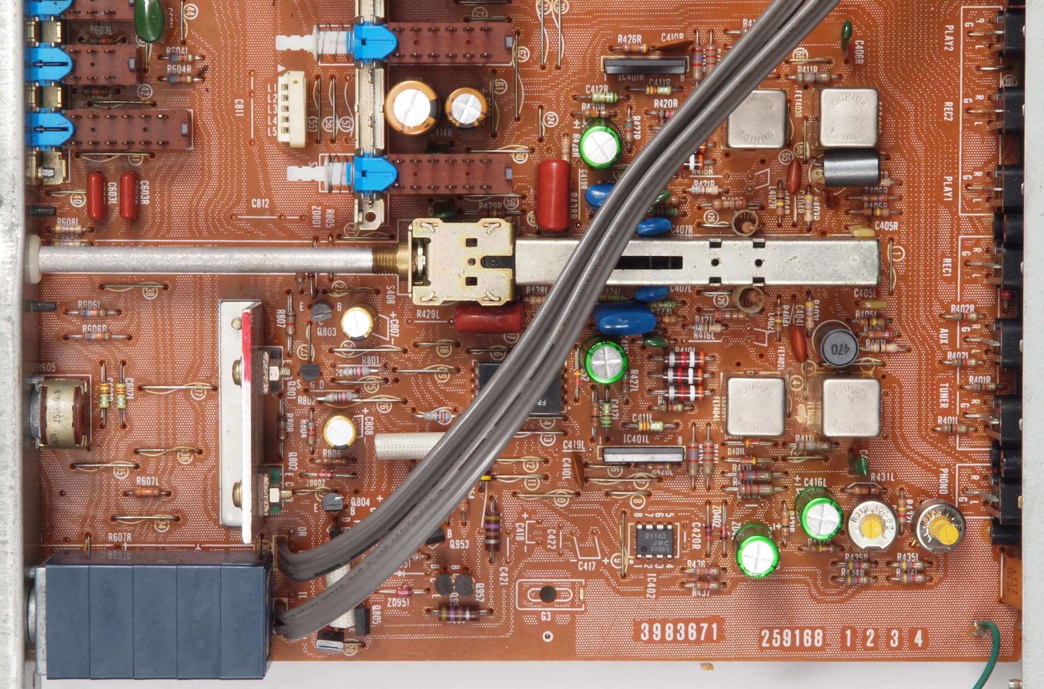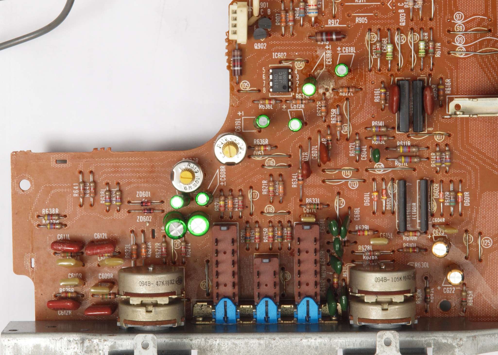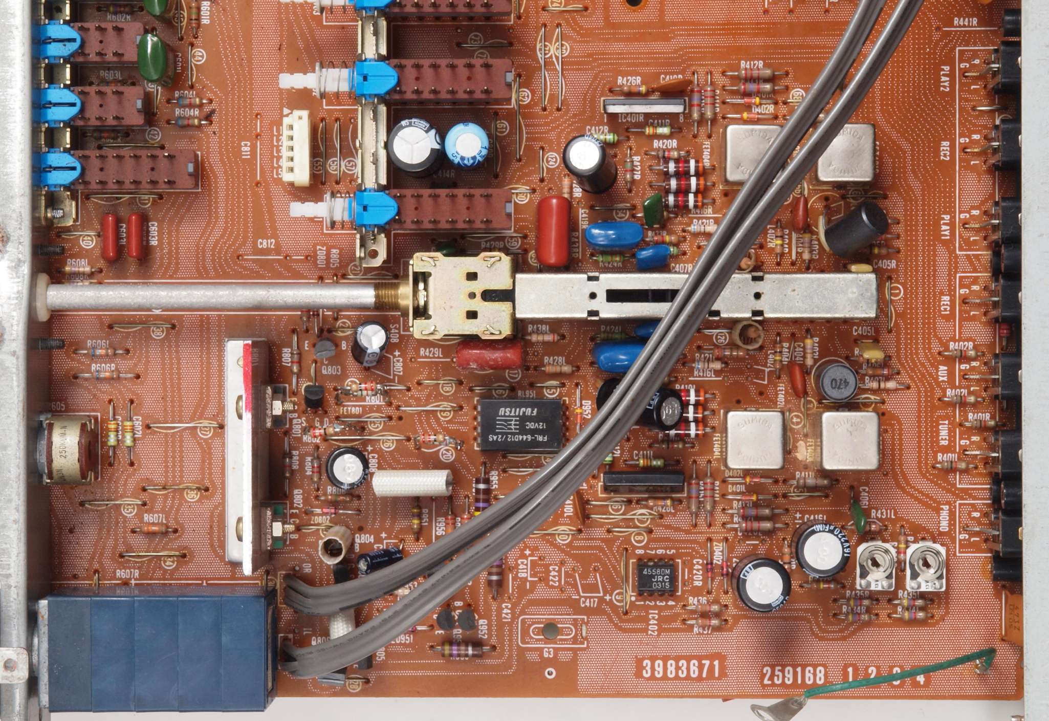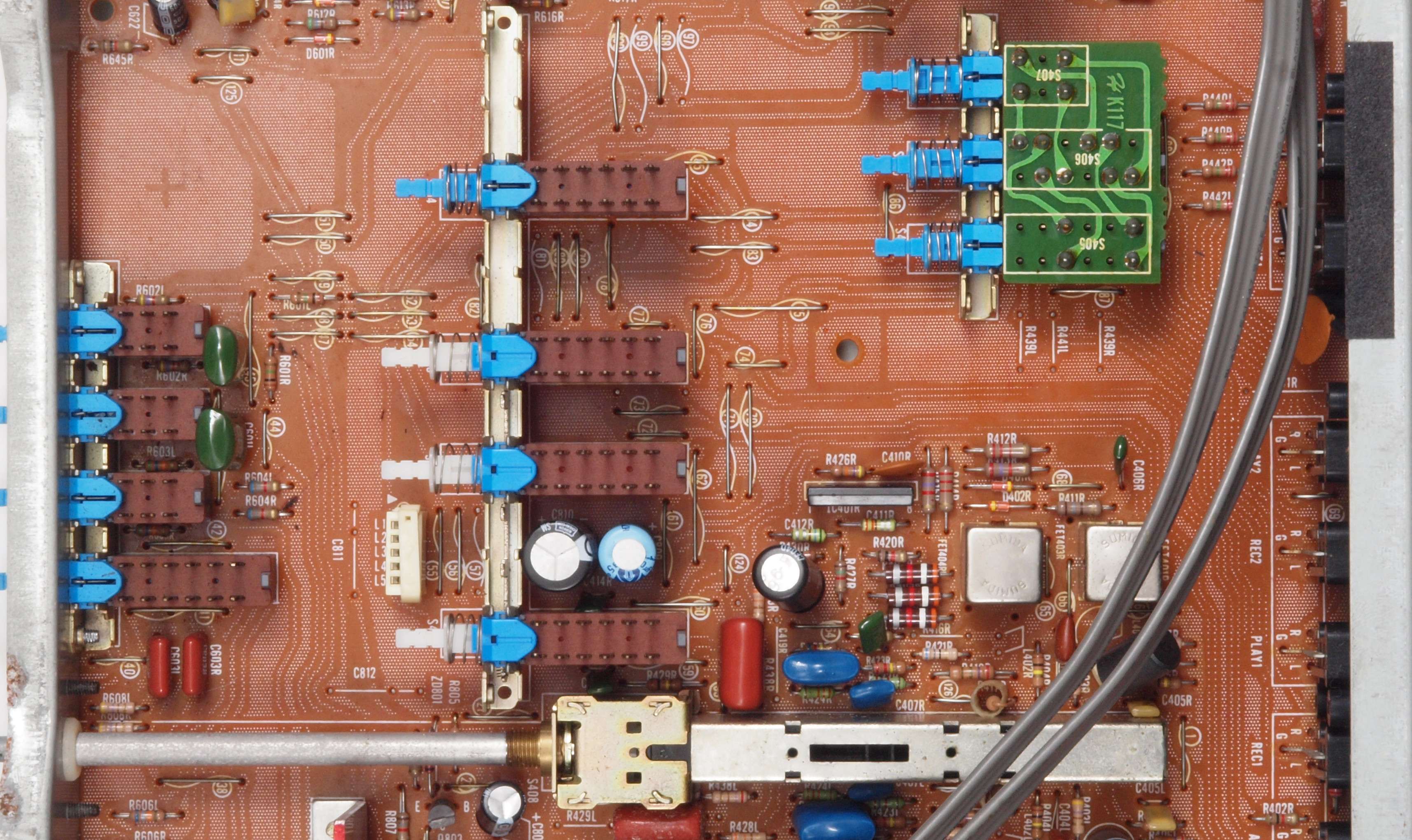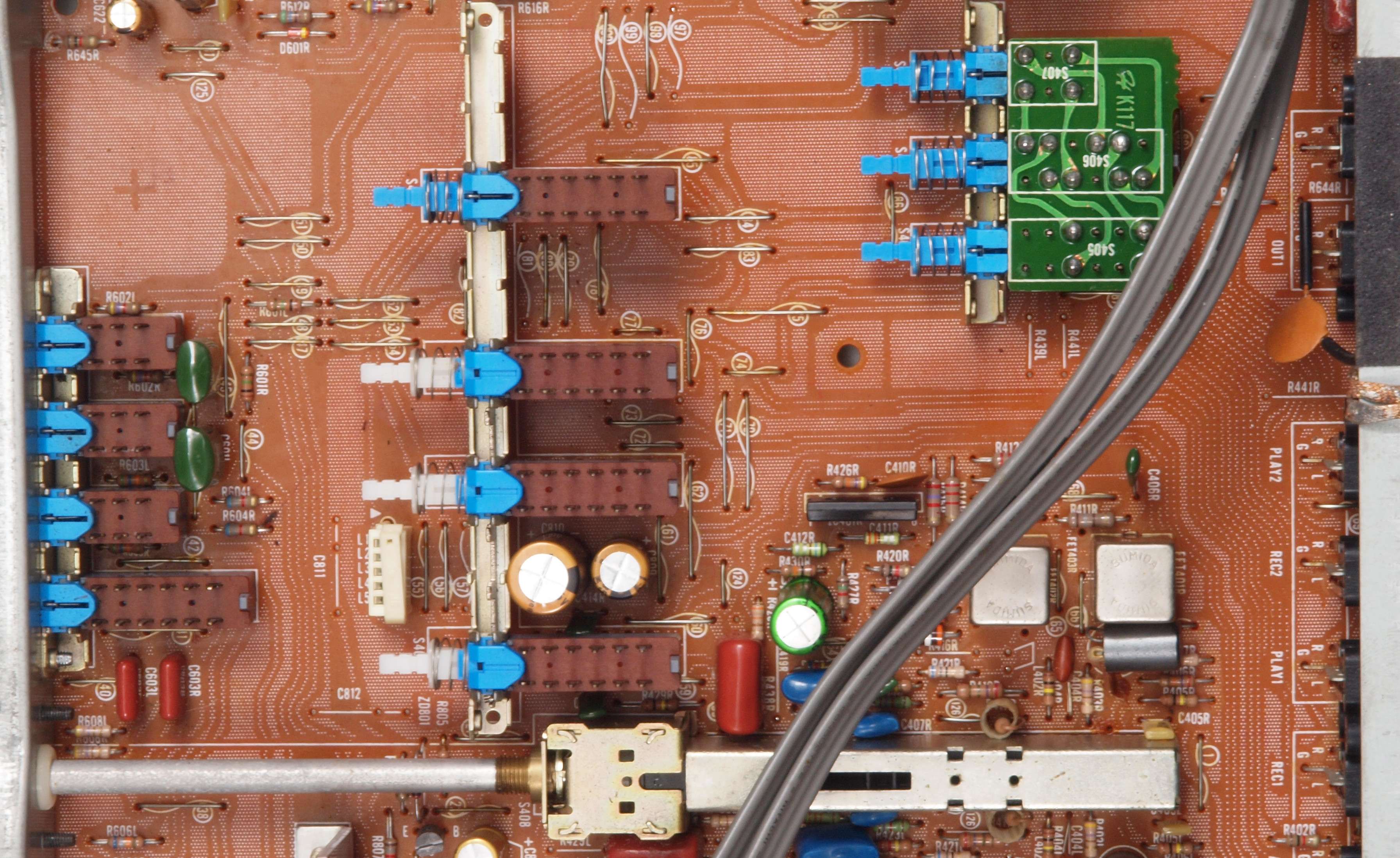 C42. 修理後 トーンコントロール部。 FETモジュール2個、OP−AMP1個、半固定VR2個、電解コンデンサー10個交換。