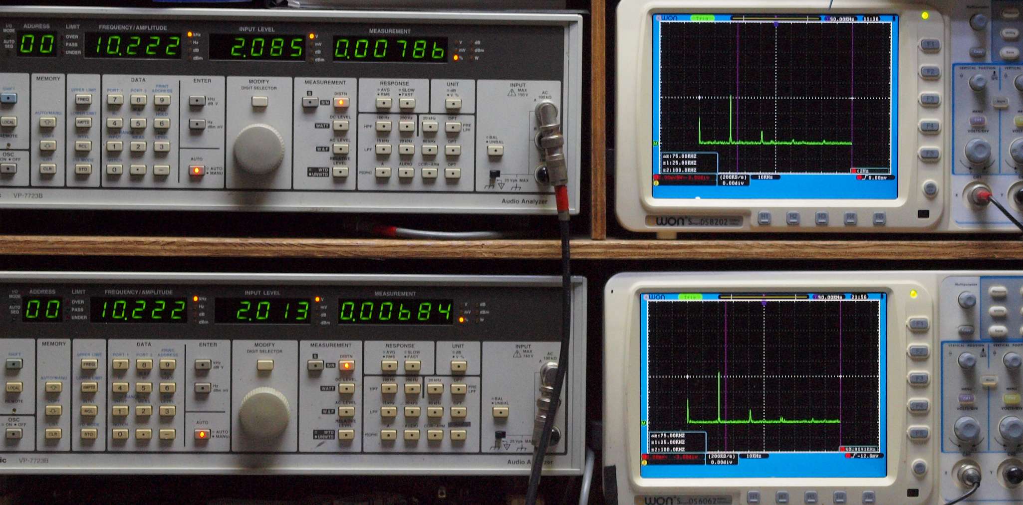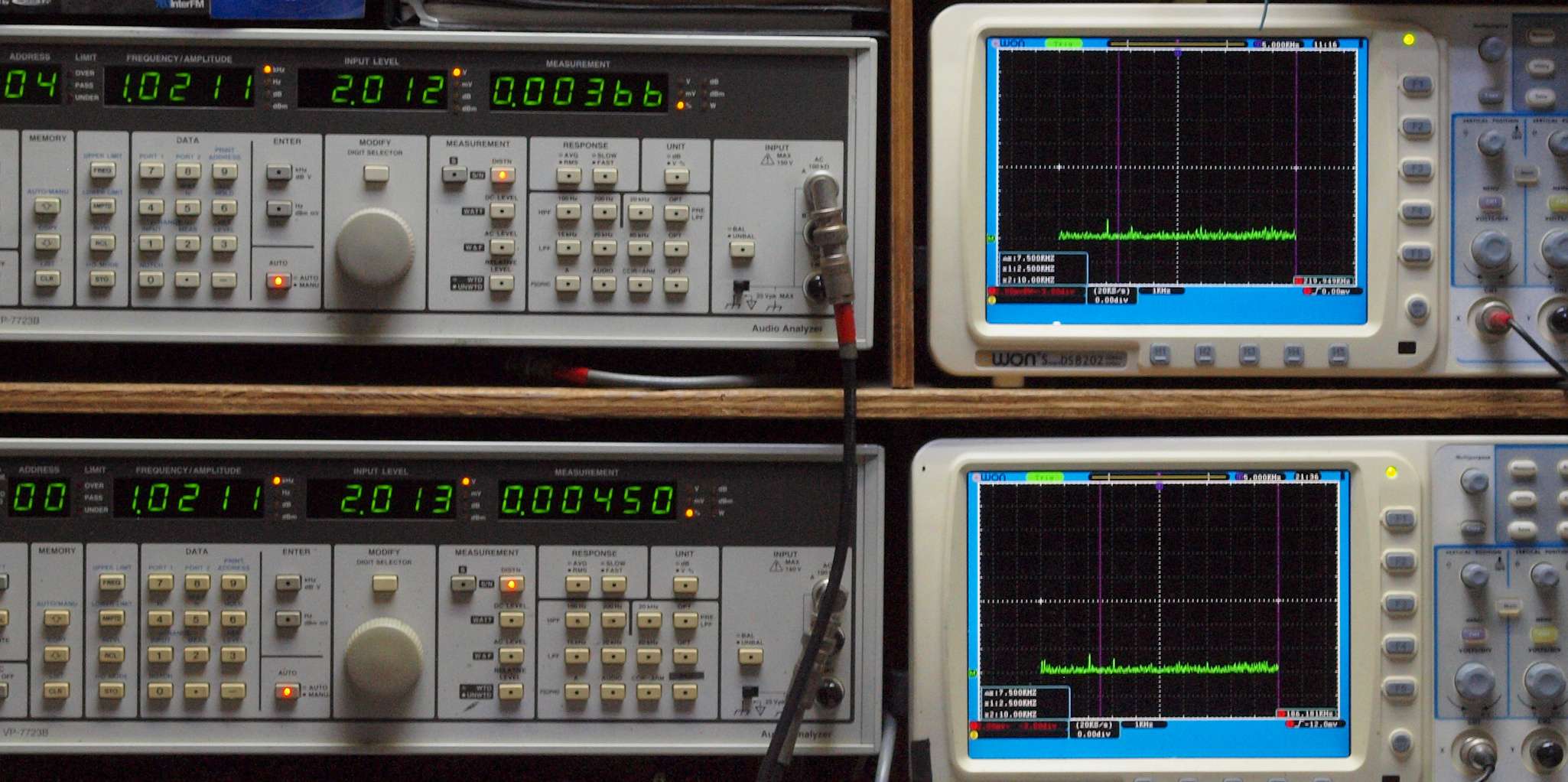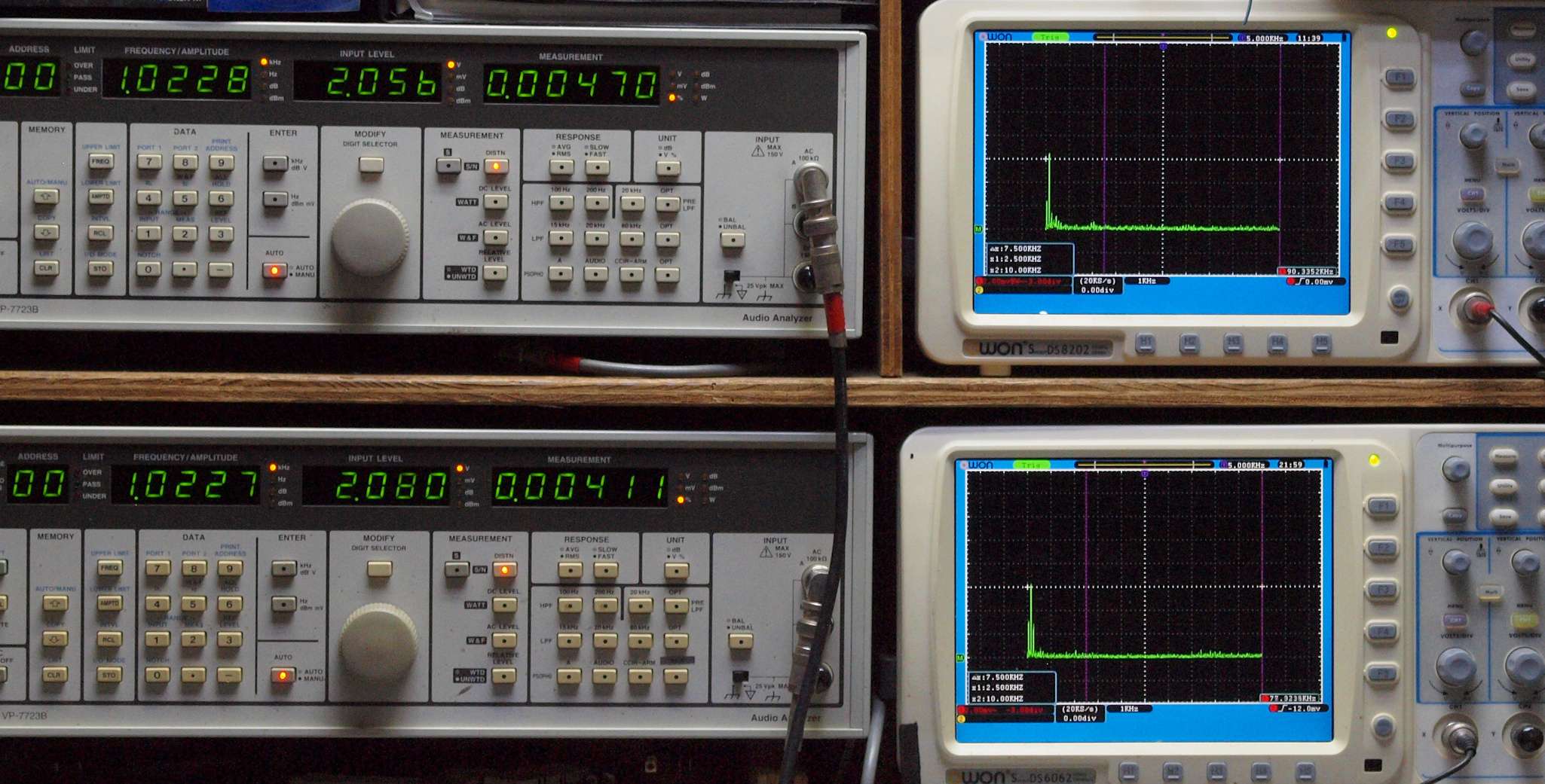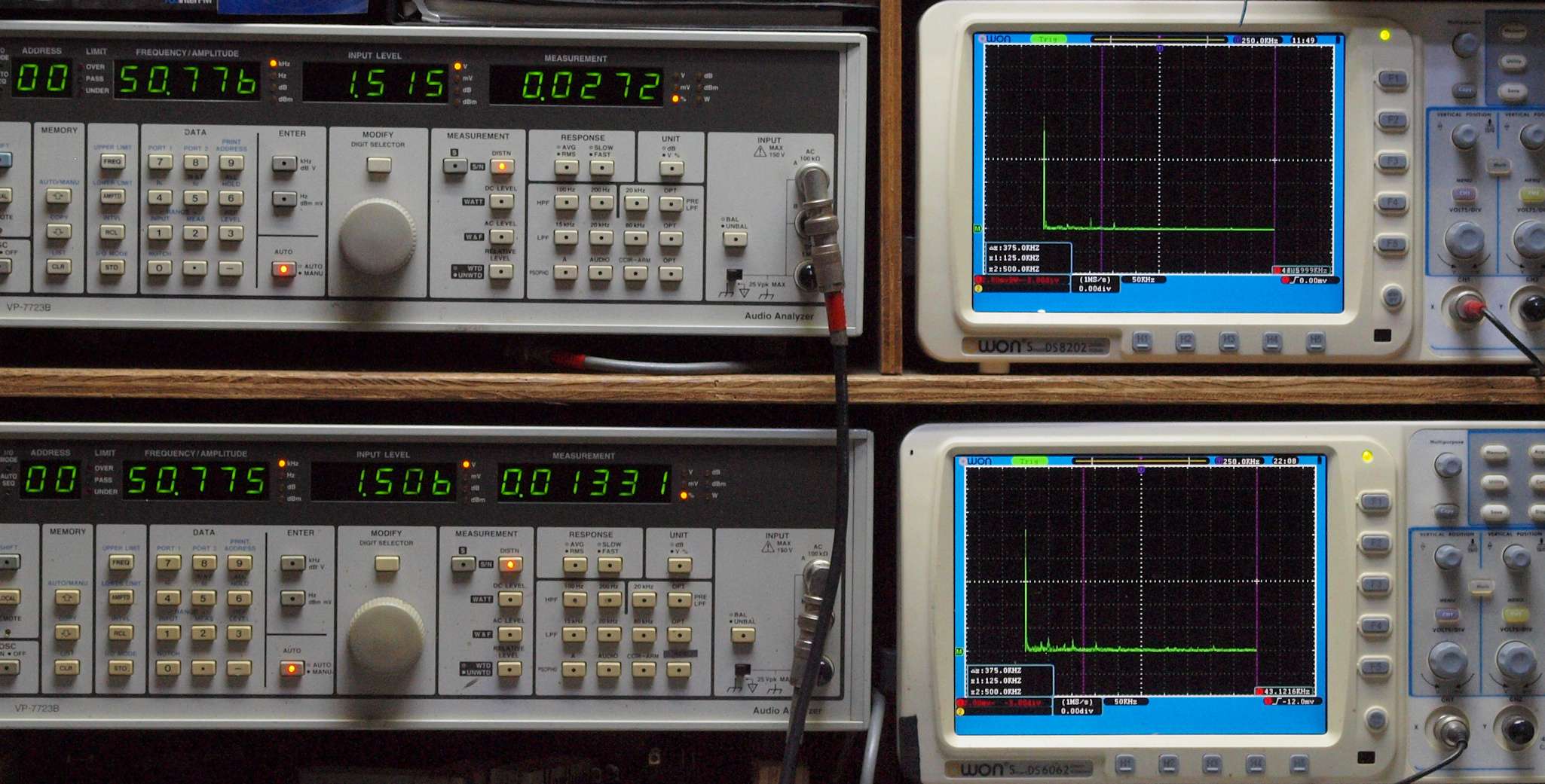 上段右端 VP−7723Bの基本波除去出力を「owon SDS8202(200MHZ)」で「FFT分析」表示。