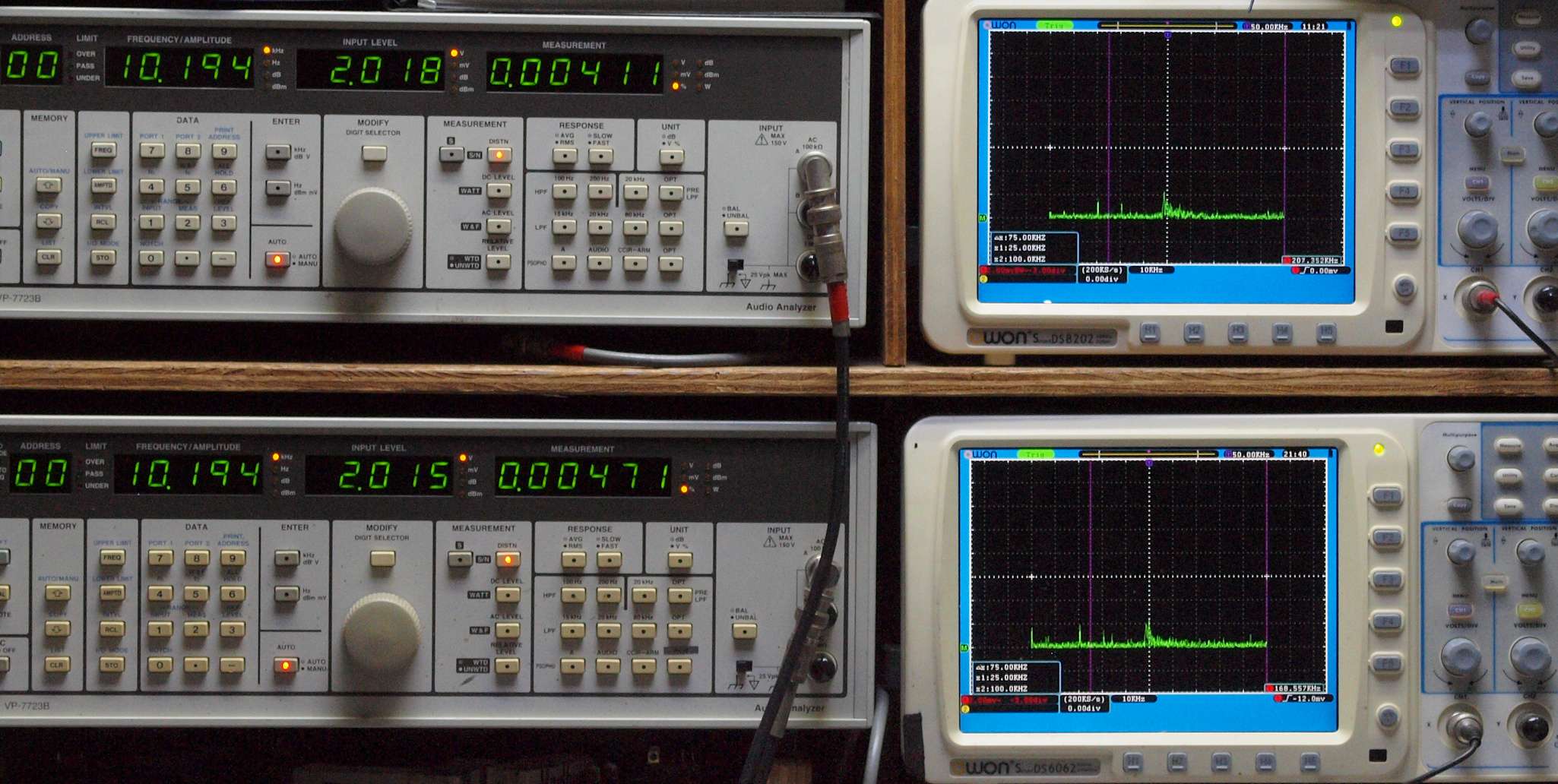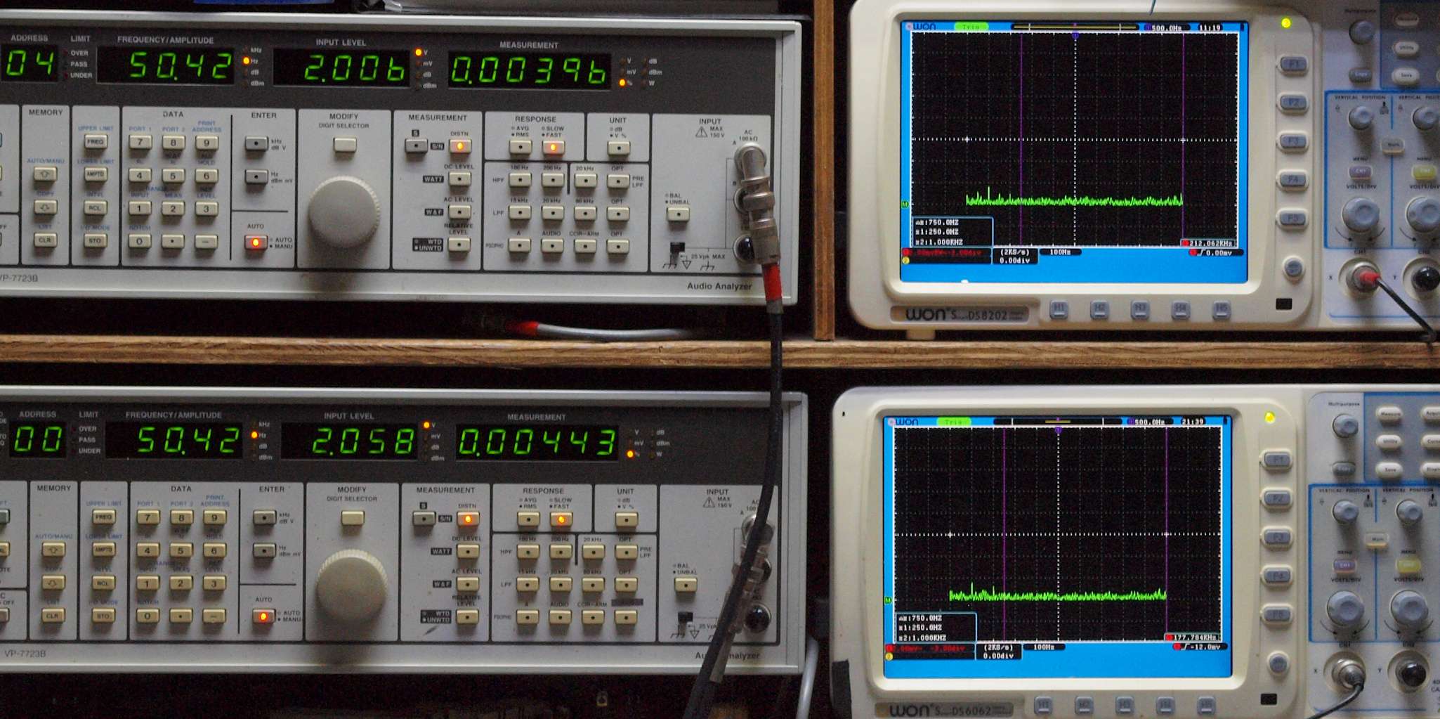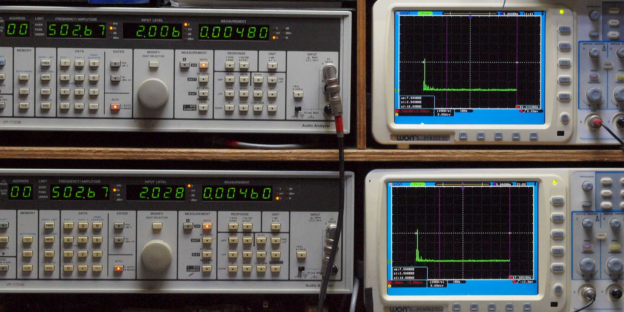 上段右端 VP−7723Bの基本波除去出力を「owon SDS8202(200MHZ)」で「FFT分析」表示。