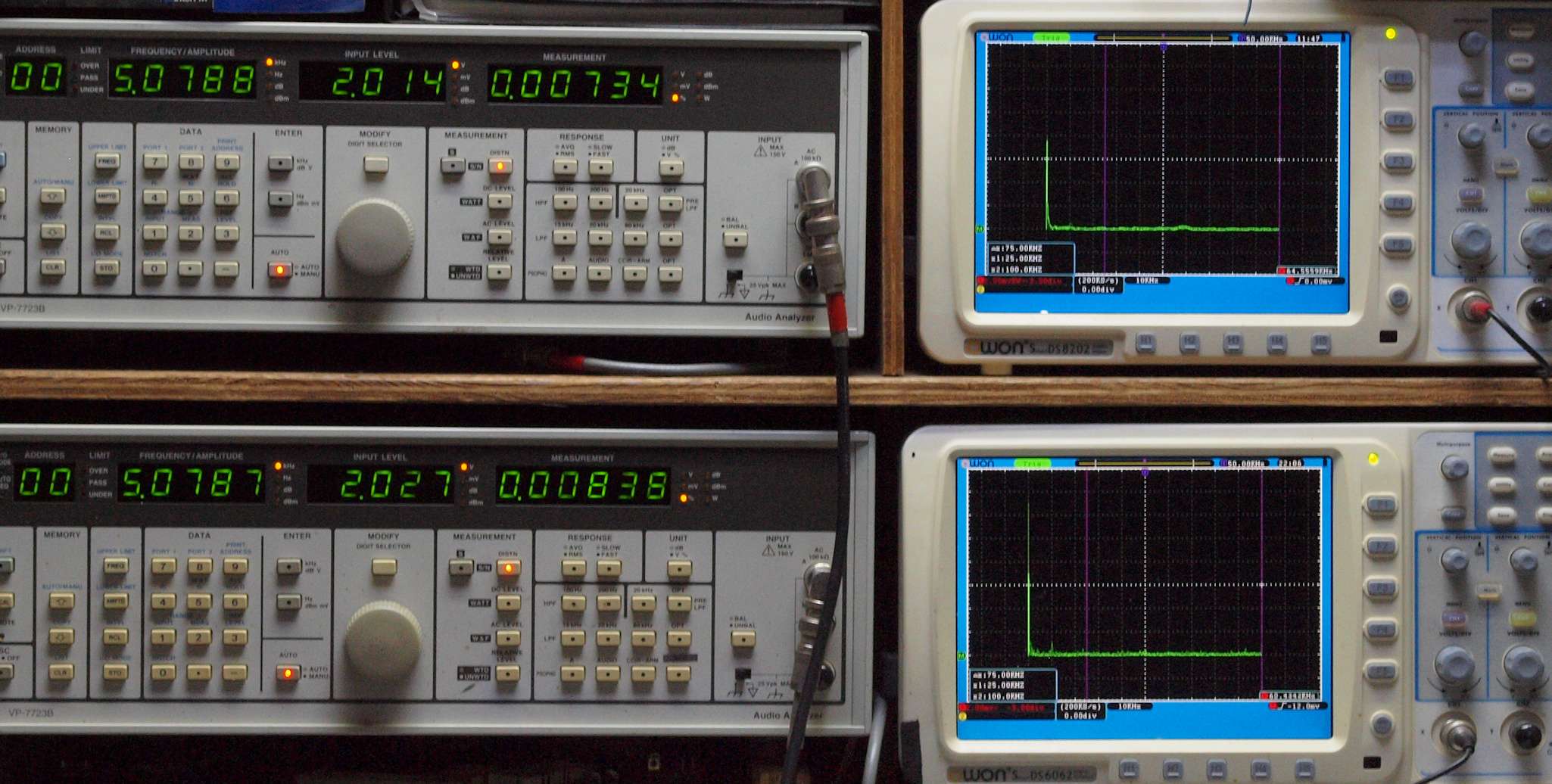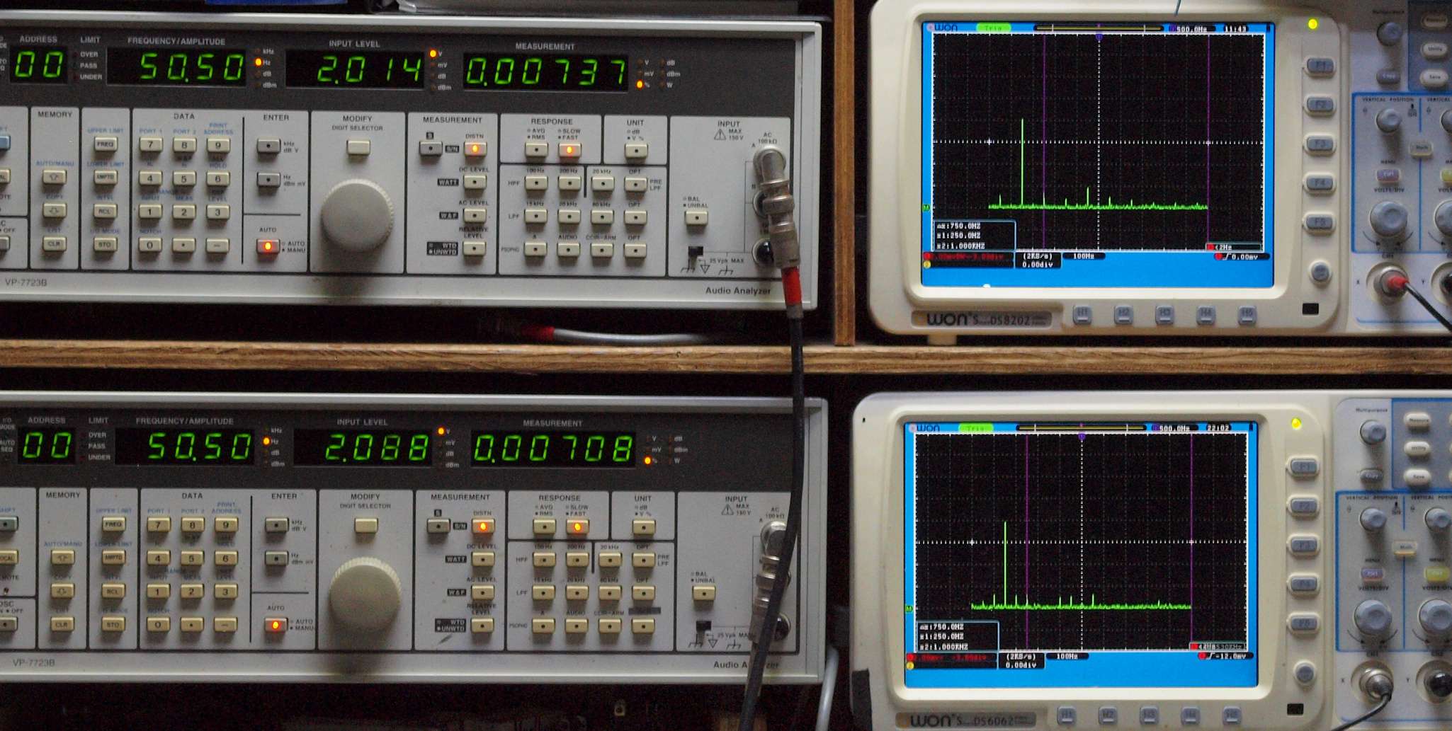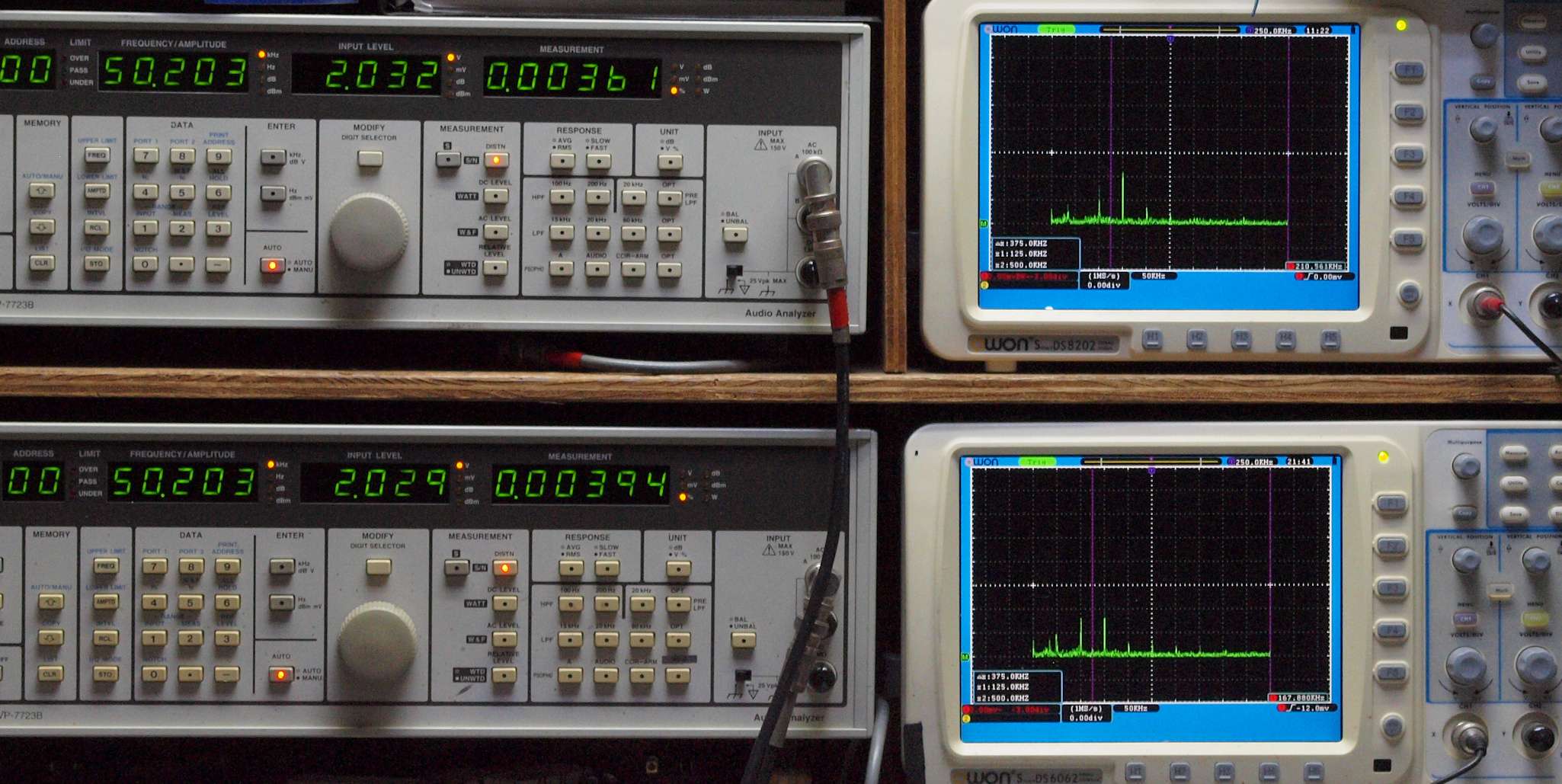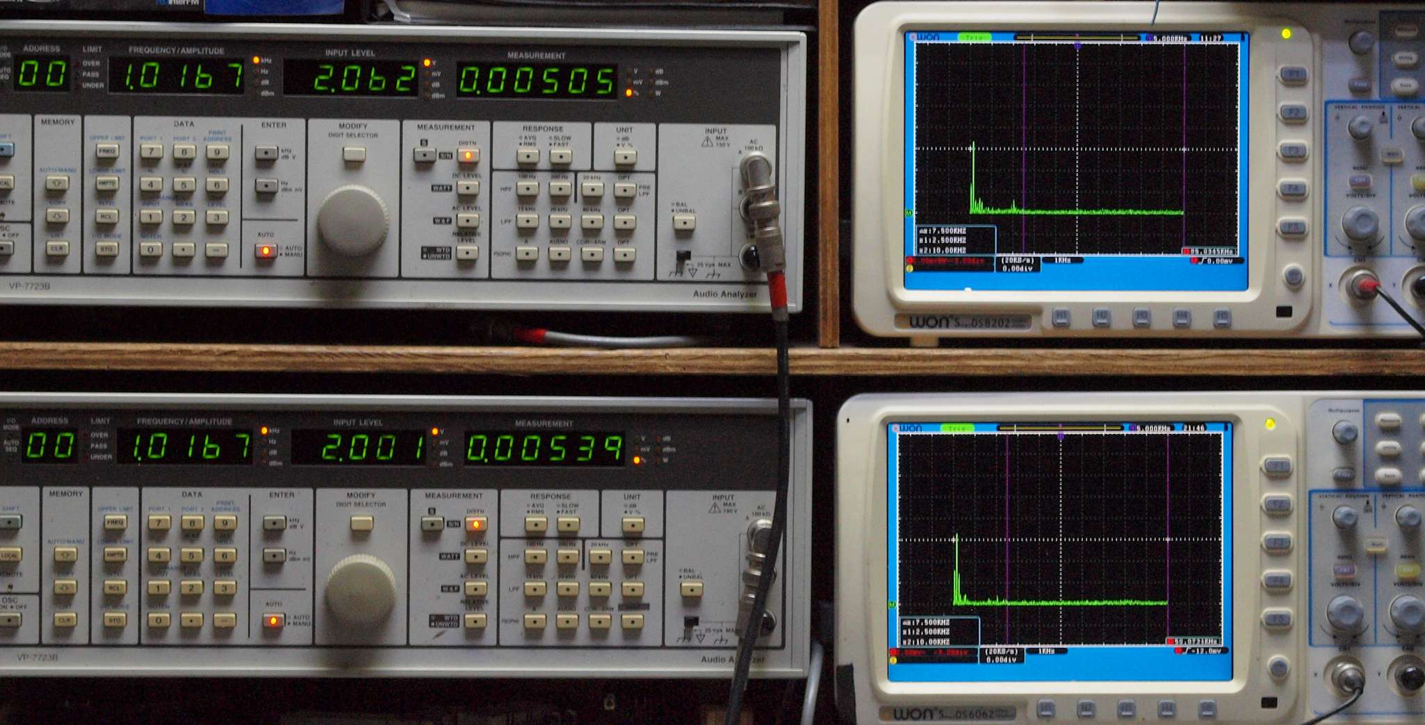 上段右端 VP−7723Bの基本波除去出力を「owon SDS8202(200MHZ)」で「FFT分析」表示。