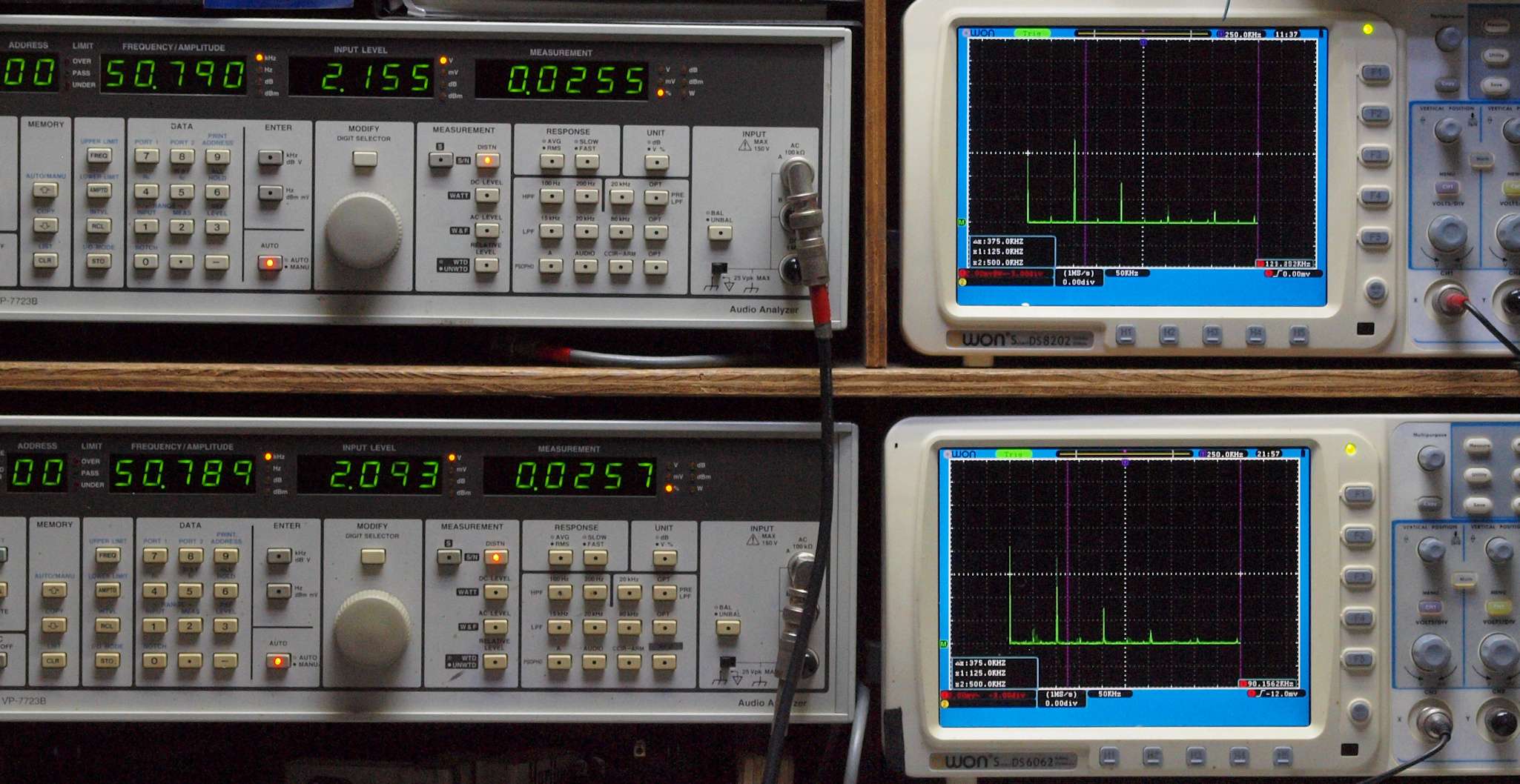 よって、ダイアル設定出力レベルより低くなります。測定機器の仕様や整備の様子はこちら、「VP−7723B」「VP−7201A」。 FFT画面の見方はこちら。