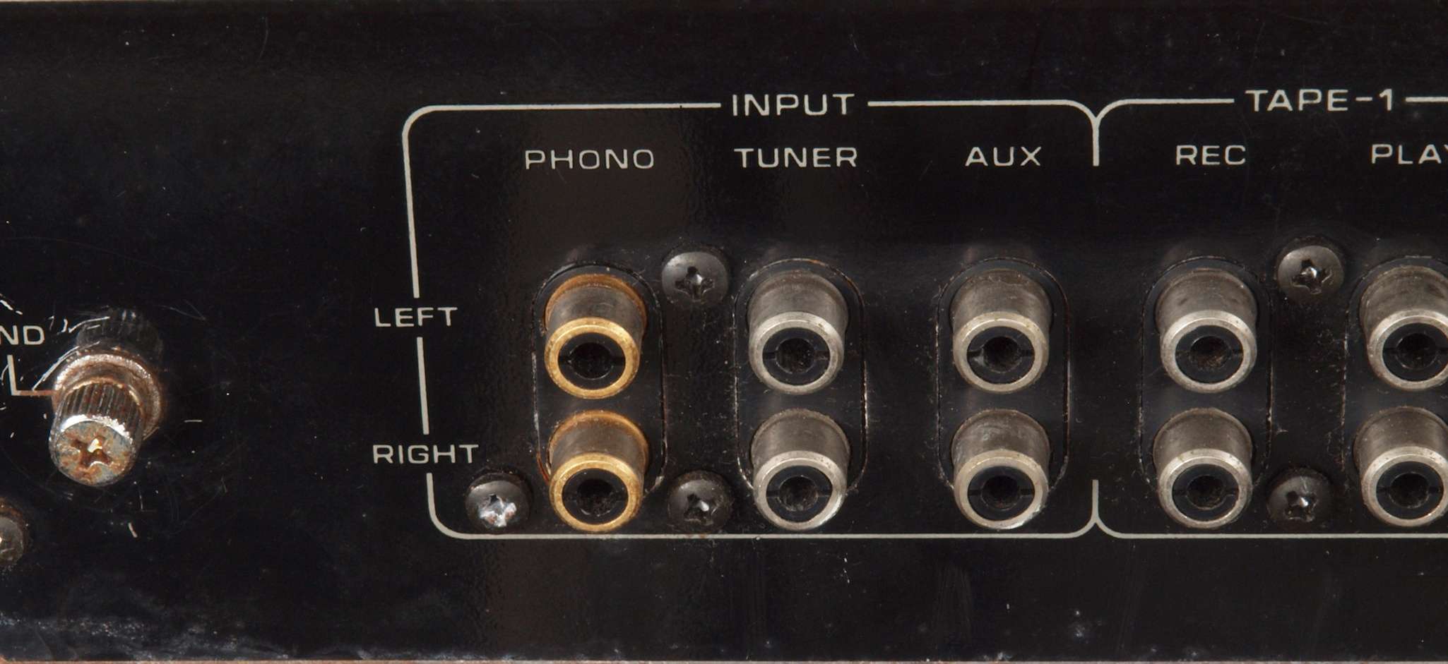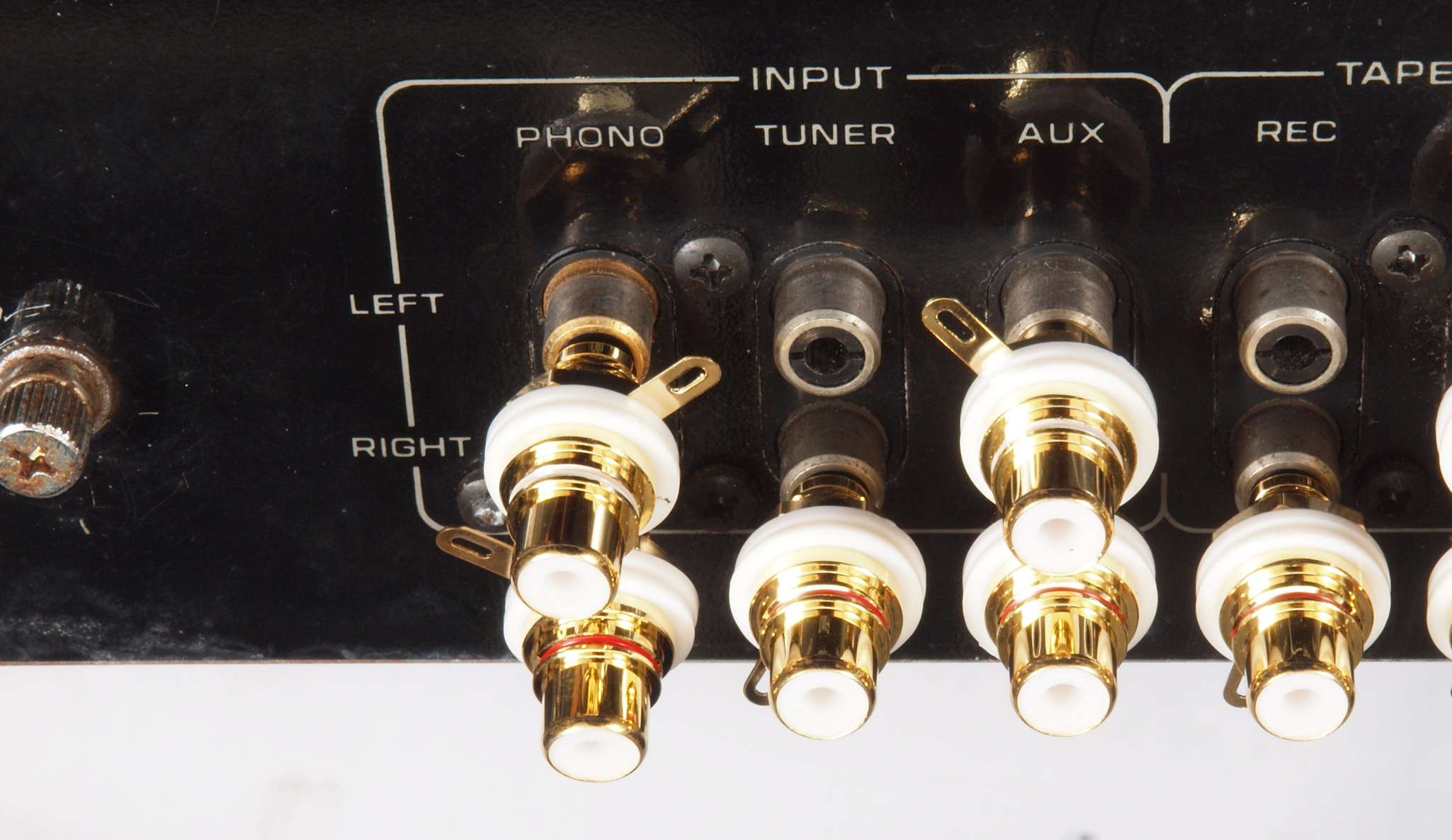 A32. 点検中 入力RCA端子。 テフロン絶縁製に交換可能。 WBT−0201端子への交換は定価で工賃込み。