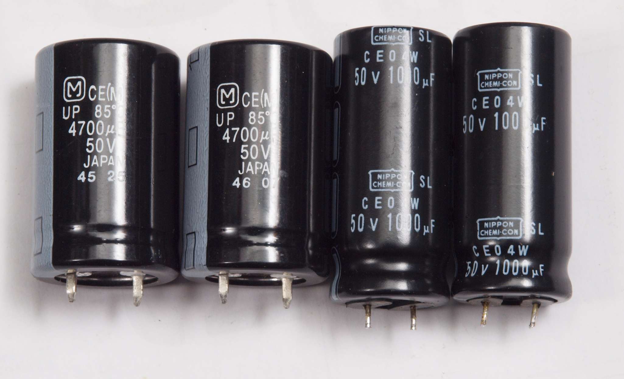 A51. 点検中 電源ブロック電解コンデンサー比較。 交換する左=4700μ/50WV、着いていた右=1000μ/50WV、