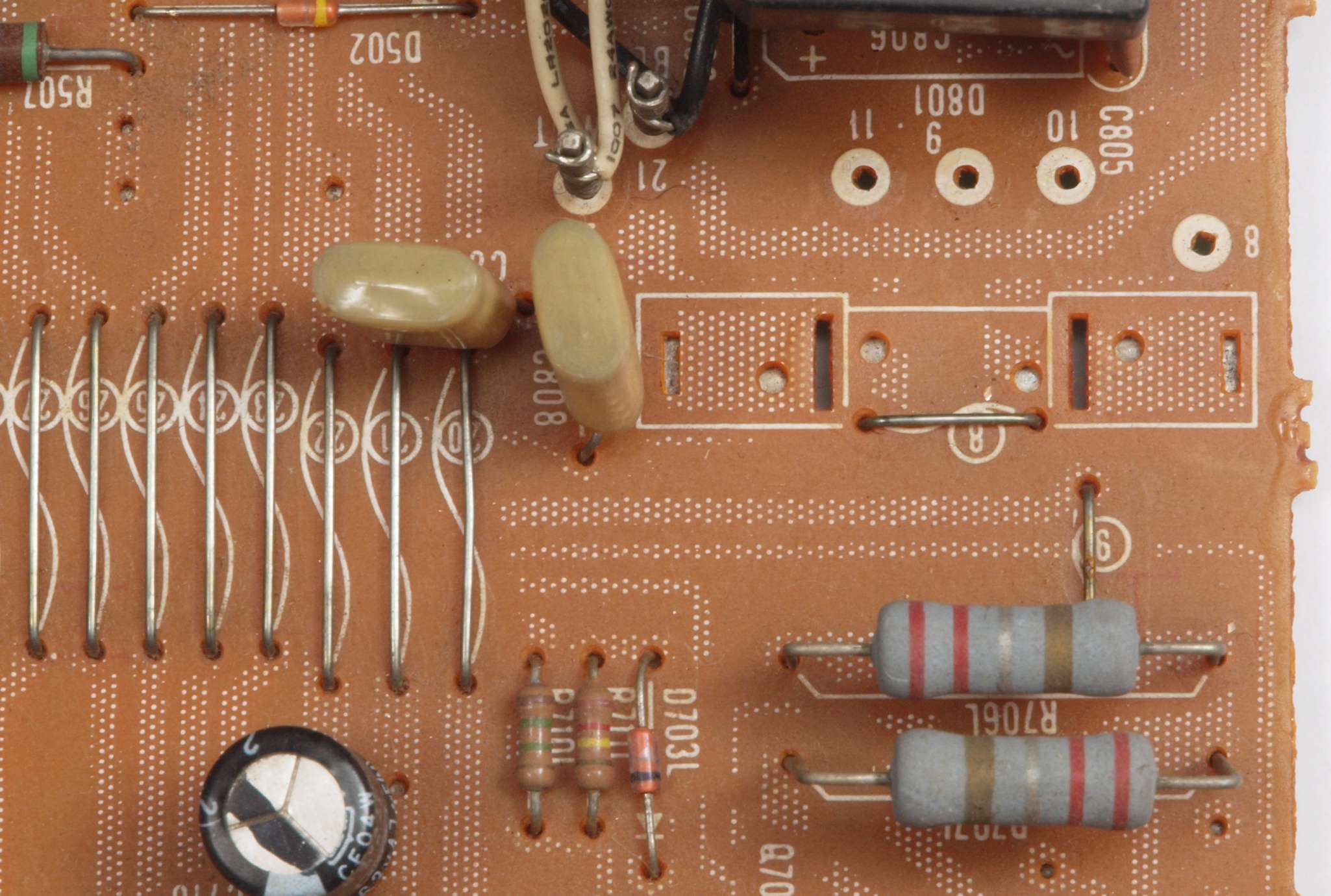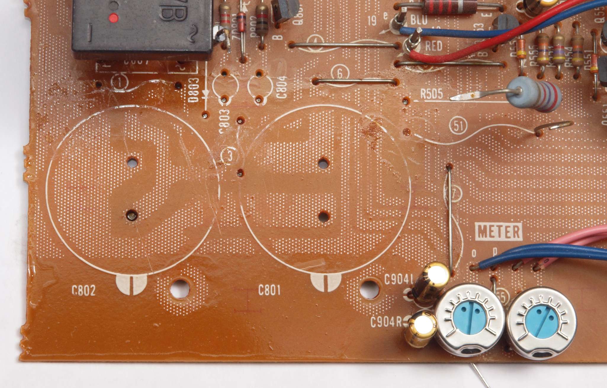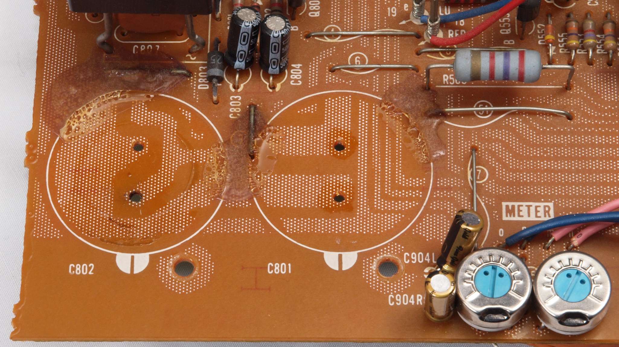 | C12. 修理中 メイン基板。電解コンデンサー固定するトルエン溶媒の接着剤。 | ||||||||||||||||||||||||