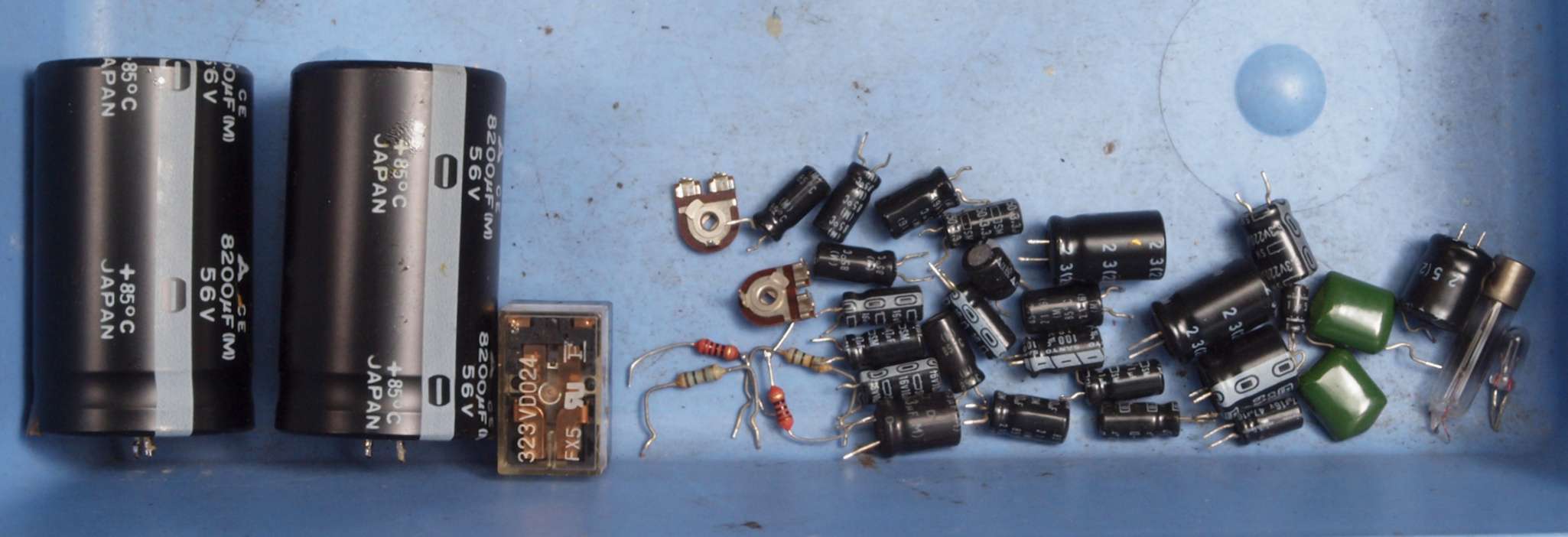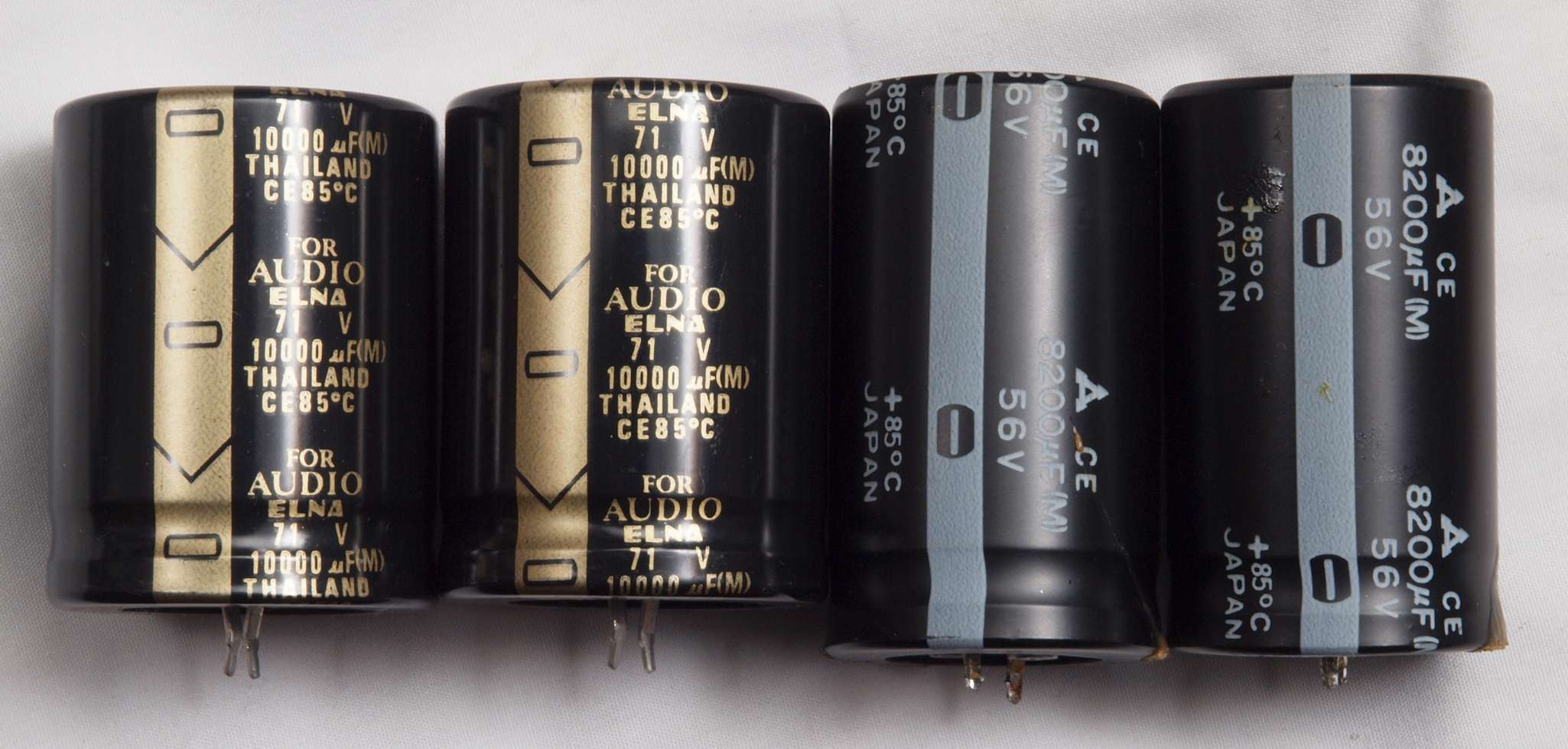 | A51. 点検中 電源ブロック電解コンデンサー比較。交換する左=10000μ/71WV、付いていた右=8200μ/56WV。 | ||||||||||||||||||||||||