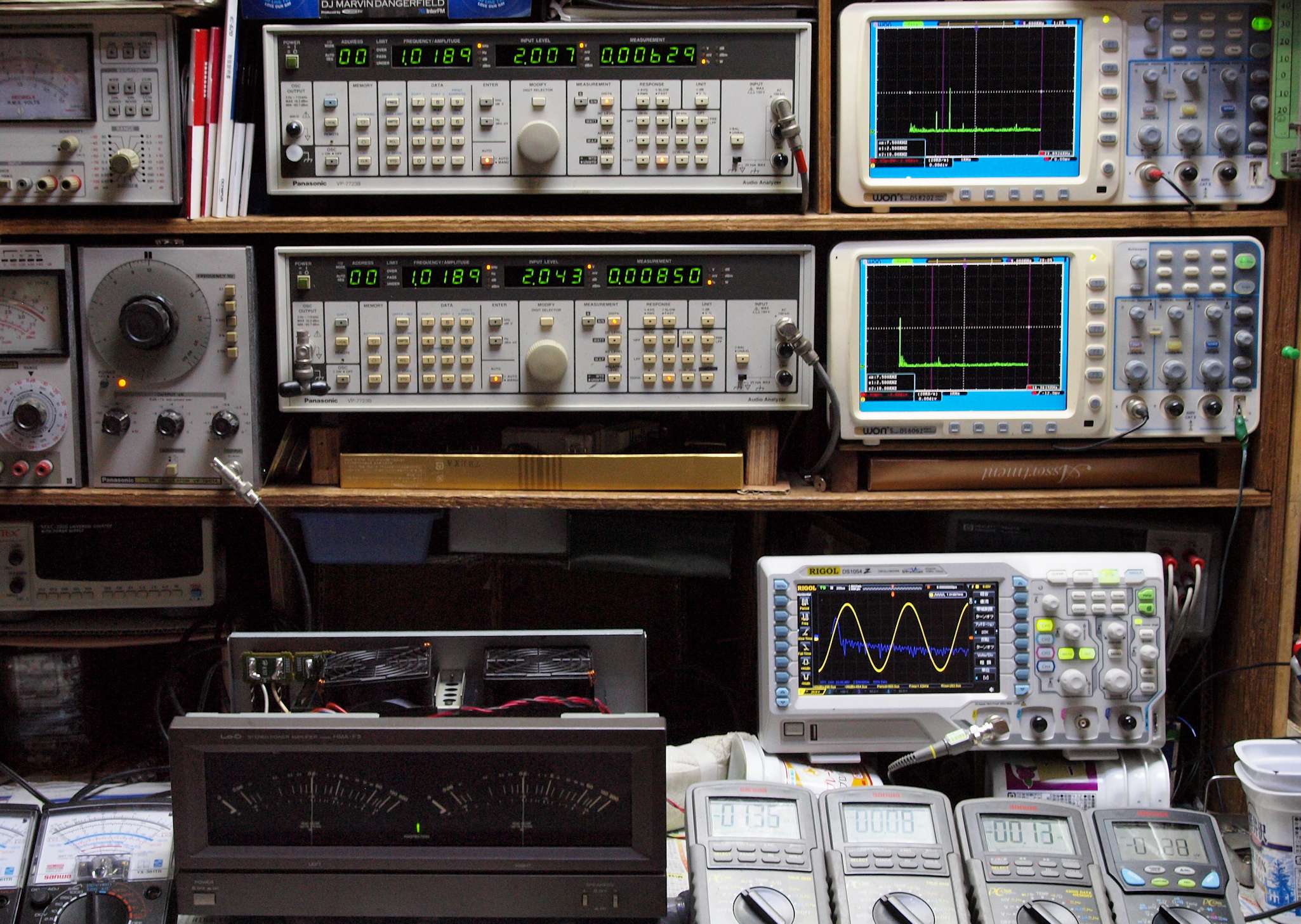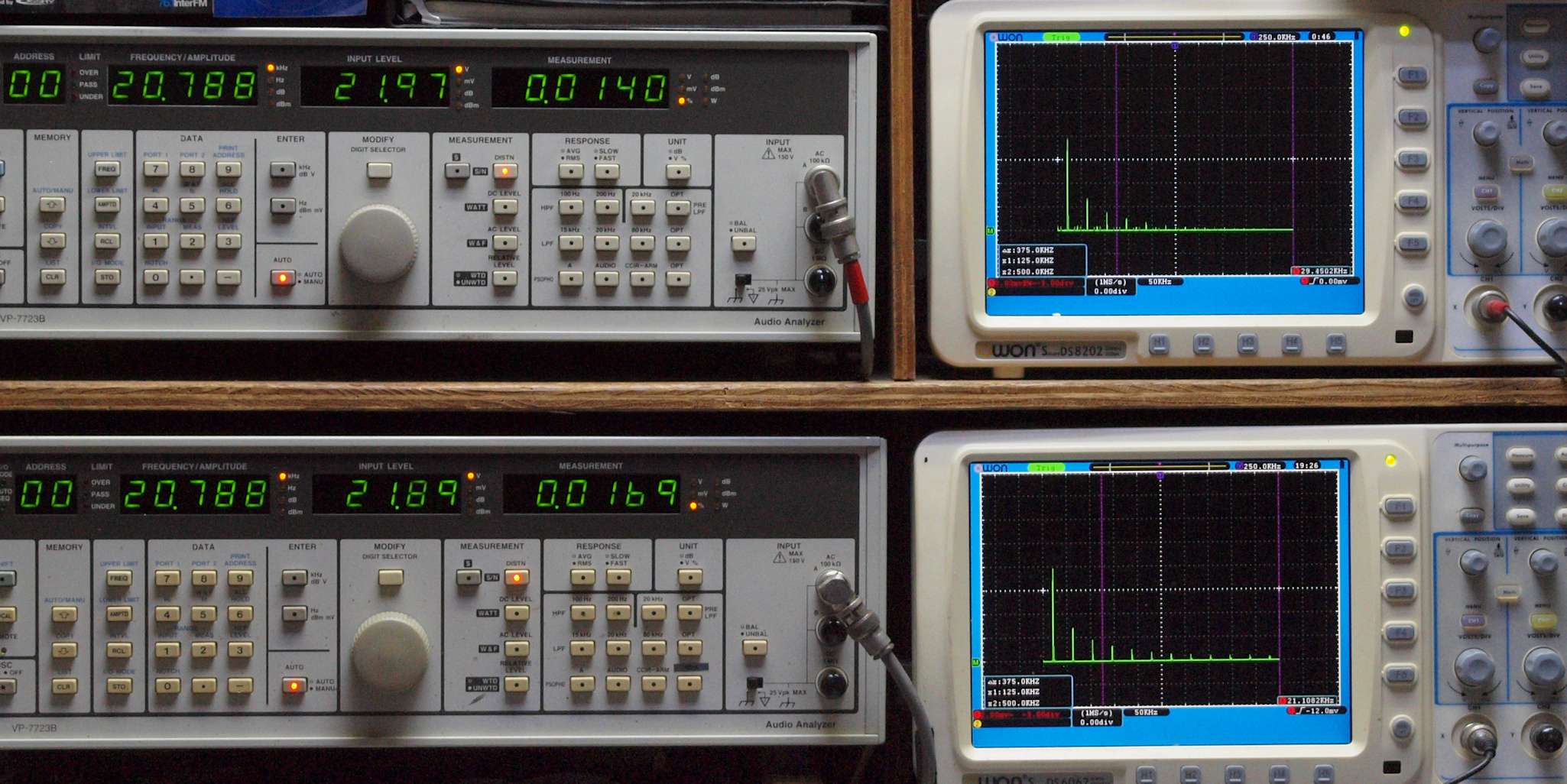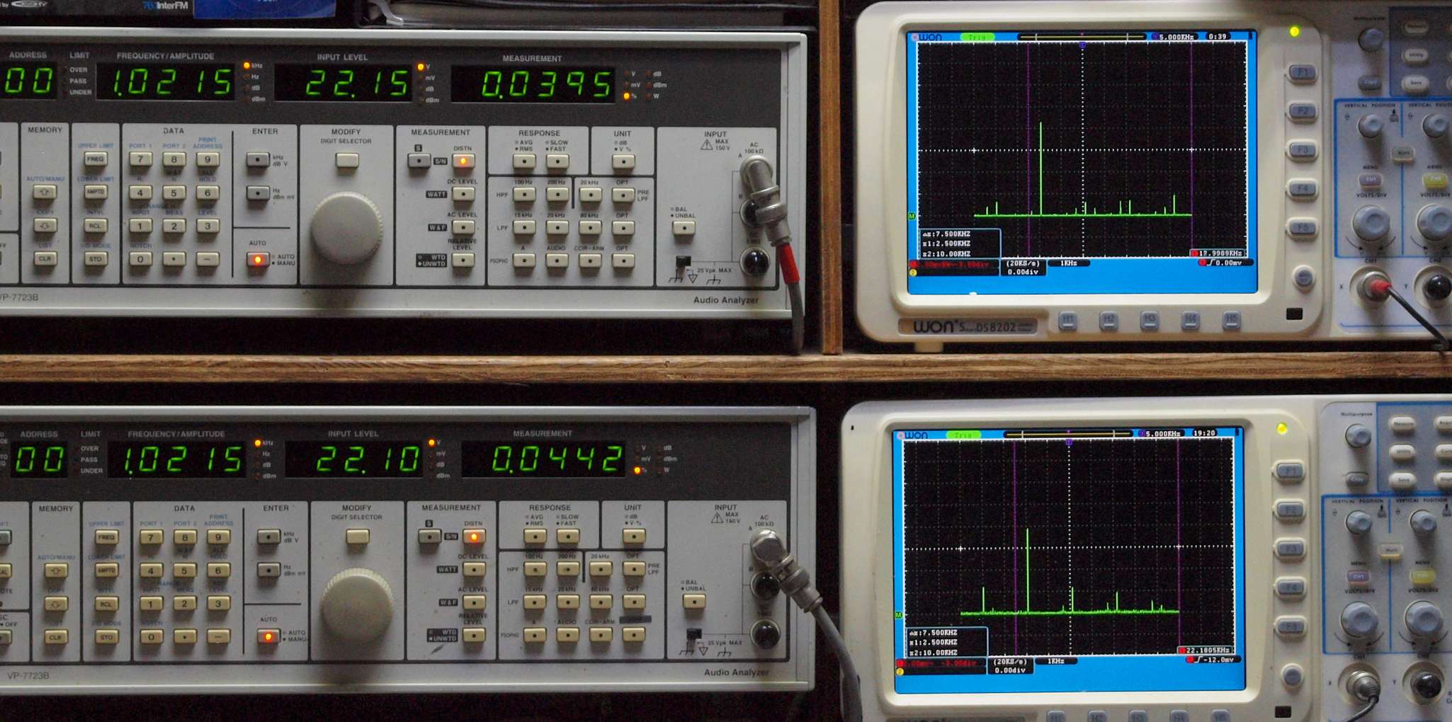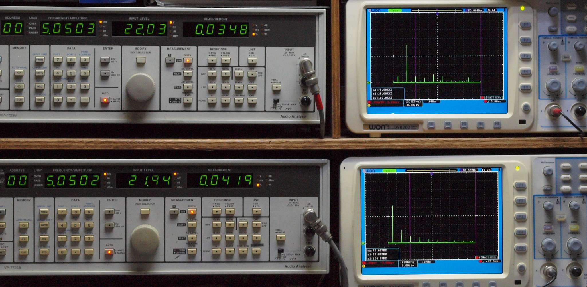 | E. 測定・調整。 画像をクリックすると、大きく(横幅2050ドット)表示されます。 E0. 出力・歪み率測定・調整 「見方」。 上段中 右側SP出力を「Audio Analyzer Panasonic VP−7723B」により測定。 表示LED、 左端=メモリーNo、 中左=周波数測定、 中右=出力電圧測定、 右端=歪み率測定。 上段右端 VP−7723Bの基本波除去出力を「owon SDS8202(200MHZ)」で「FFT分析」表示。 下段中 左側SP出力を「Audio Analyzer Panasonic VP−7723B」により測定。 表示LED、 左端=メモリーNo、 中左=周波数測定、 中右=出力電圧測定、 右端=歪み率測定。 下段右端 VP−7723Bの基本波除去出力を「owon SDS6062(200MHZ)」で「FFT分析」表示。 下段左端 オーディオ発振器 VP−7201A より50Hz〜100kHzの信号を出し(歪み率=約0.003%)、ATT+分配器を通し、AMPに入力。 よって、ダイアル設定出力レベルより低くなります。測定機器の仕様や整備の様子はこちら、「VP−7723B」「VP−7201A」。 FFT画面の見方はこちら。 |