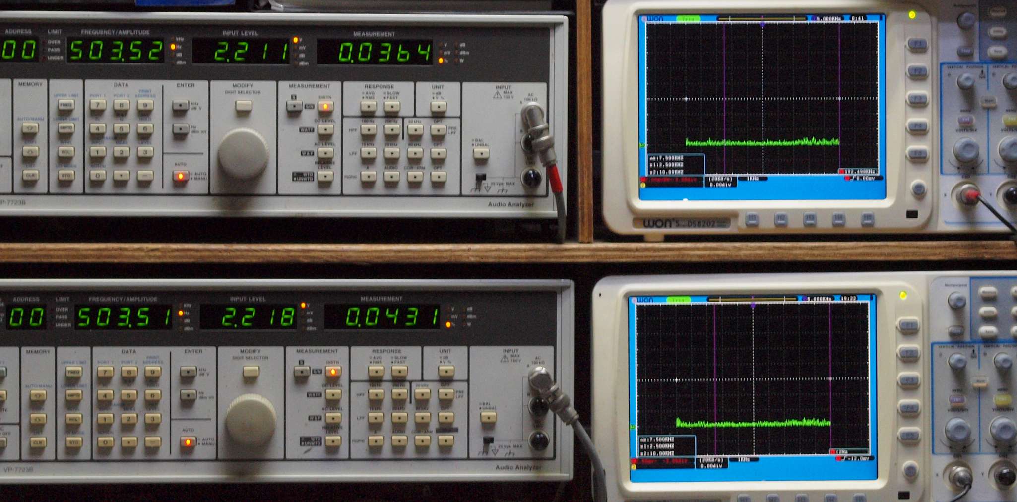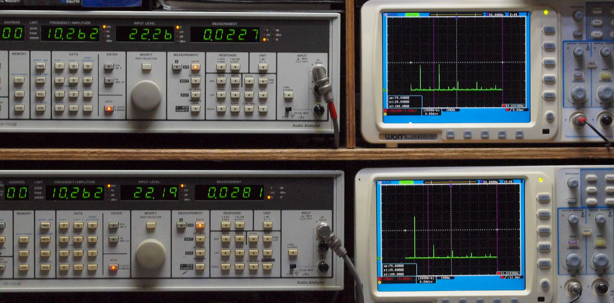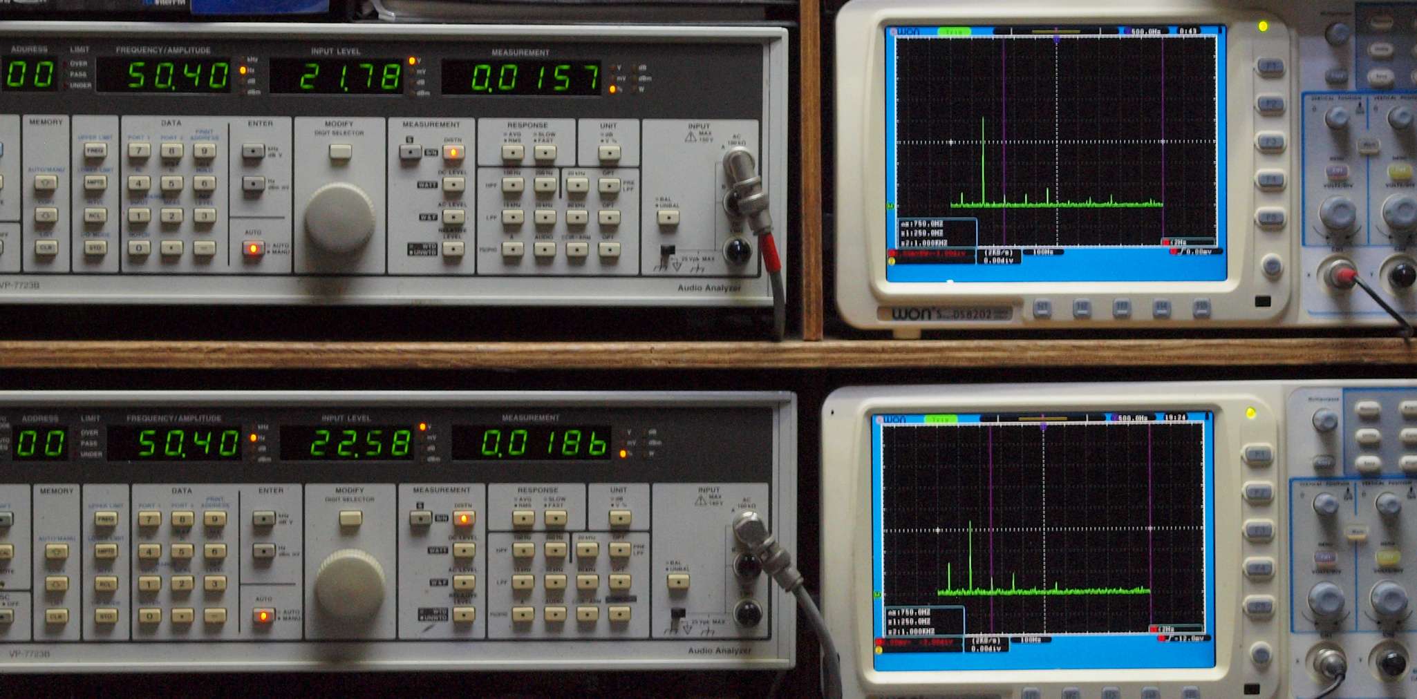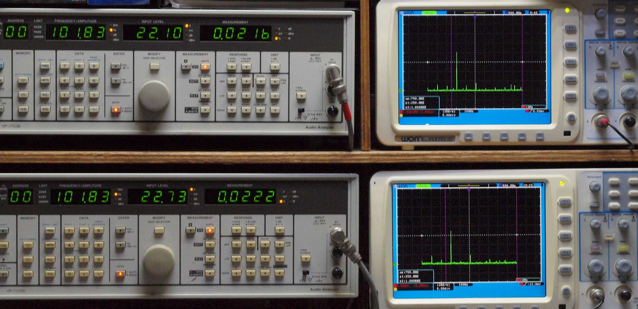 | E. 測定・調整。 画像をクリックすると、大きく(横幅2050ドット)表示されます。 E0. 出力・歪み率測定・調整 「見方」。 上段中 右側SP出力を「Audio Analyzer Panasonic VP−7723B」により測定。 表示LED、 左端=メモリーNo、 中左=周波数測定、 中右=出力電圧測定、 右端=歪み率測定。 上段右端 VP−7723Bの基本波除去出力を「owon SDS8202(200MHZ)」で「FFT分析」表示。 下段中 左側SP出力を「Audio Analyzer Panasonic VP−7723B」により測定。 表示LED、 左端=メモリーNo、 中左=周波数測定、 中右=出力電圧測定、 右端=歪み率測定。 下段右端 VP−7723Bの基本波除去出力を「owon SDS6062(200MHZ)」で「FFT分析」表示。 下段左端 オーディオ発振器 VP−7201A より50Hz〜100kHzの信号を出し(歪み率=約0.003%)、ATT+分配器を通し、AMPに入力。 よって、ダイアル設定出力レベルより低くなります。測定機器の仕様や整備の様子はこちら、「VP−7723B」「VP−7201A」。 FFT画面の見方はこちら。 |