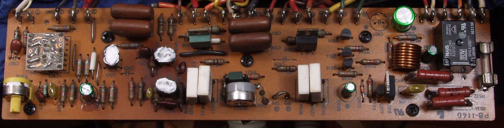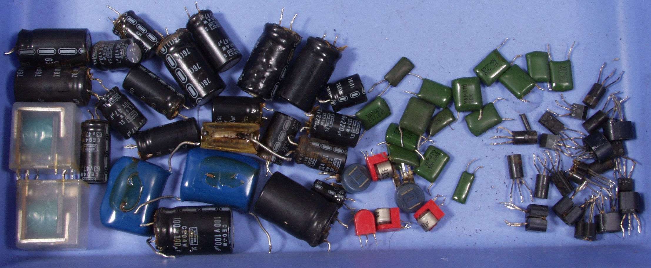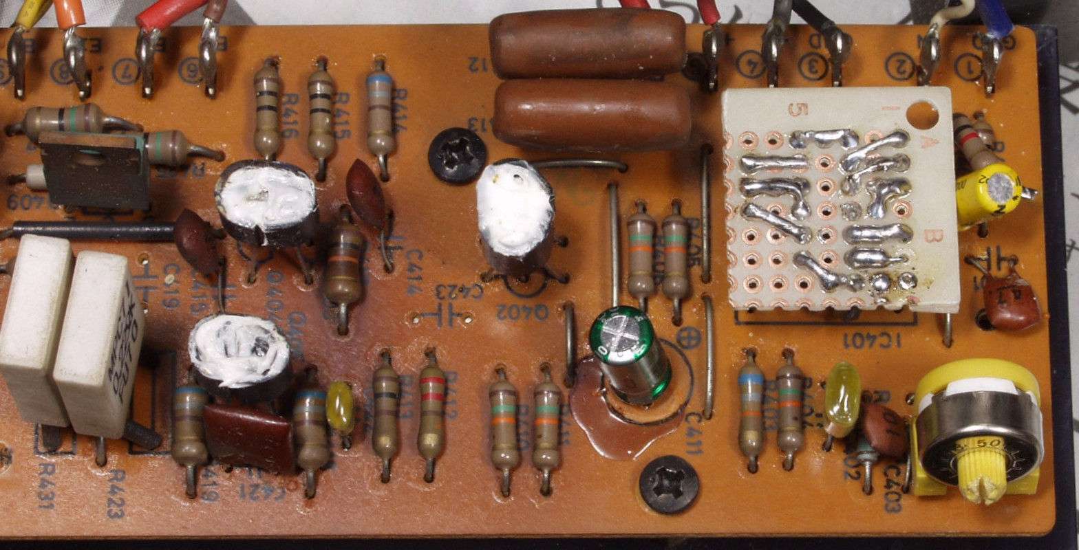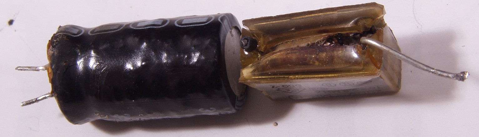 | C8A.左=液漏れし且つ腐食した電解コンデンサー 右=割れたフイルムコンデンサー | ||||||||||||||||||||||||||||||||||||||