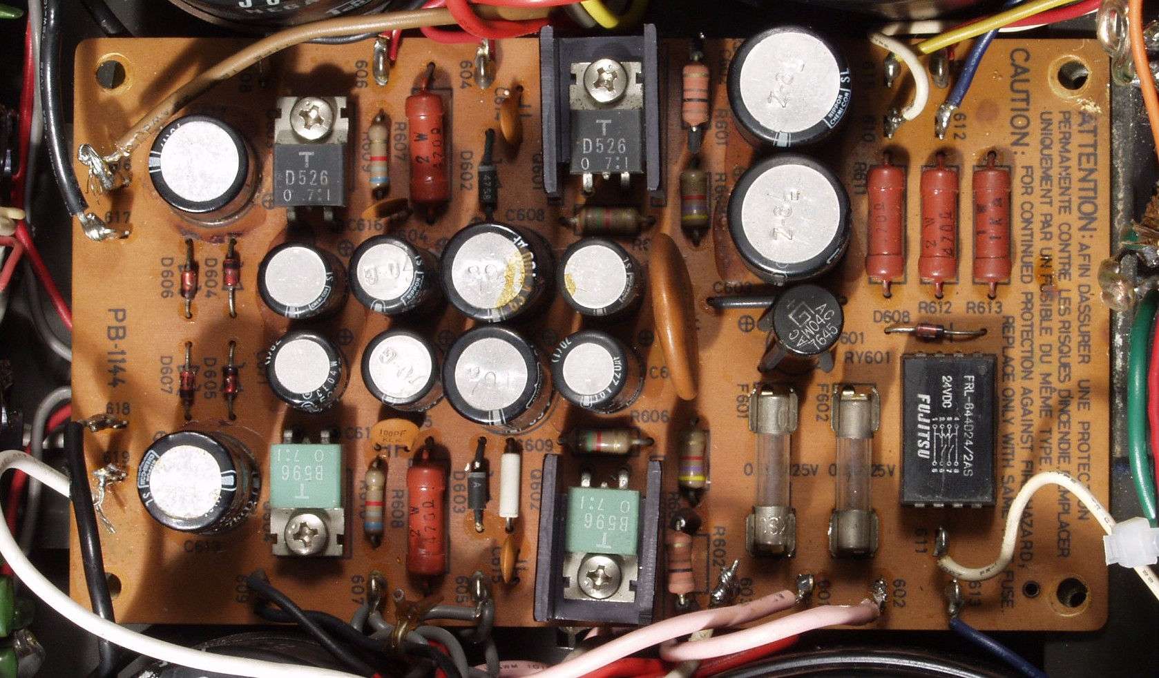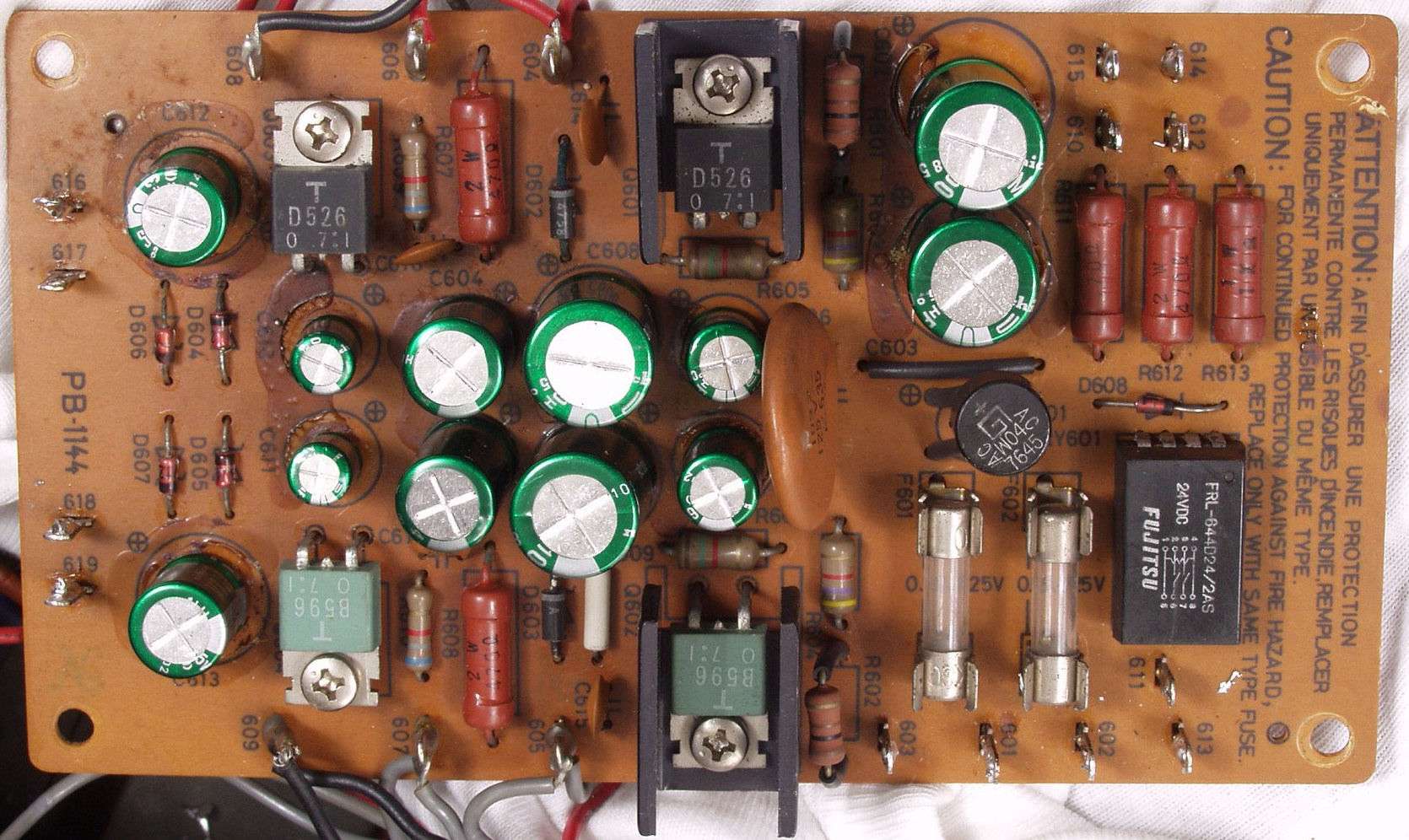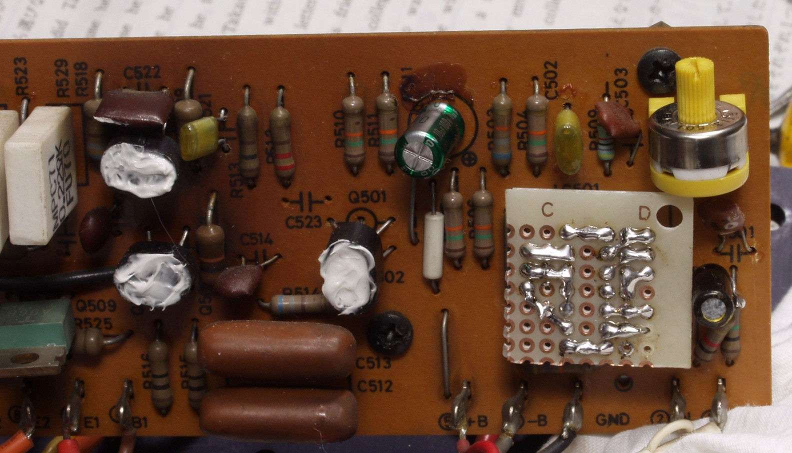 | C8A.左=液漏れし且つ腐食した電解コンデンサー 右=割れたフイルムコンデンサー | ||||||||||||||||||||||||||||||||||||||