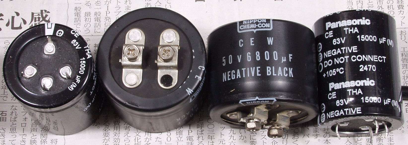 | G.再修理状況 G1A.修理前 交換する電解コンデンサー比較 真ん中2個=付いていた50V6800μ 左右両端=新しい63V15000μ |