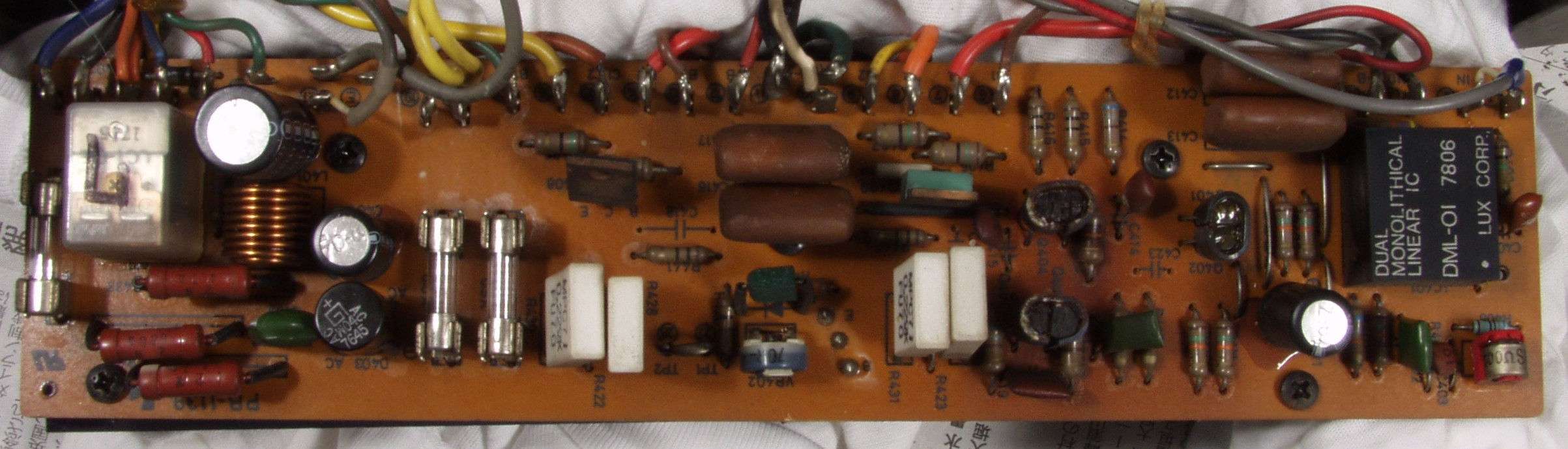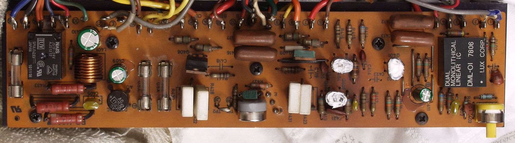 | C2B.修理後 L−メインAMP基板 SP接続リレー、半固定VR2個、TR(トランジスタ−)6個、電解コンデンサー3個、フイルムコンデンサー3個交換 |