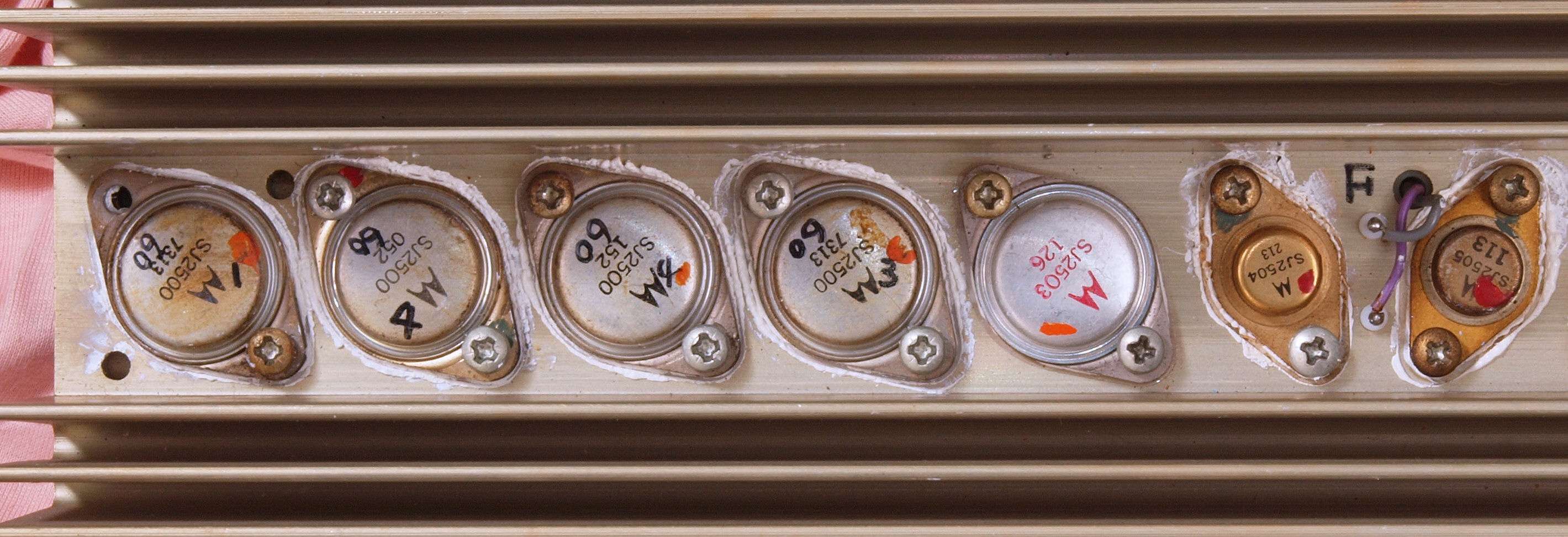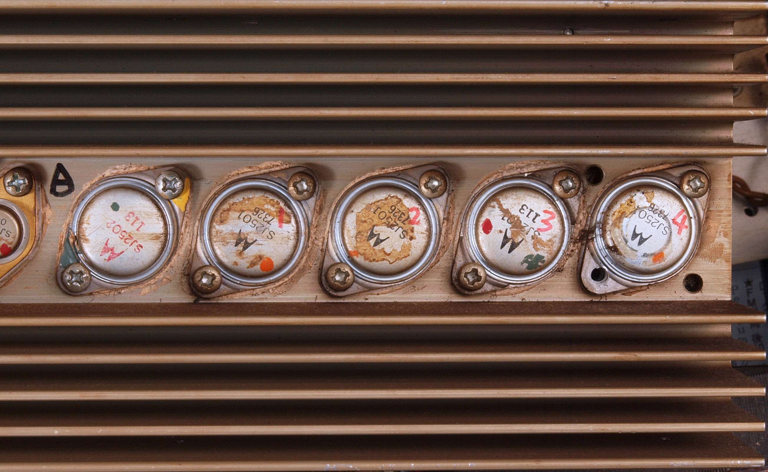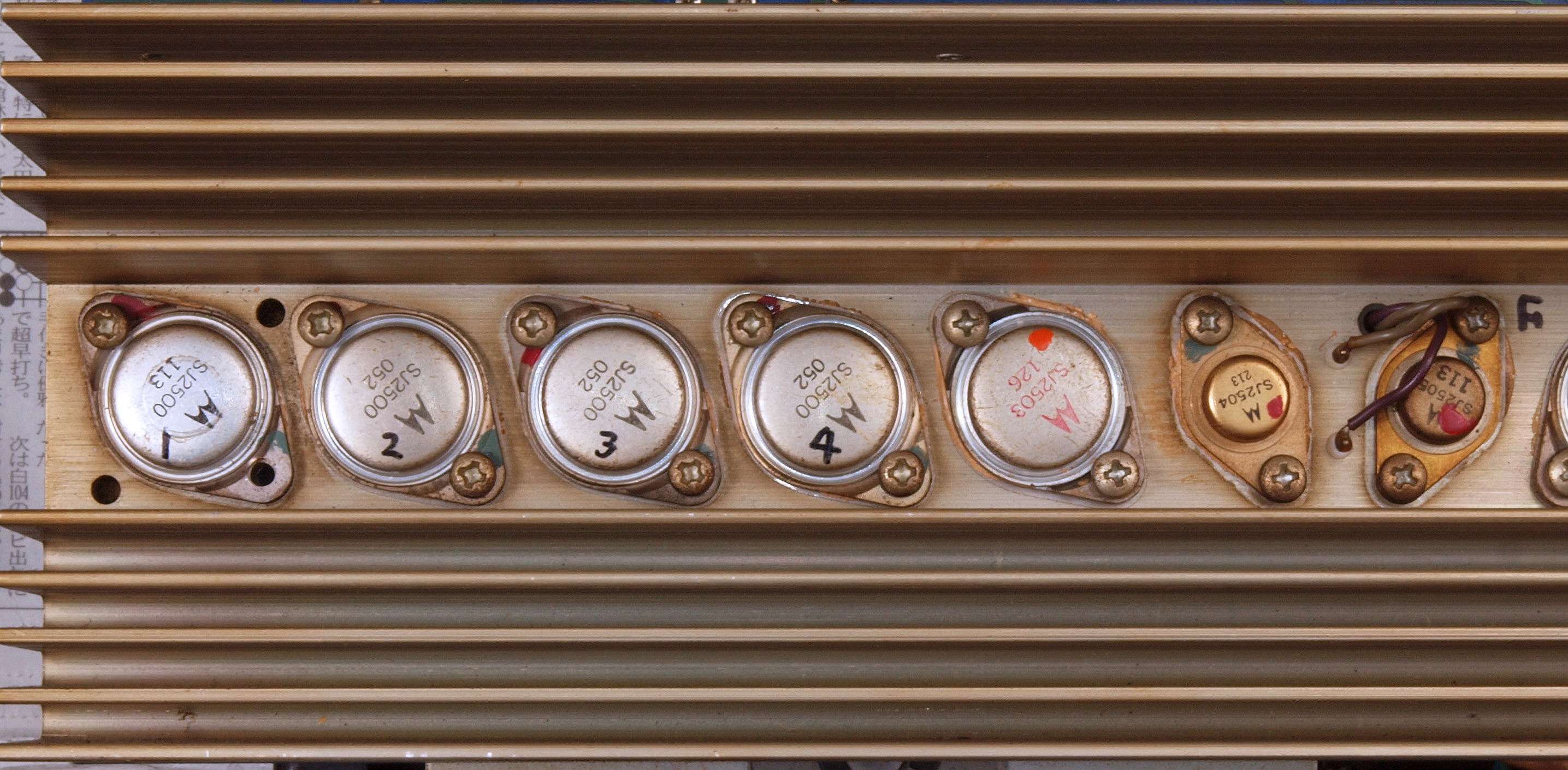 | T212. 点検中 R側(B)終段TR(トランジスター)、 SJ2500。 色マーカの意味。 赤→hfe=30〜49、 橙→hfe=50〜69、 黄→hfe=70〜99、 緑→hfe=100Up。 |
