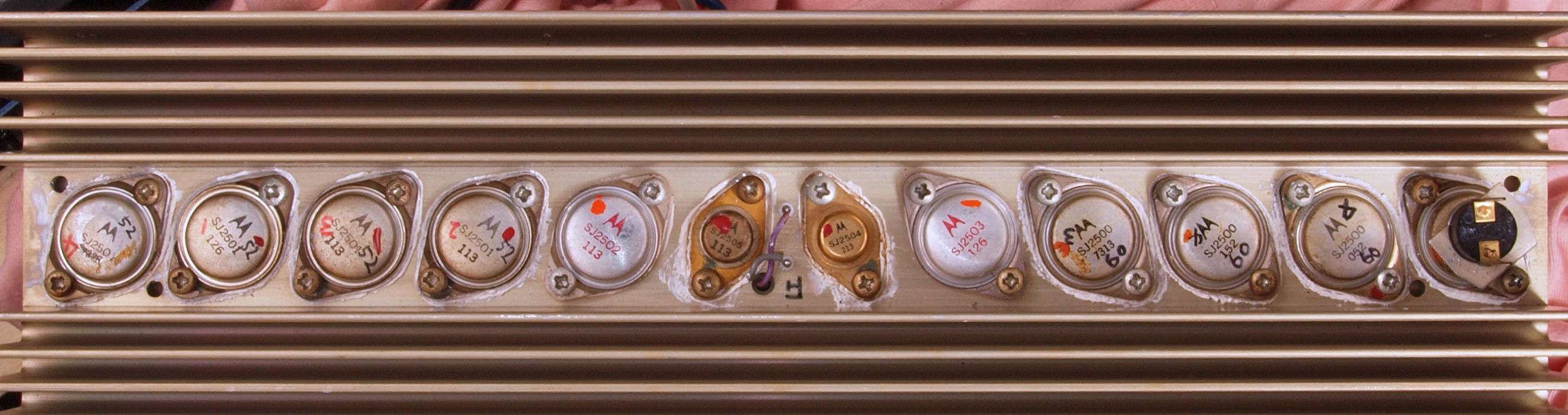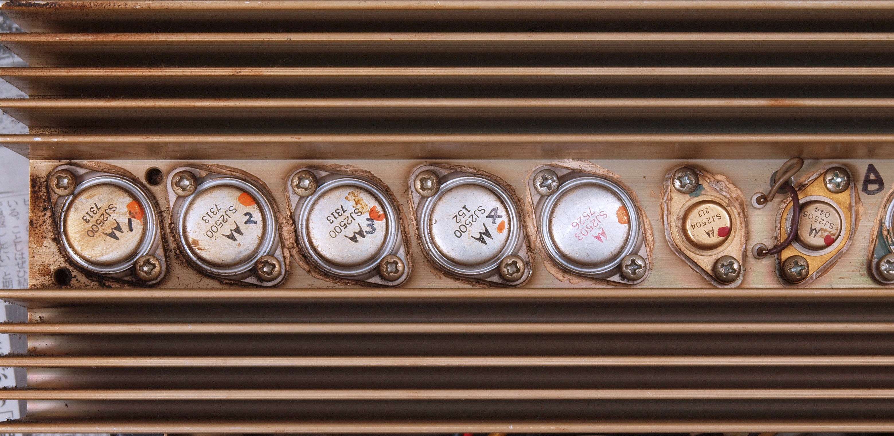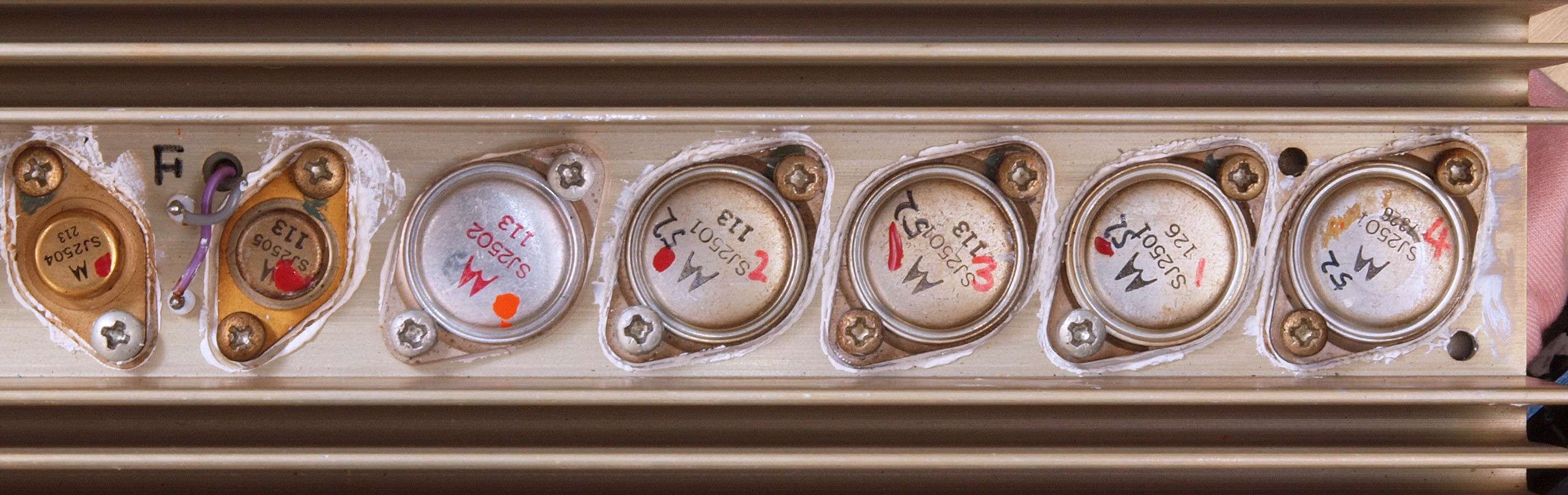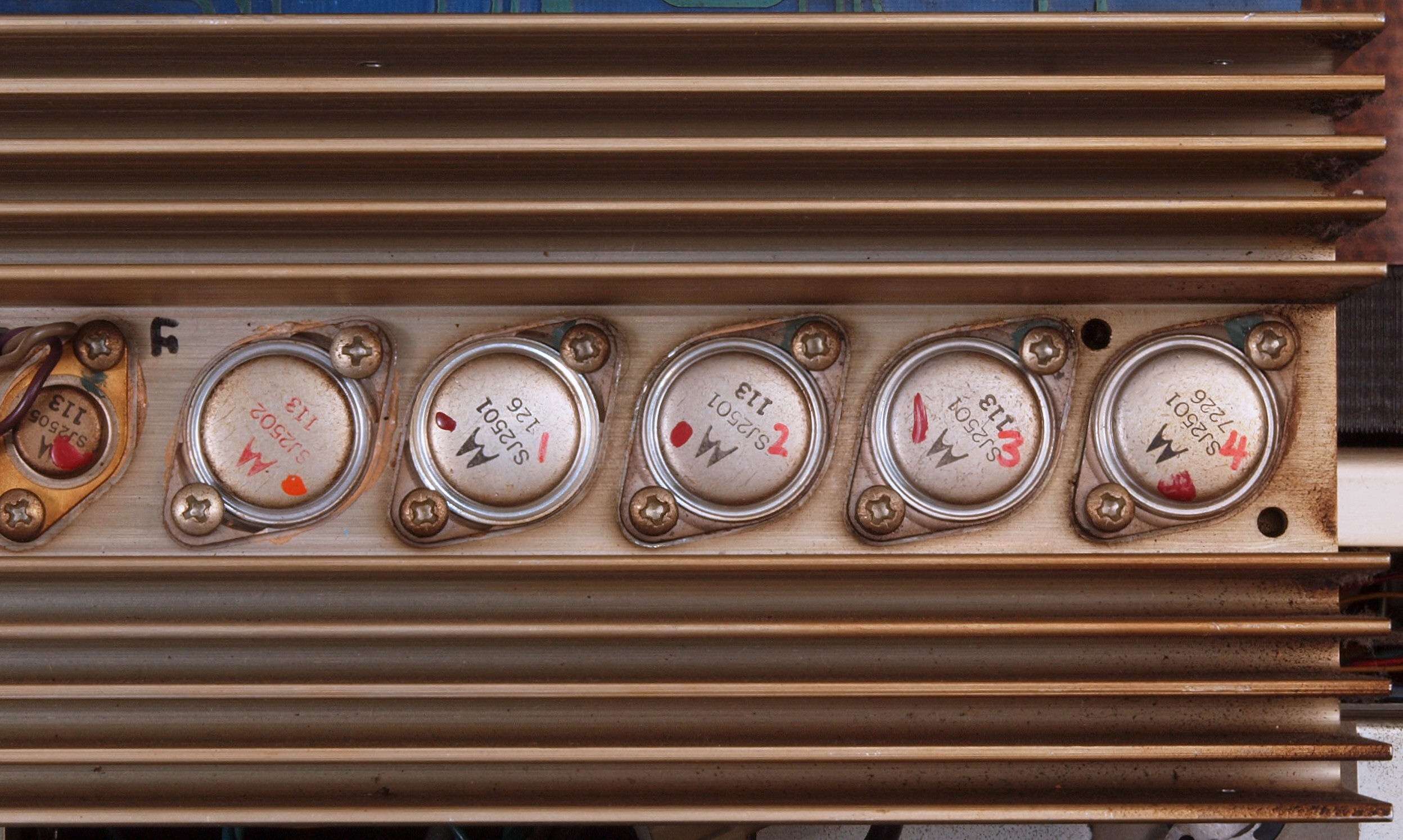 | T212. 点検中 R側(B)終段TR(トランジスター)、 SJ2500。 色マーカの意味。 赤→hfe=30〜49、 橙→hfe=50〜69、 黄→hfe=70〜99、 緑→hfe=100Up。 |