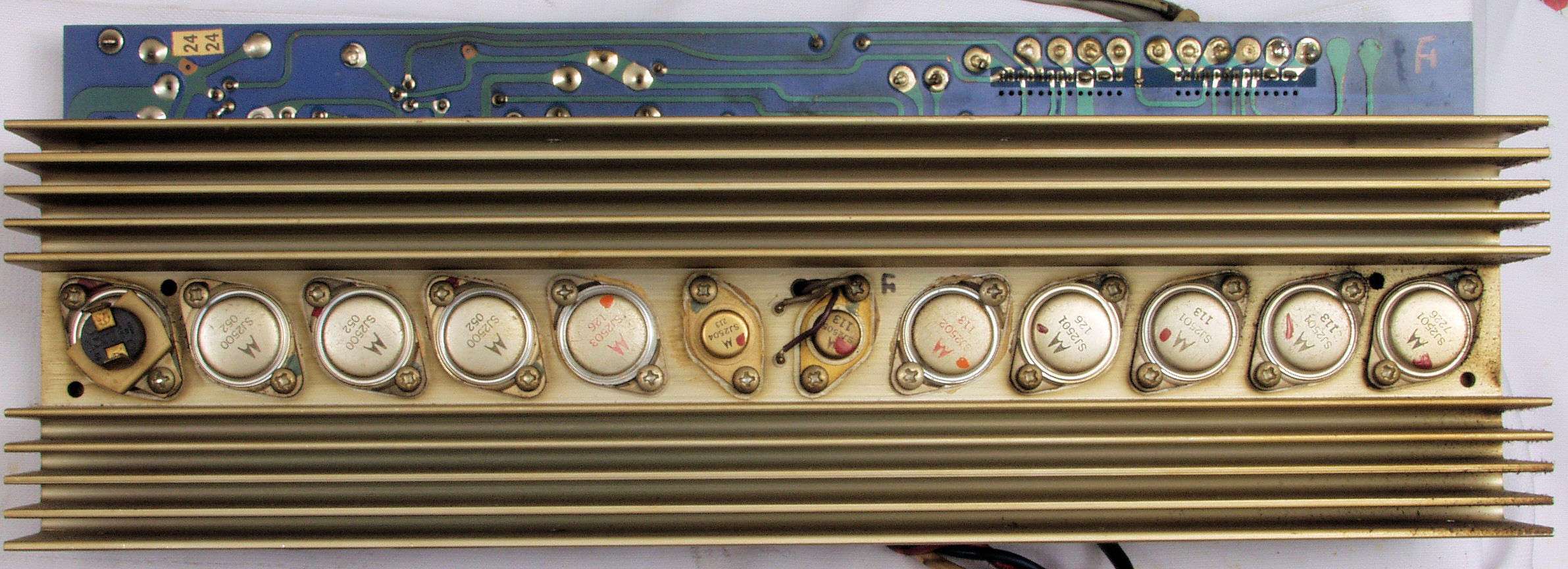 | T312. 点検中 L側(F)終段TR(トランジスター)、 SJ2500。 色マーカの意味。 赤→hfe=30〜49、 橙→hfe=50〜69、 黄→hfe=70〜99、 緑→hfe=100Up。 |