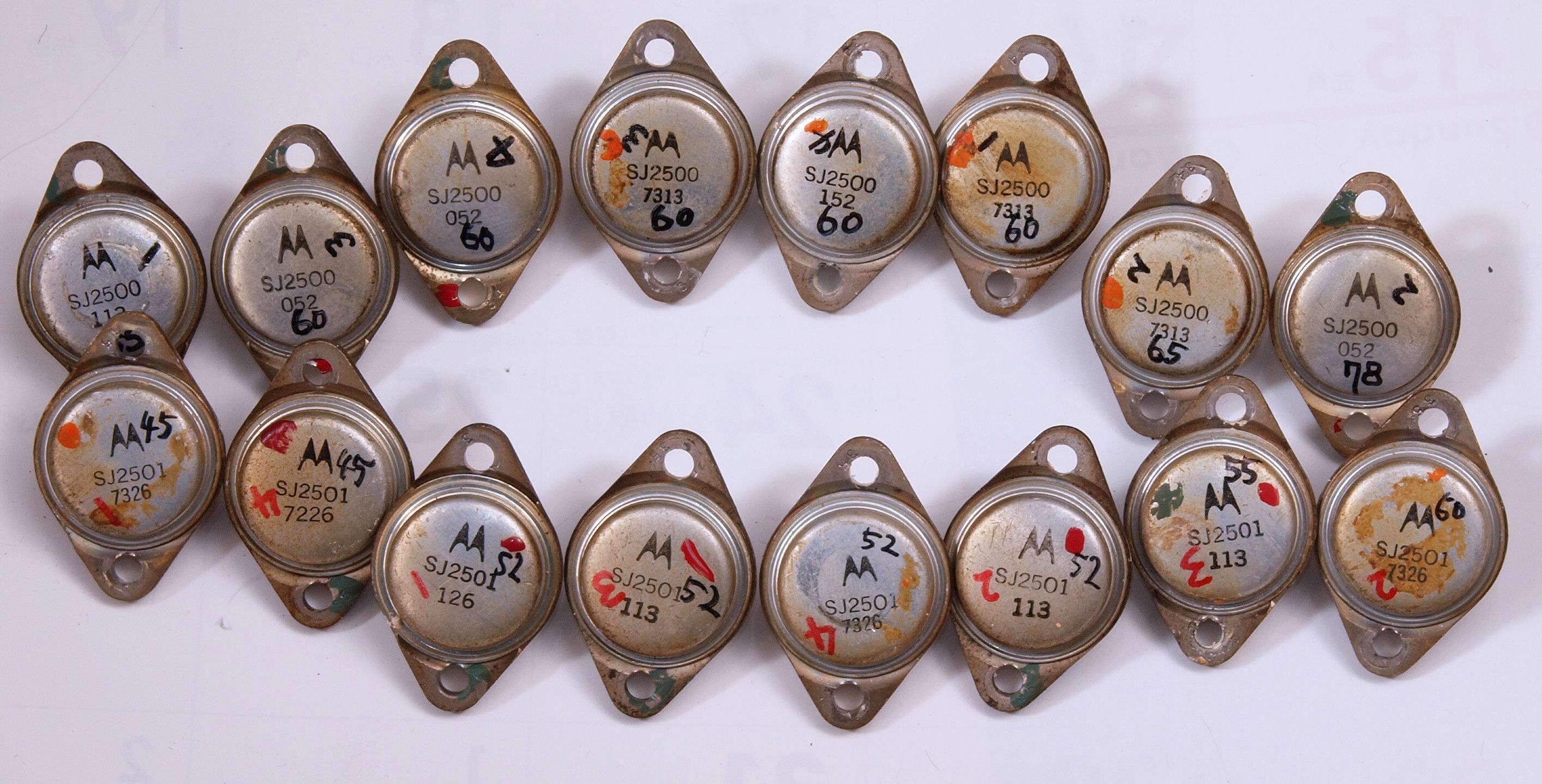 | C. 修理状況 C11. 修理中 部品とり器から終段TR(トランジスター)を取り出し、IC=1A時のIBを選別して使用する。 「SJ2500=60」を4個、 「SJ2501=52」を4個使用する。 経年変化で色マーカは当てにならない! 色マーカの意味。 赤→hfe=30〜49、 橙→hfe=50〜69、 黄→hfe=70〜99、 緑→hfe=100Up。 |