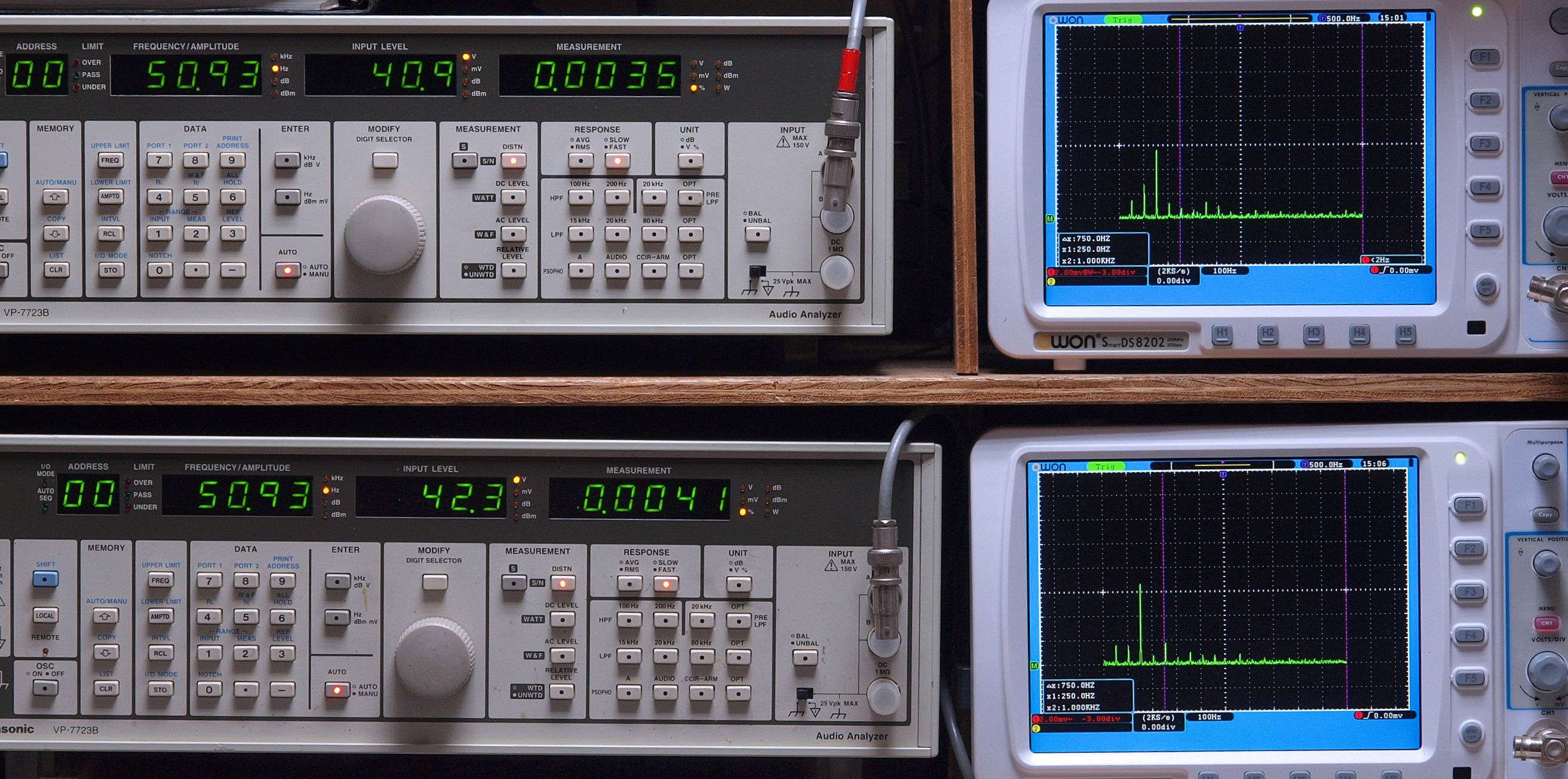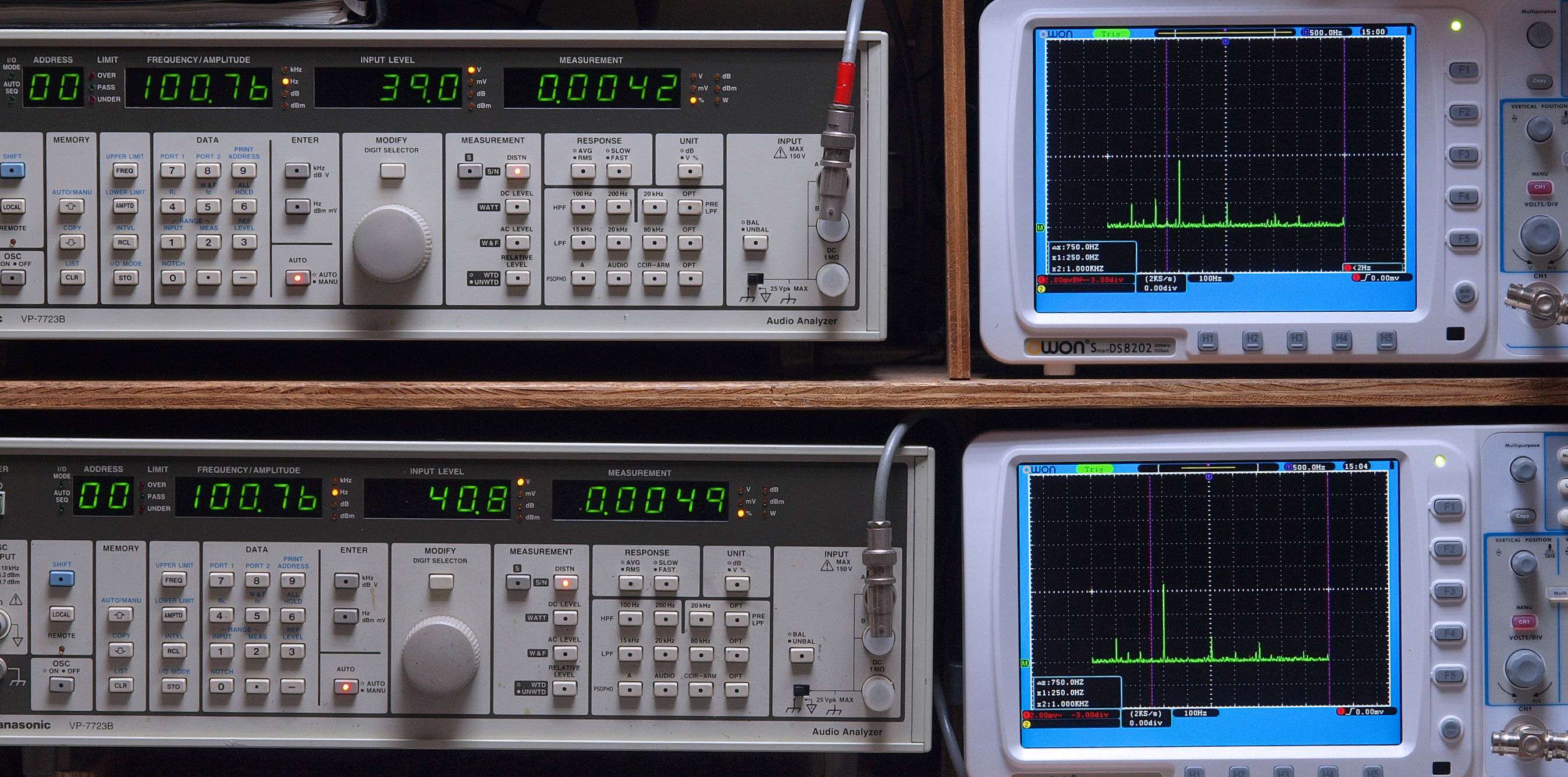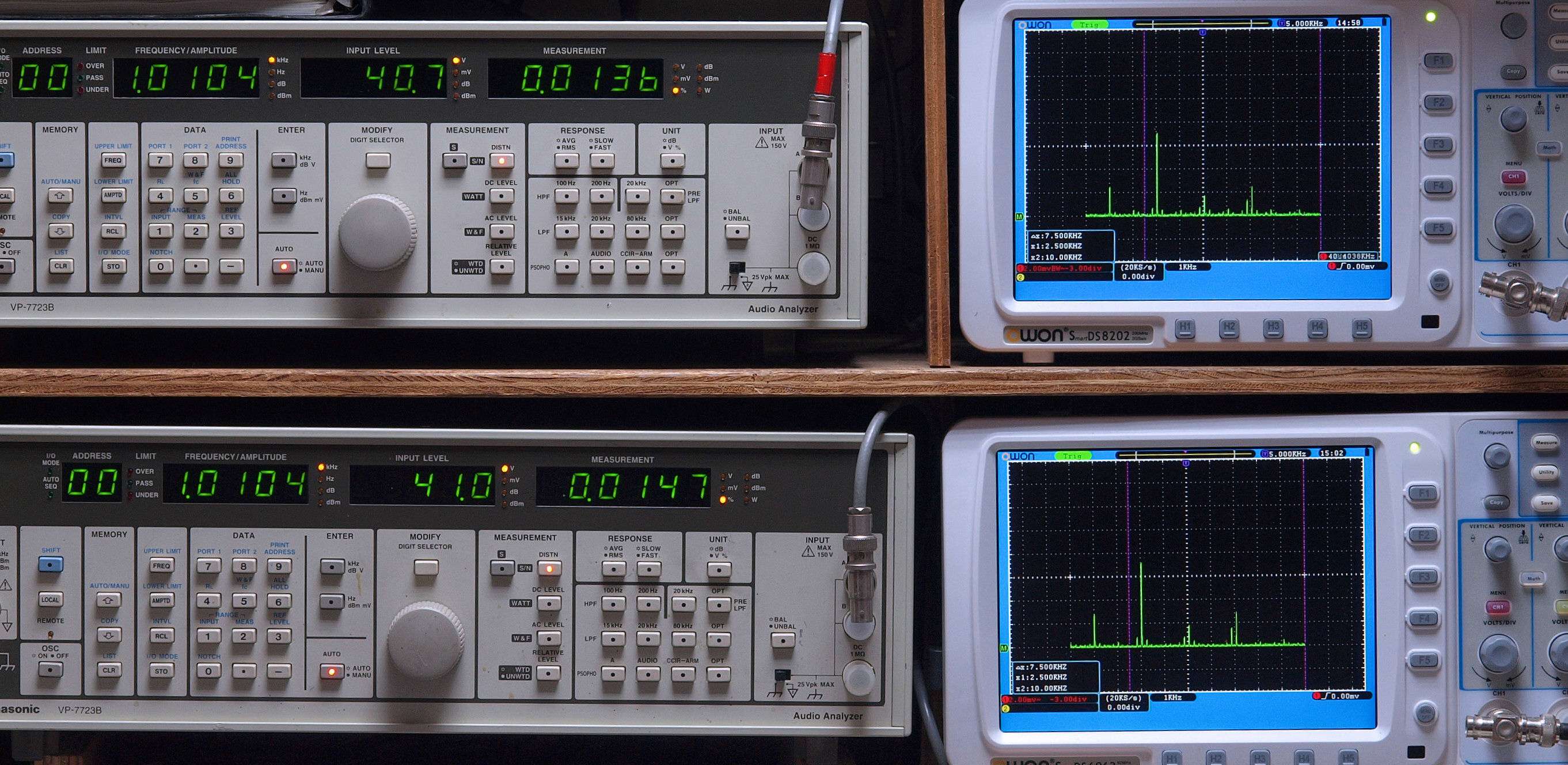 | E. 測定・調整 E1. 出力・歪み率測定・調整 「見方」。 上段中 右側SP出力を「Audio Analyzer Panasonic VP−7723B」により測定。 表示LED、 左端=メモリーNo、 中左=周波数測定、 中右=出力電圧測定、 右端=歪み率測定。 上段右端 VP−7723Bの基本波除去出力を「owon SDS8202(200MHZ)」で「FFT分析」表示。 下段中 左側SP出力を「Audio Analyzer Panasonic VP−7723B」により測定。 表示LED、 左端=メモリーNo、 中左=周波数測定、 中右=出力電圧測定、 右端=歪み率測定。 下段右端 VP−7723Bの基本波除去出力を「owon SDS6062(200MHZ)」で「FFT分析」表示。 下段左端 オーディオ発振器 VP−7201A より50Hz〜100kHzの信号を出し(歪み率=約0.003%)、ATT+分配器を通し、AMPに入力。 よって、ダイアル設定出力レベルより低くなります。測定機器の仕様や整備の様子はこちら、「VP−7723B」「VP−7201A」。 FFT画面の見方はこちら。 |