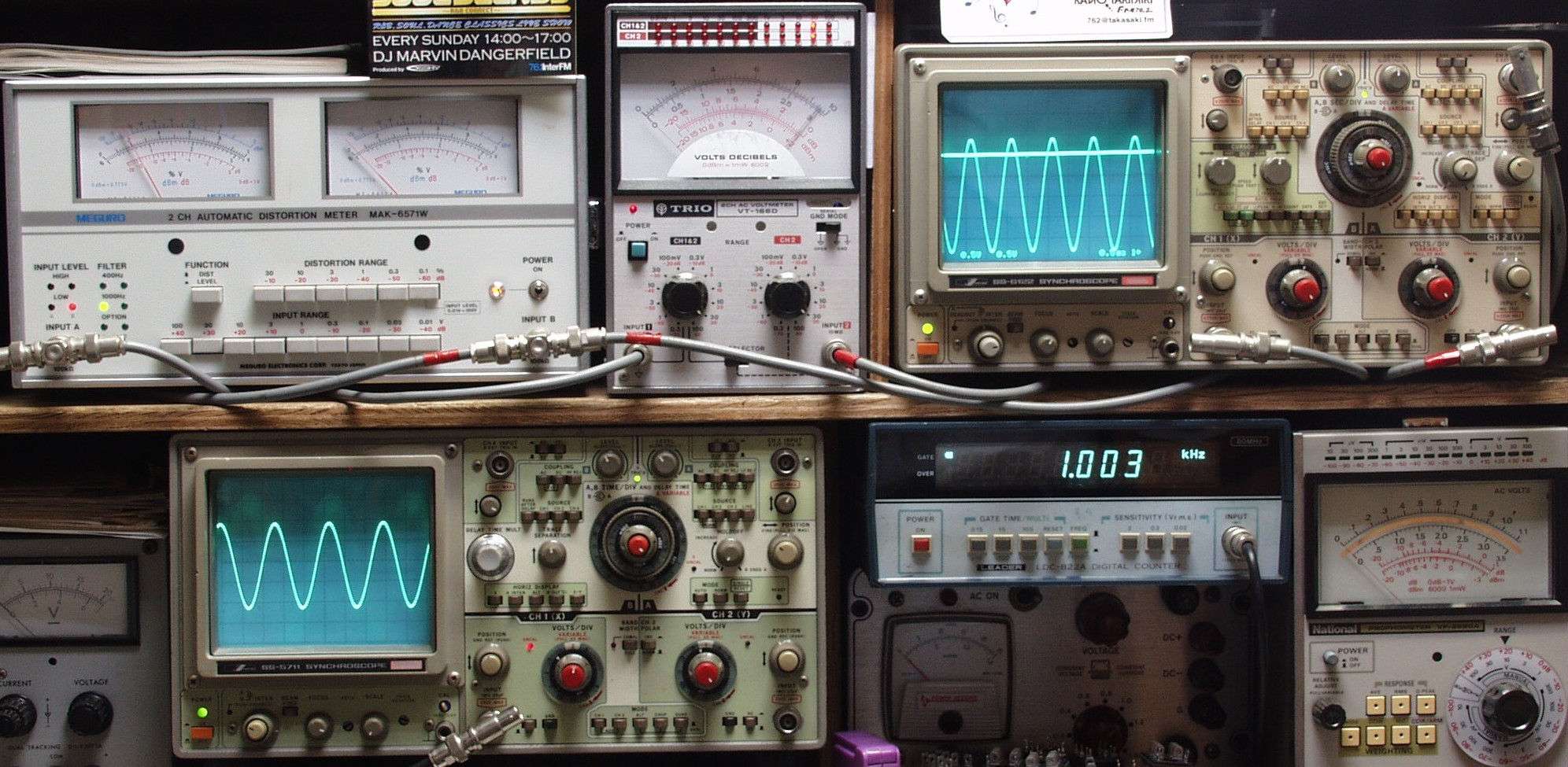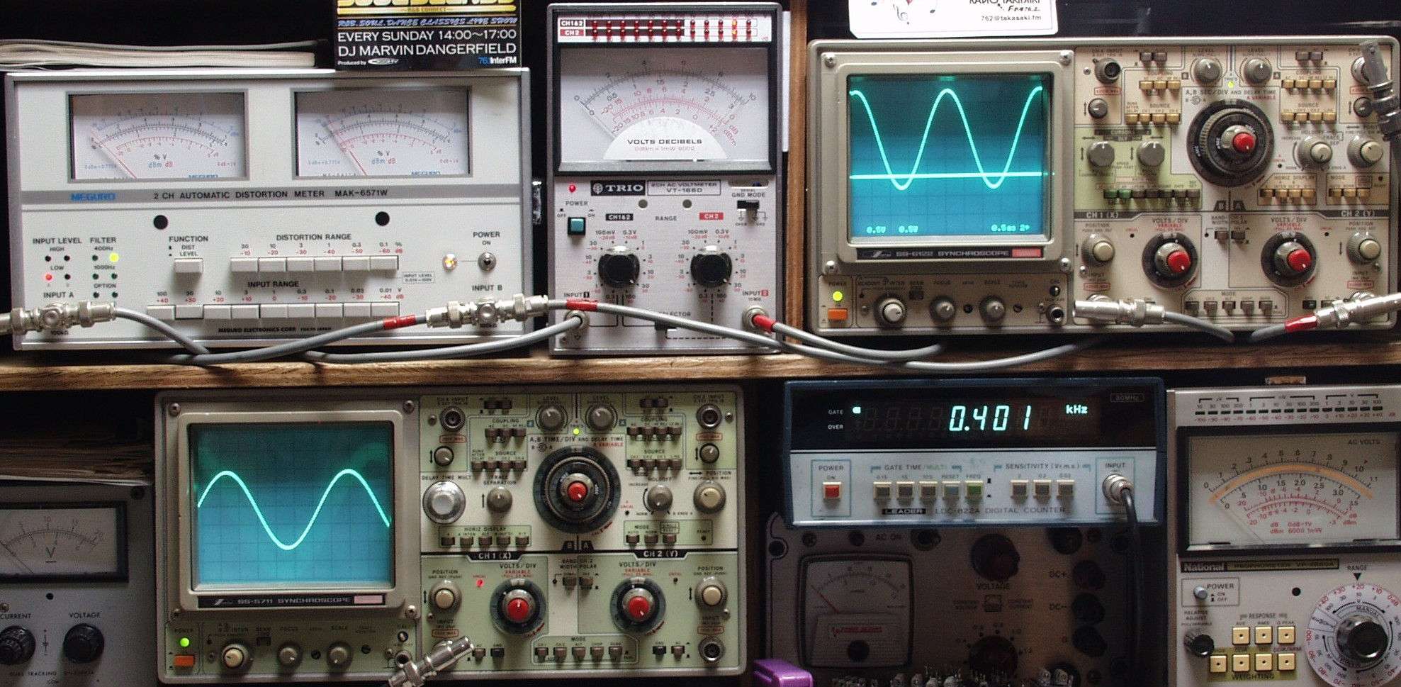 | E. 調整・測定 E−1. 出力/歪み率測定・調整 <見方> 下左オーディオ発振器より400HZ&1KHZの信号を出す(歪み率=約0.003%)。 下中=入力波形(オーディオ発振器のTTLレベル)。 下右=周波数計。 上左=SP出力の歪み率測定。 左メータ=L出力。 右メータ=R出力。 上中=SP出力電圧測定器。 赤針=R出力。 黒針=L出力 上右=SP出力波形オシロ。 上=R出力。 下=L出力(出力電圧測定器の出力)。 |
