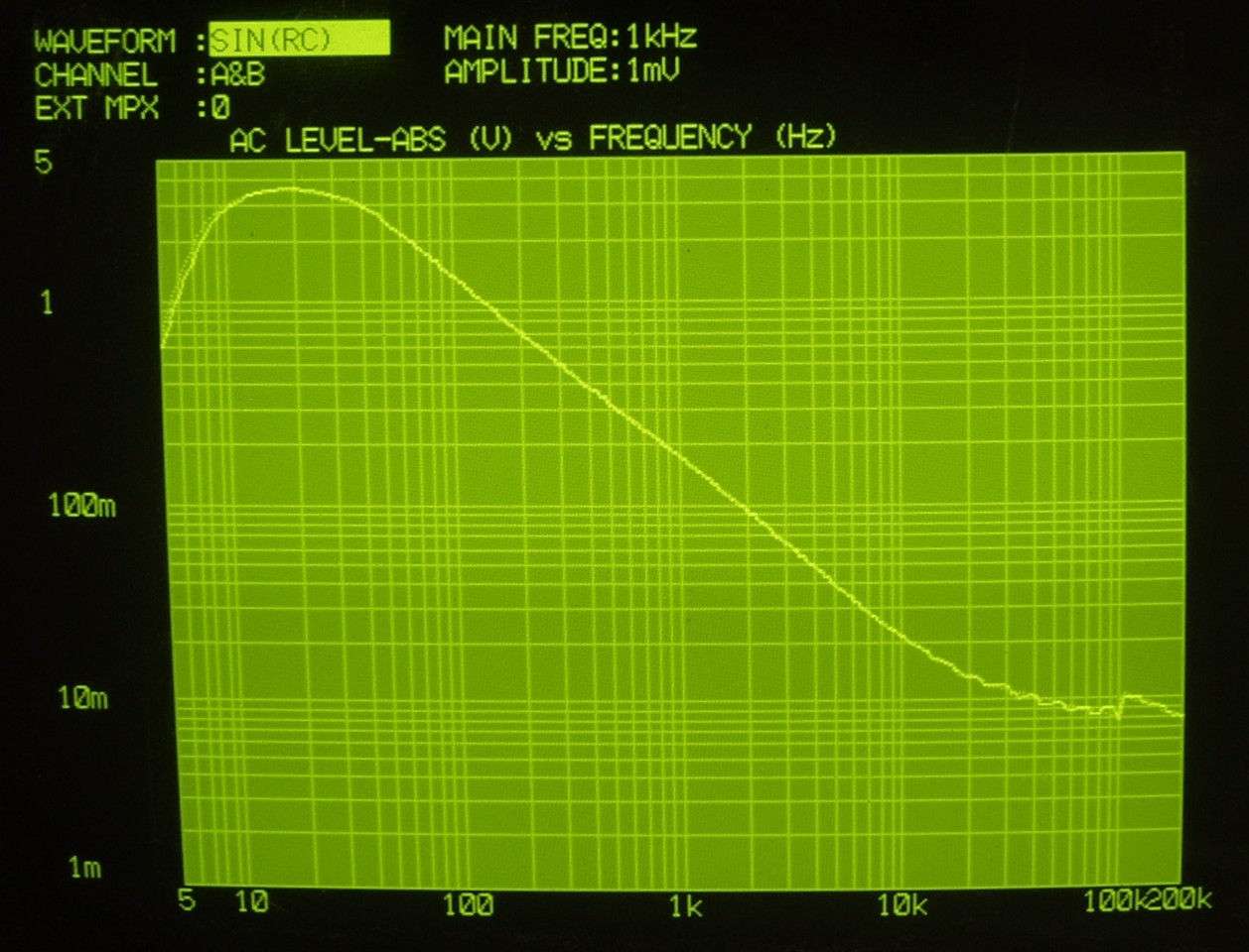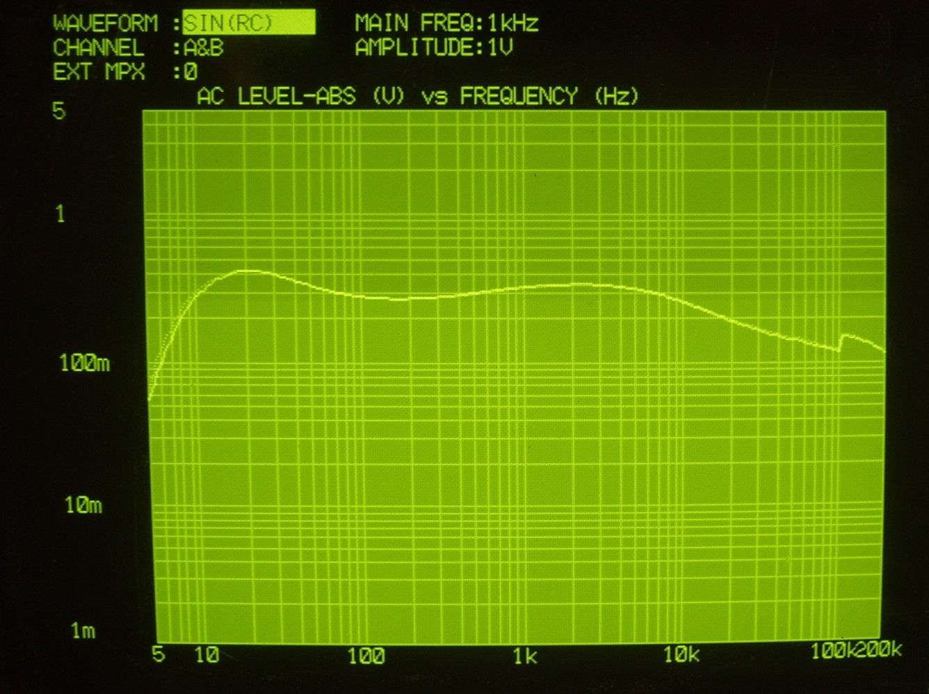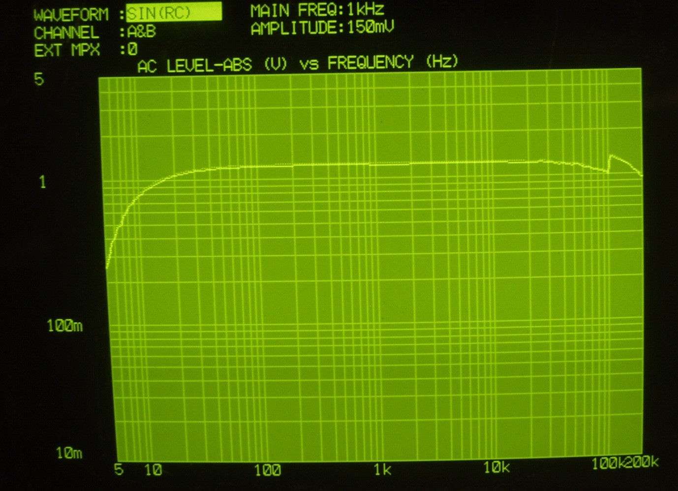 | F−3A. 入出力特性測定(MM入力) MM入力端子へ1mV一定入力 VRはmax 左出力=薄(細い)色 右出力=濃い(太い)色 |