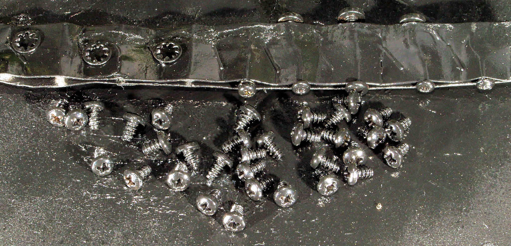 K22. 修理中 下前左から見る。 内側圧縮材にボンドを染みこませる。見切りの所も塗る、はみ出した所は水性なので乾燥後濡雑巾で取る。