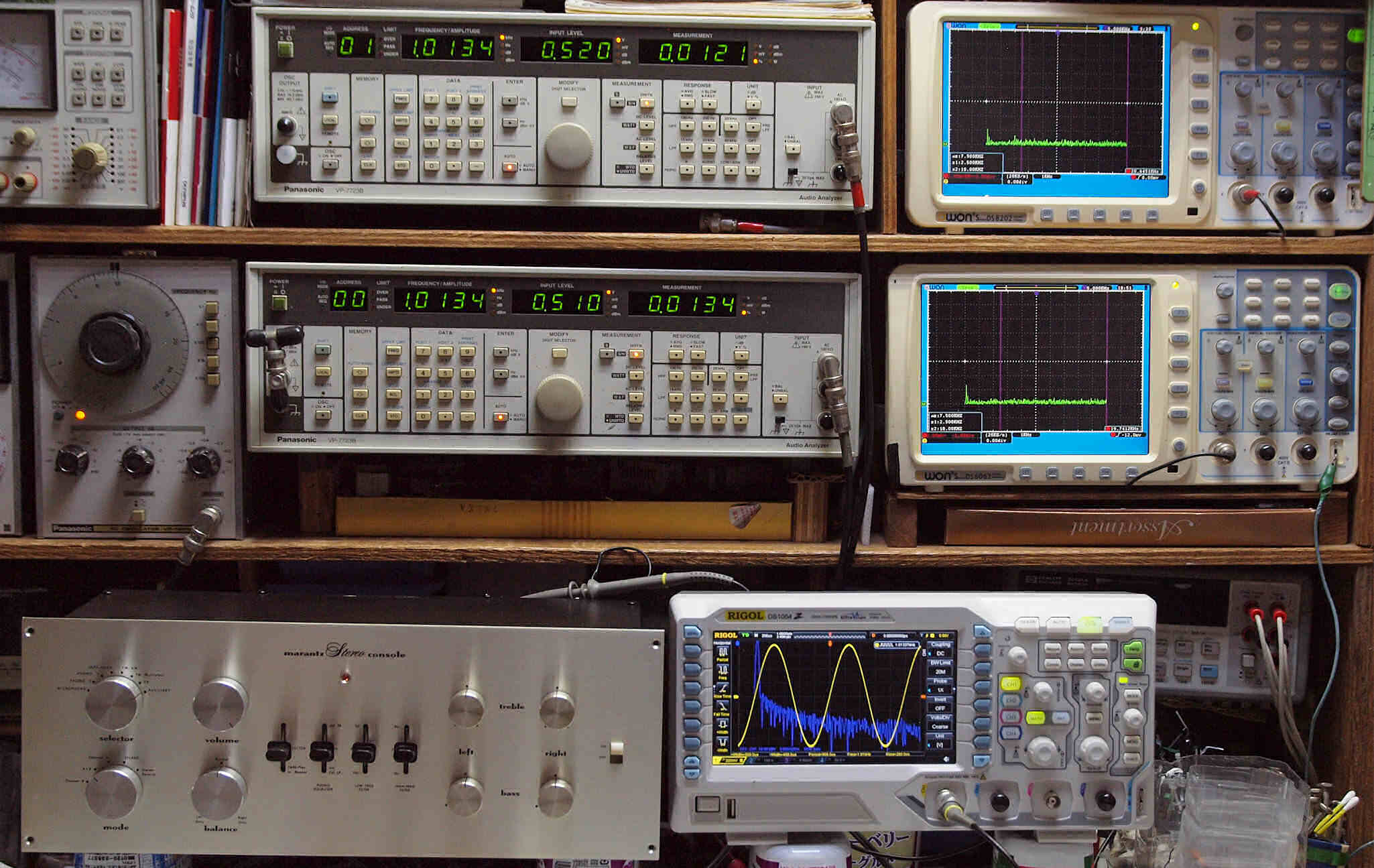 下段左端 オーディオ発振器 VP−7201A より50Hz〜100kHzの信号を出し(歪み率=約0.003%)、ATT+分配器を通し、AMPに入力。
