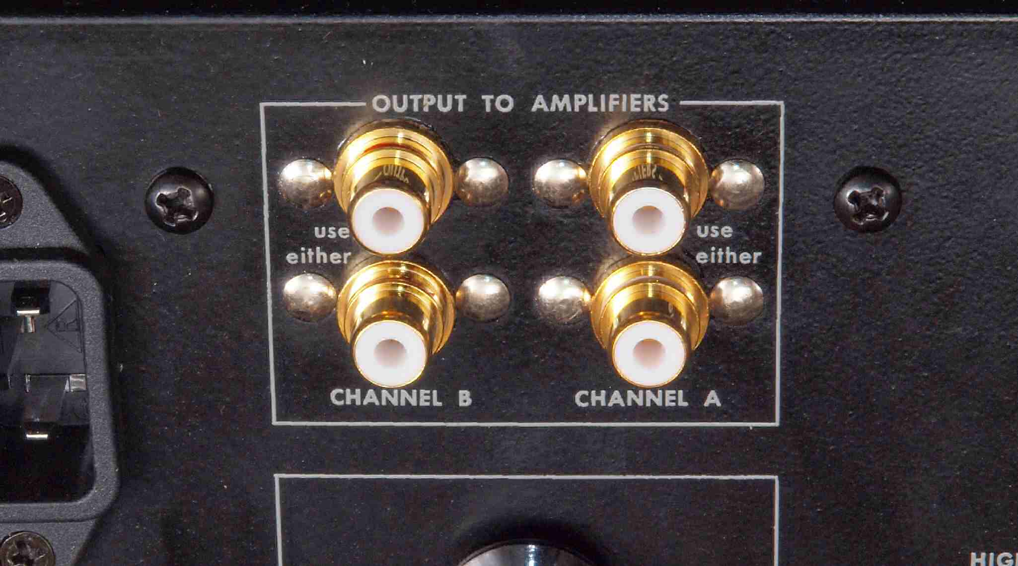 | A55. 点検中 入力RCA端子郡 テフロン絶縁仕様に交換可能。 ピッチが狭く、取り付けネジもギリギリ(参考写真)。 |
