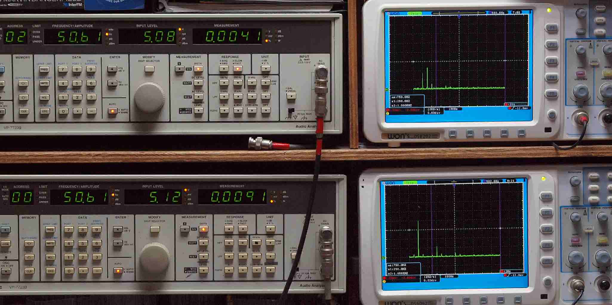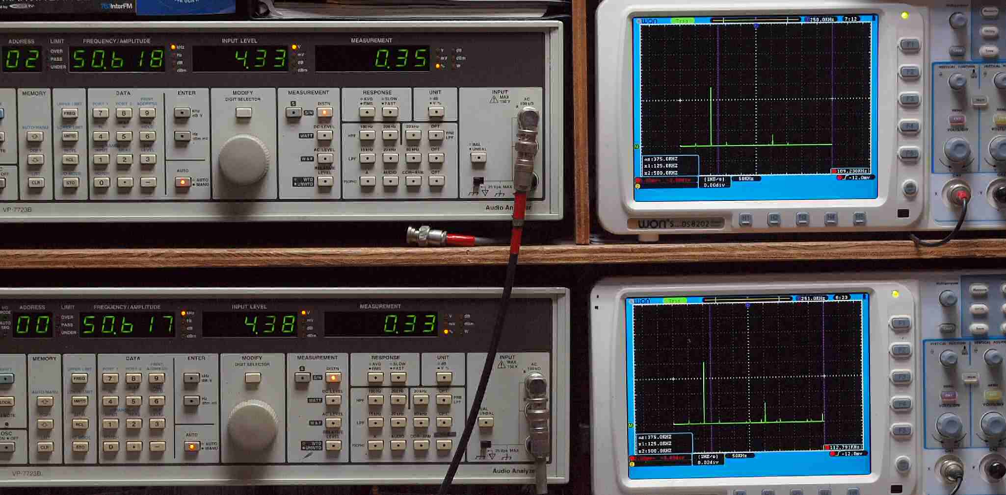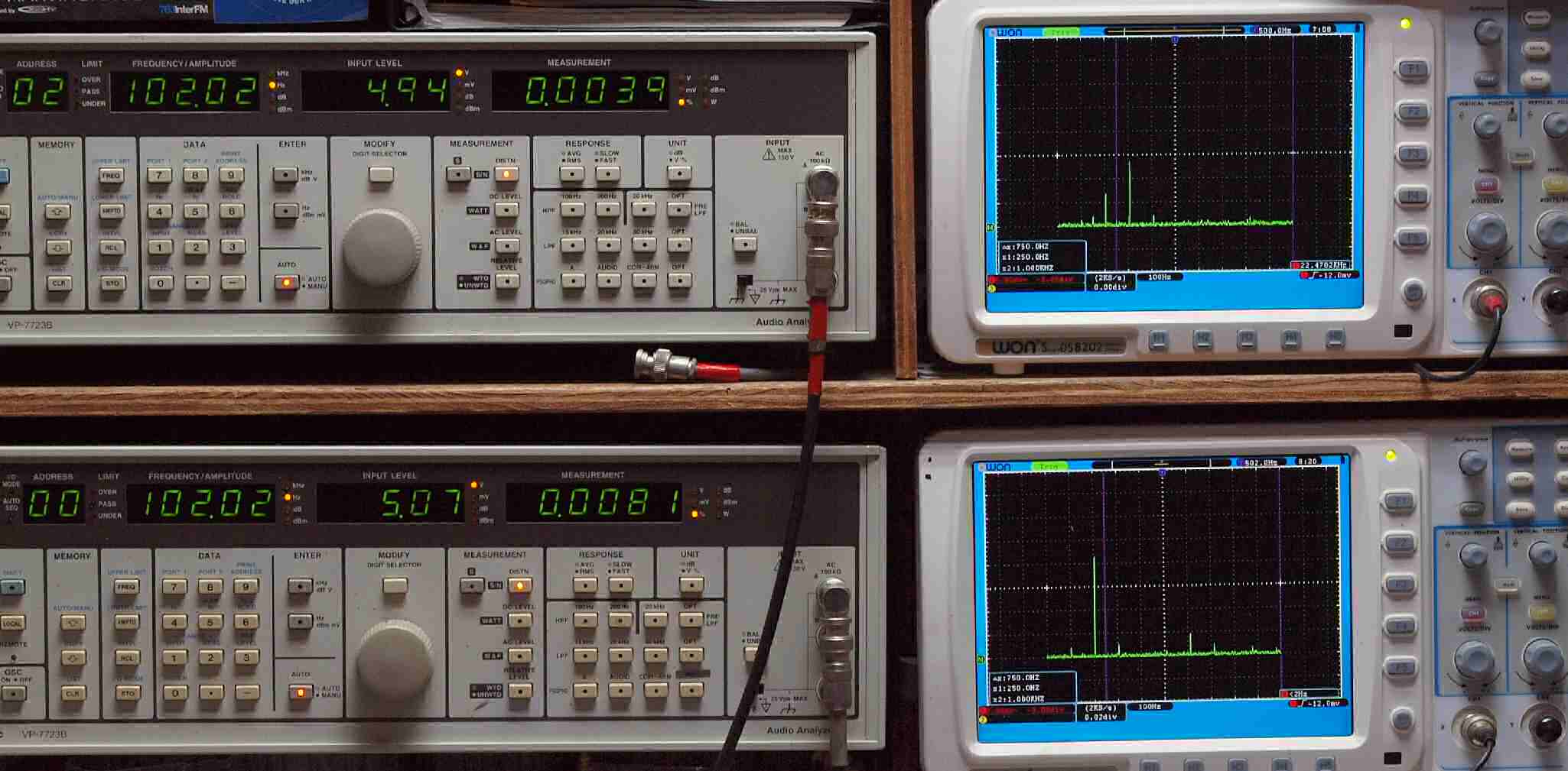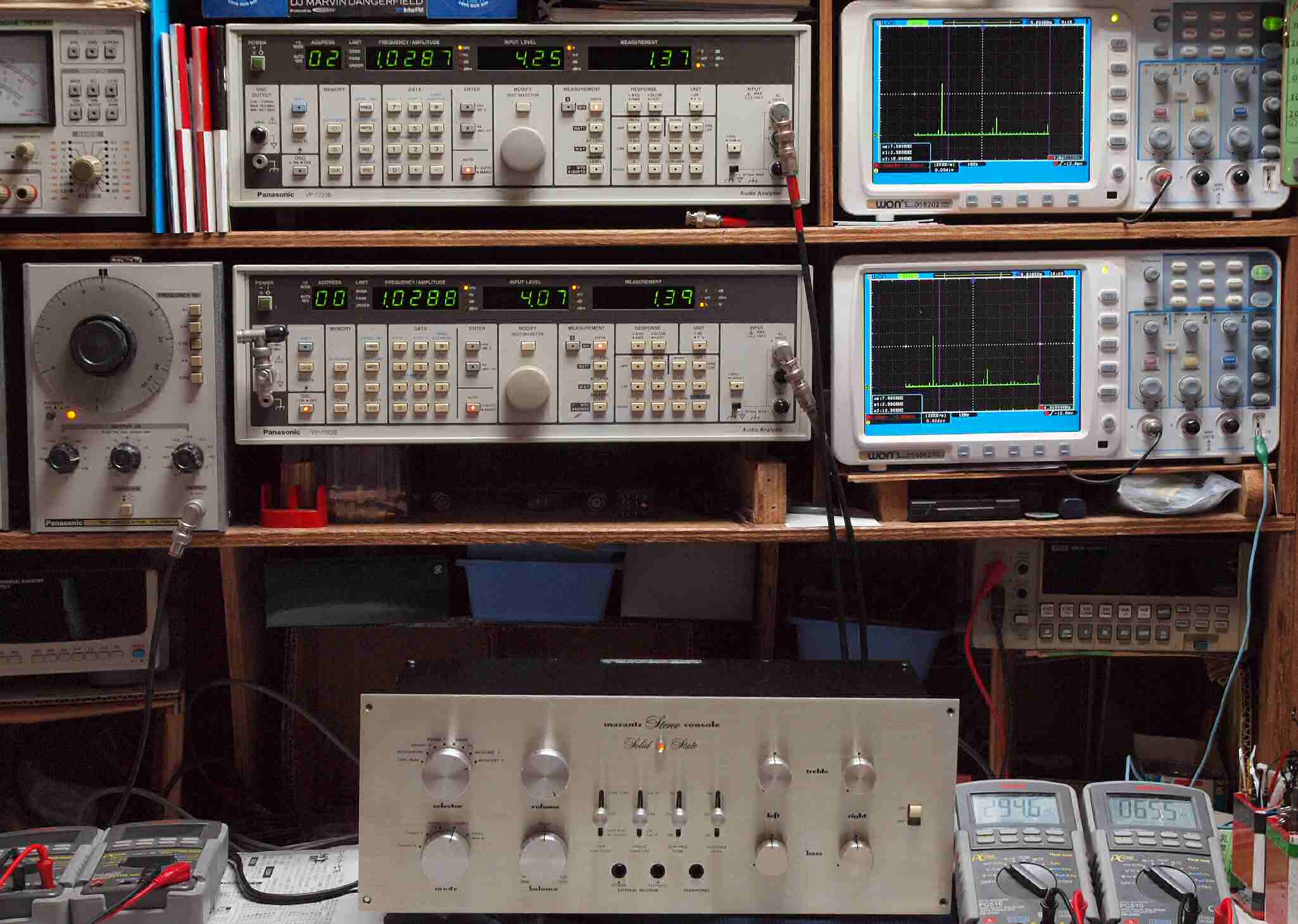 | E. 調整・測定。 画像をクリックすると、大きく(横幅2050ドット)表示されます。 E1. 出力・歪み率測定・調整。 「見方」。 上段中 右側出力を「Audio Analyzer Panasonic VP−7723B」により測定。 表示LED、 左端=メモリーNo、 中左=周波数測定、 中右=出力電圧測定、 右端=歪み率測定。 上段右端 VP−7723Bの基本波除去出力を「owon SDS8202(200MHZ)」で「FFT分析」表示。 下段中 左側出力を「Audio Analyzer Panasonic VP−7723B」により測定。 表示LED、 左端=メモリーNo、 中左=周波数測定、 中右=出力電圧測定、 右端=歪み率測定。 下段右端 VP−7723Bの基本波除去出力を「owon SDS6062(200MHZ)」で「FFT分析」表示。 下段左端 オーディオ発振器 VP−7201A より50Hz〜100kHzの信号を出し(歪み率=約0.003%)、ATT+分配器を通し、AMPに入力。 よって、ダイアル設定出力レベルより低くなります。測定機器の仕様や整備の様子はこちら、「VP−7723B」「VP−7201A」。 FFT画面の見方はこちら。 |
