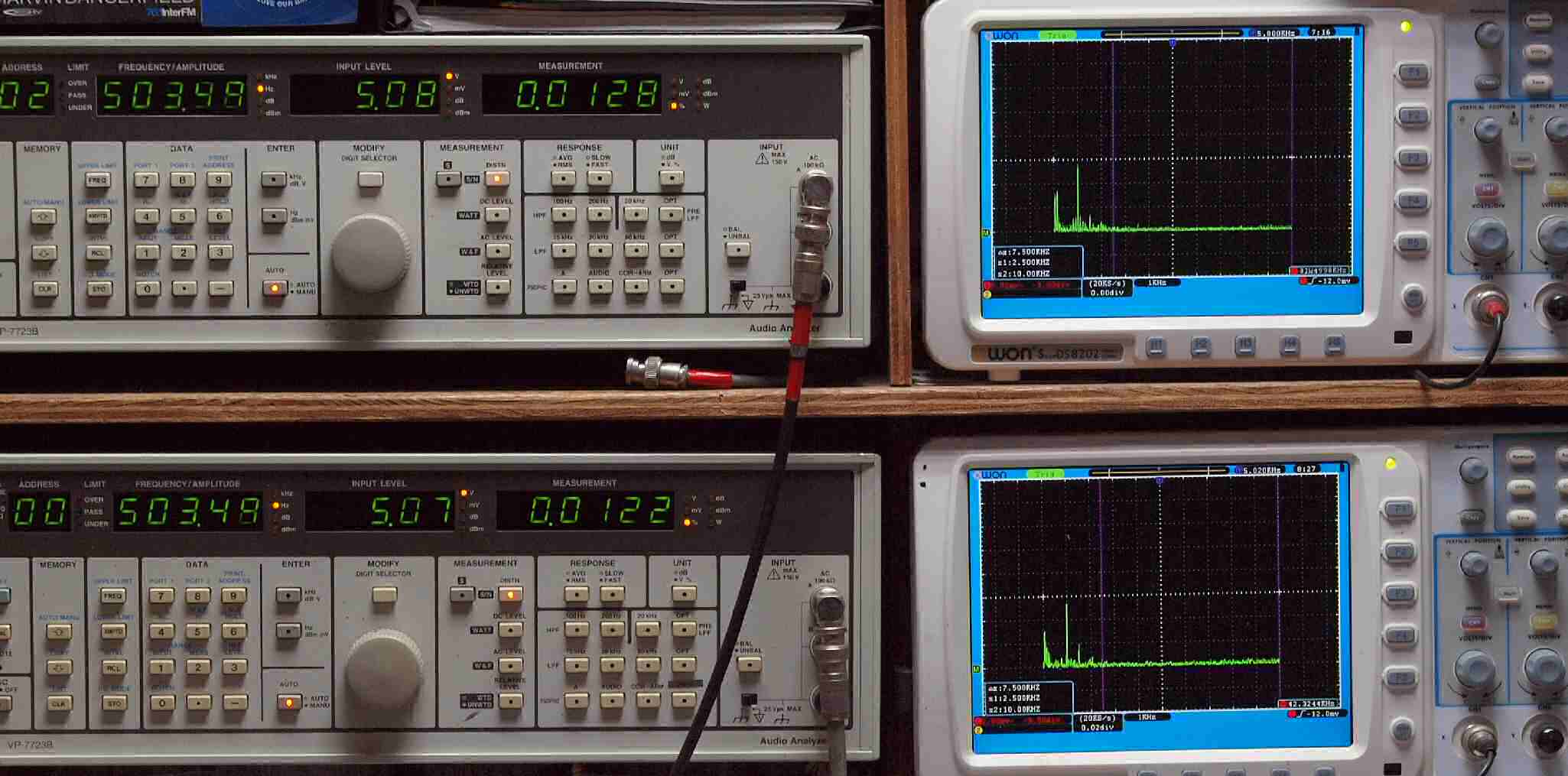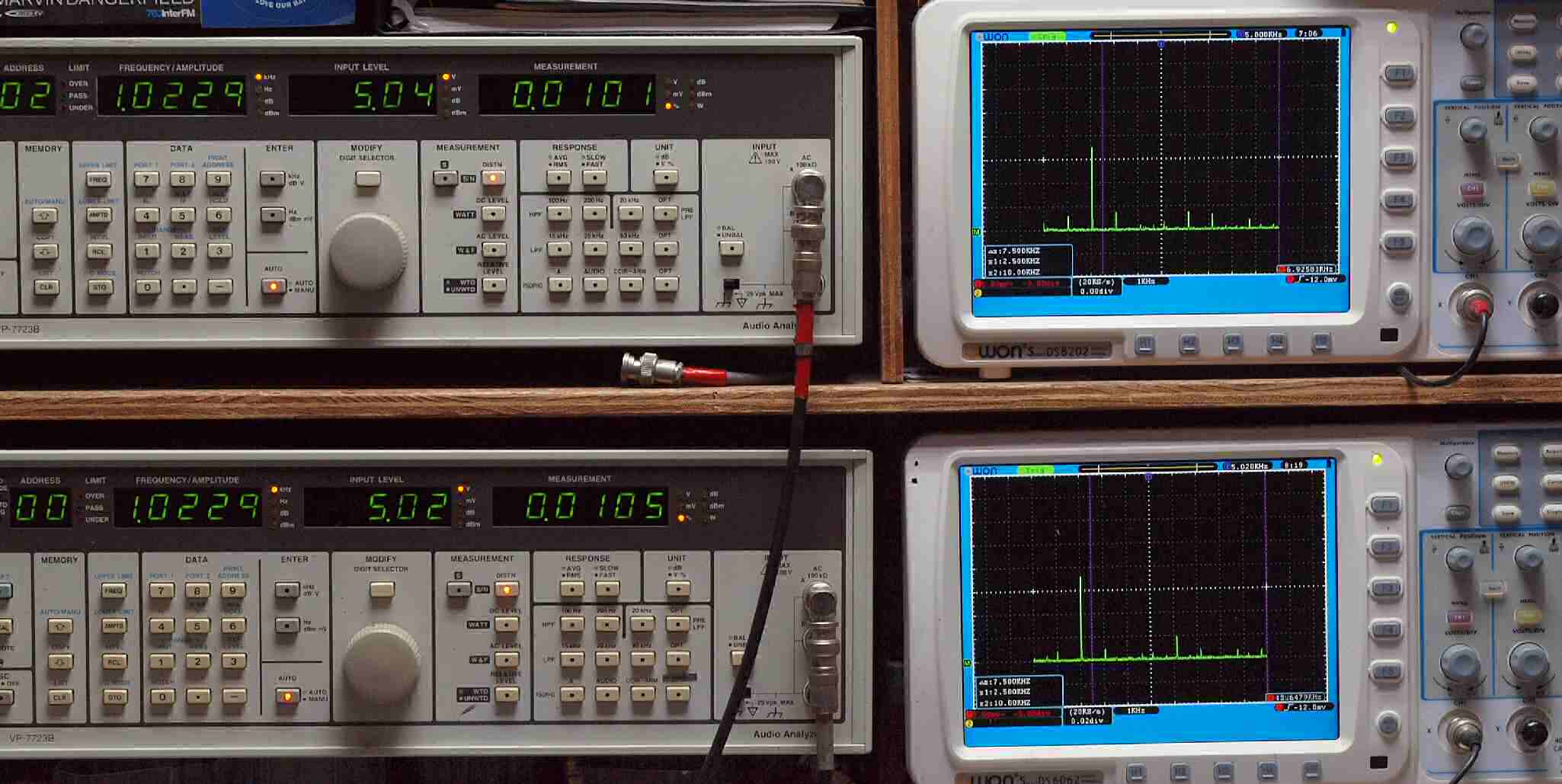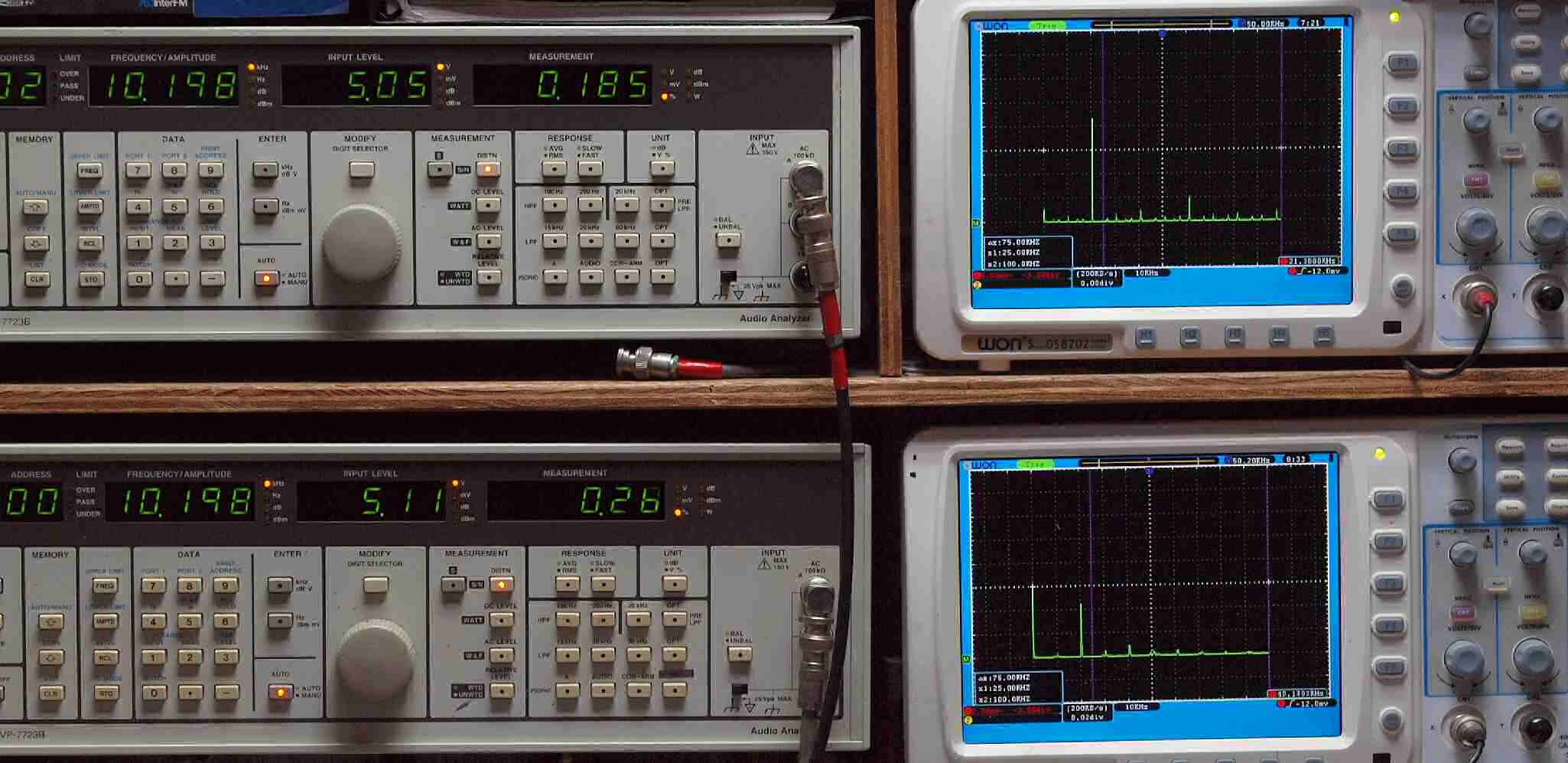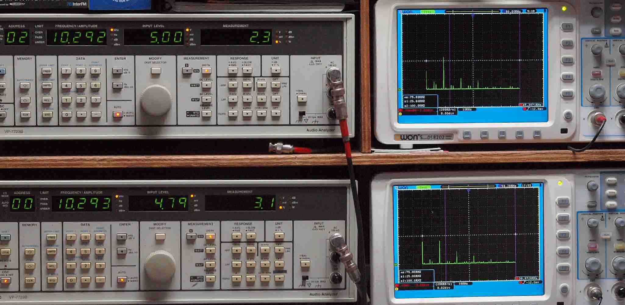 | E. 調整・測定。 画像をクリックすると、大きく(横幅2050ドット)表示されます。 E1. 出力・歪み率測定・調整。 「見方」。 上段中 右側出力を「Audio Analyzer Panasonic VP−7723B」により測定。 表示LED、 左端=メモリーNo、 中左=周波数測定、 中右=出力電圧測定、 右端=歪み率測定。 上段右端 VP−7723Bの基本波除去出力を「owon SDS8202(200MHZ)」で「FFT分析」表示。 下段中 左側出力を「Audio Analyzer Panasonic VP−7723B」により測定。 表示LED、 左端=メモリーNo、 中左=周波数測定、 中右=出力電圧測定、 右端=歪み率測定。 下段右端 VP−7723Bの基本波除去出力を「owon SDS6062(200MHZ)」で「FFT分析」表示。 下段左端 オーディオ発振器 VP−7201A より50Hz〜100kHzの信号を出し(歪み率=約0.003%)、ATT+分配器を通し、AMPに入力。 よって、ダイアル設定出力レベルより低くなります。測定機器の仕様や整備の様子はこちら、「VP−7723B」「VP−7201A」。 FFT画面の見方はこちら。 |
