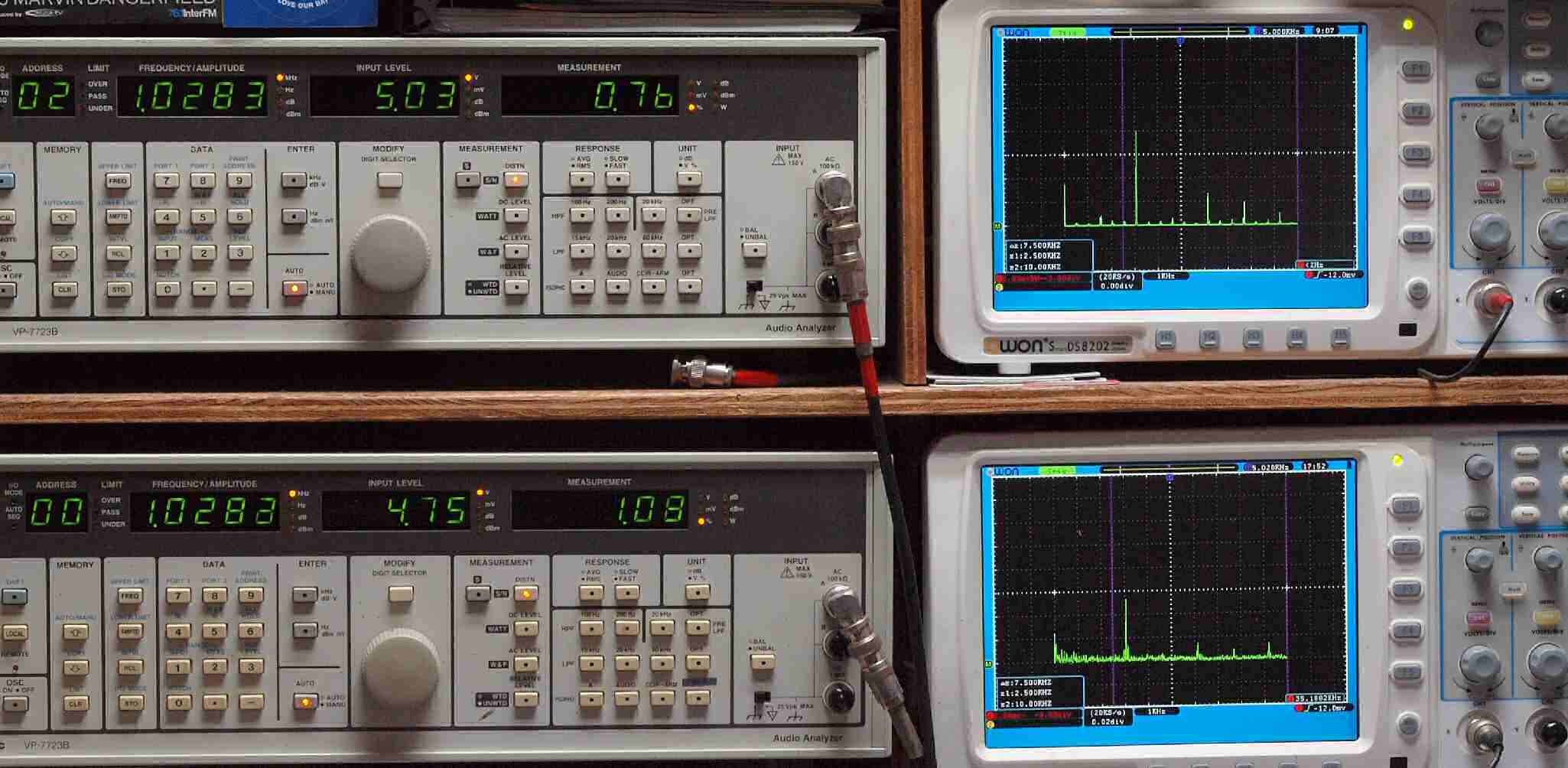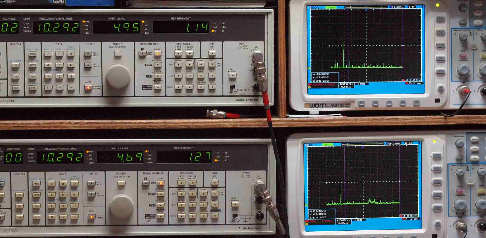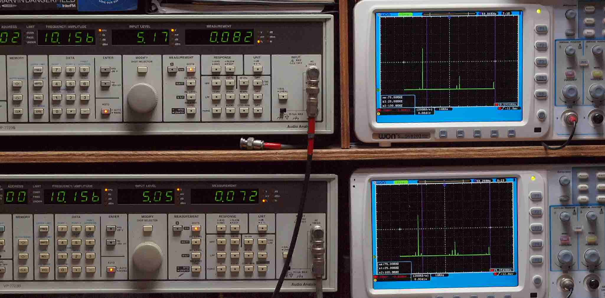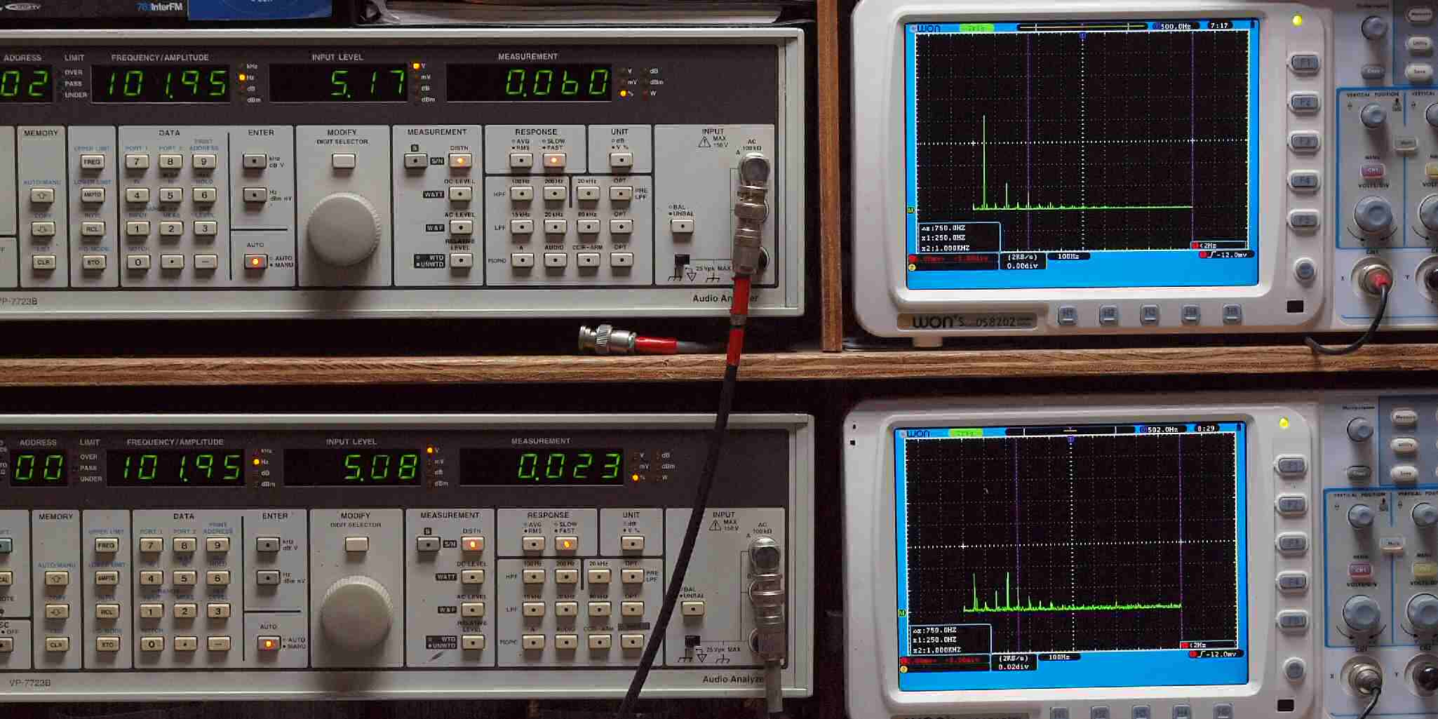| E. 調整・測定。 画像をクリックすると、大きく(横幅2050ドット)表示されます。 E1. 出力・歪み率測定・調整。 「見方」。 上段中 右側出力を「Audio Analyzer Panasonic VP−7723B」により測定。 表示LED、 左端=メモリーNo、 中左=周波数測定、 中右=出力電圧測定、 右端=歪み率測定。 上段右端 VP−7723Bの基本波除去出力を「owon SDS8202(200MHZ)」で「FFT分析」表示。 下段中 左側出力を「Audio Analyzer Panasonic VP−7723B」により測定。 表示LED、 左端=メモリーNo、 中左=周波数測定、 中右=出力電圧測定、 右端=歪み率測定。 下段右端 VP−7723Bの基本波除去出力を「owon SDS6062(200MHZ)」で「FFT分析」表示。 下段左端 オーディオ発振器 VP−7201A より50Hz〜100kHzの信号を出し(歪み率=約0.003%)、ATT+分配器を通し、AMPに入力。 よって、ダイアル設定出力レベルより低くなります。測定機器の仕様や整備の様子はこちら、「VP−7723B」「VP−7201A」。 FFT画面の見方はこちら。 |