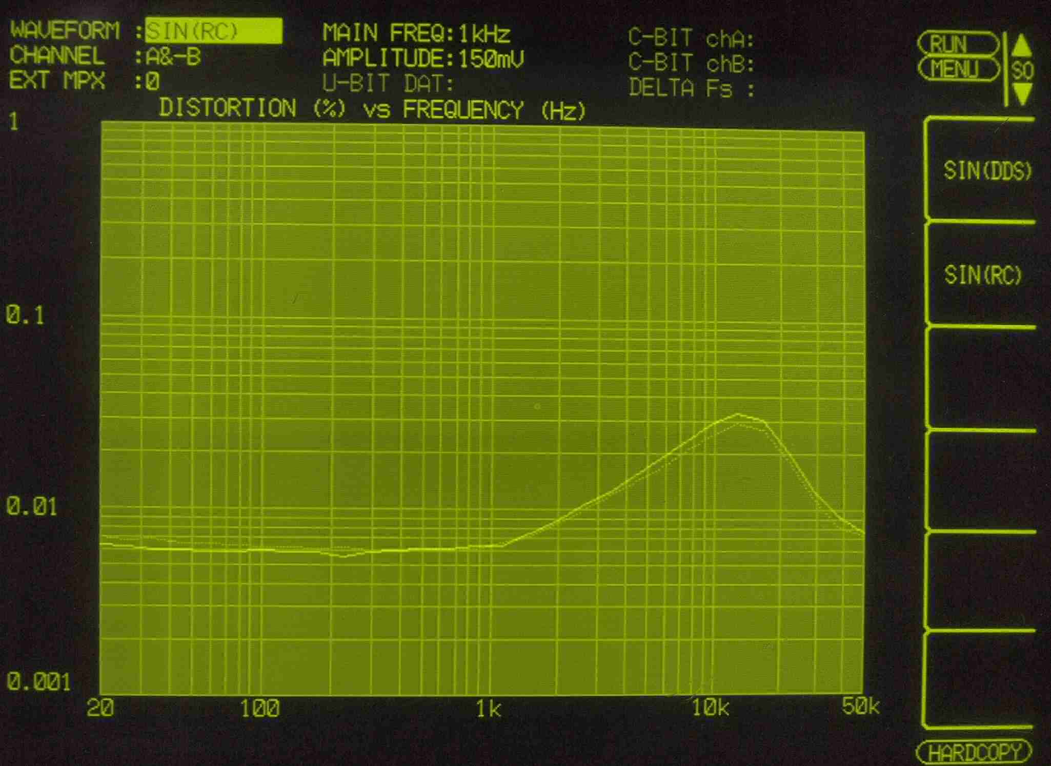 | E31. MM 50Hz入力、R側出力電圧=5V、 0.036%歪み。 L側出力電圧=5V、 0.0728%歪み。 「FFT分析」のオシロのカーソル周波数、左=250Hz、右=1kHz。 |