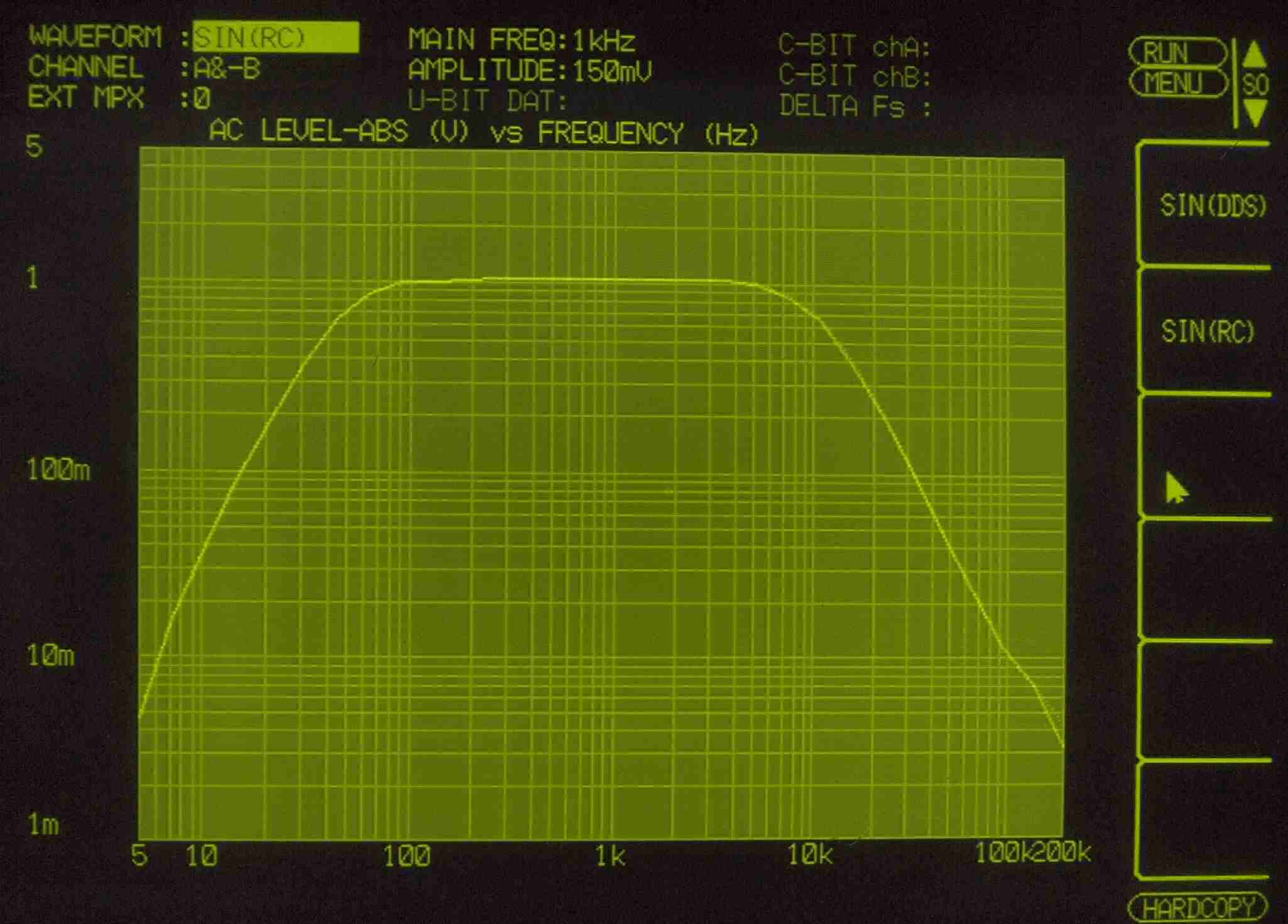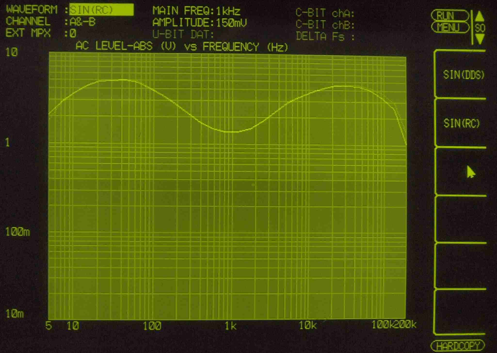 | E32. MM 100Hz入力、R側出力電圧=5V、 0.060%歪み。 L側出力電圧=5V、 0.023%歪み。 「FFT分析」のオシロのカーソル周波数、左=250Hz、右=1kHz。 |