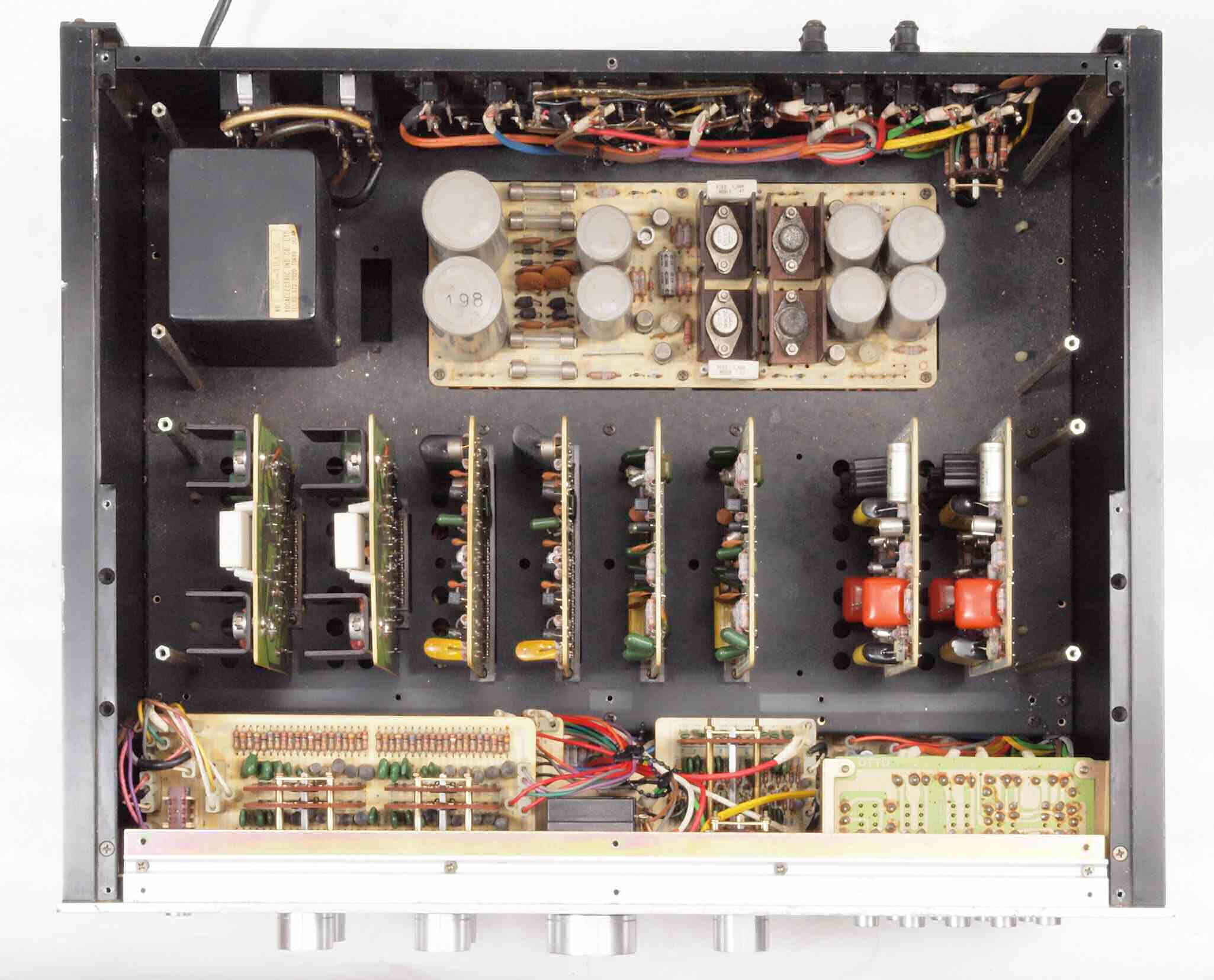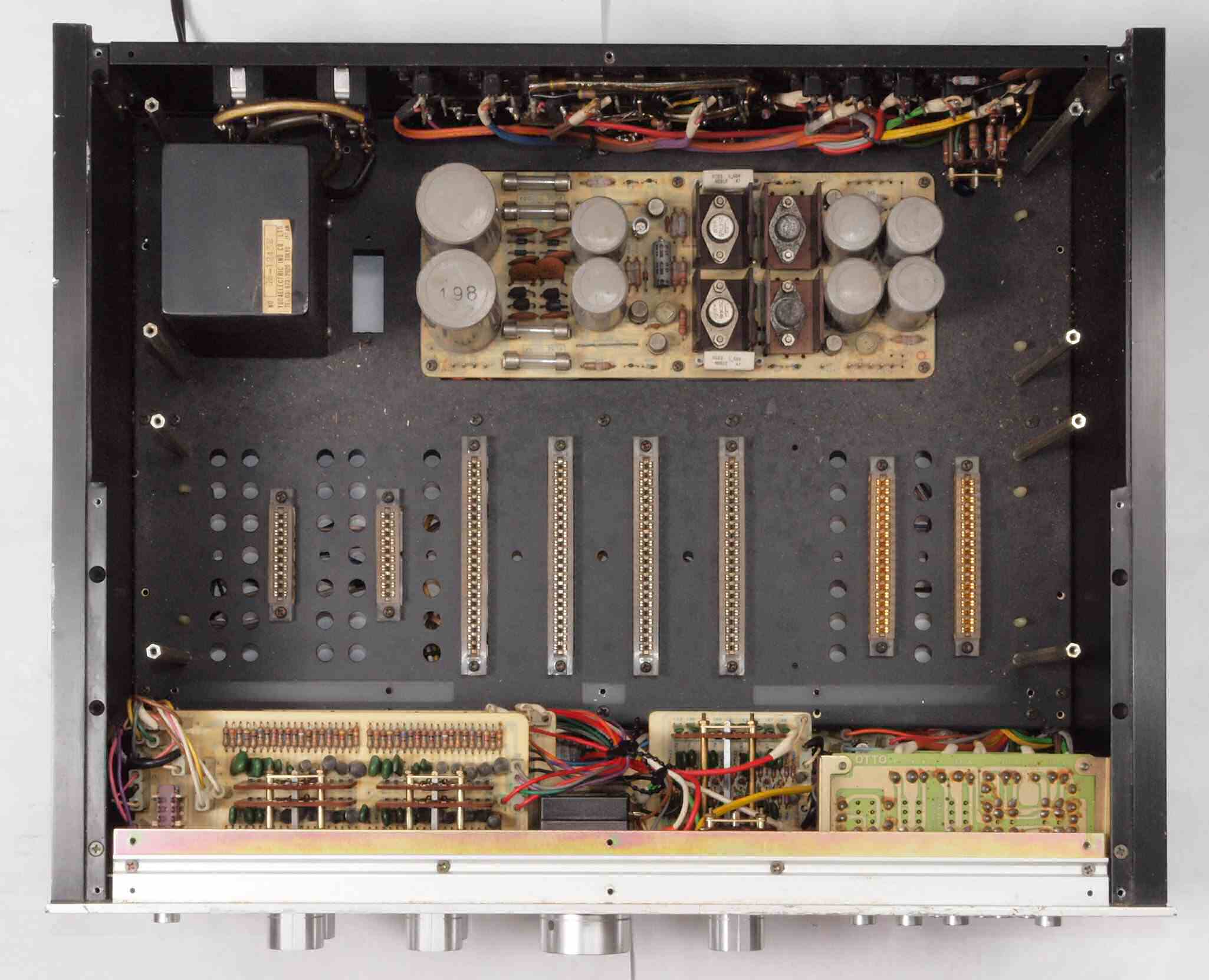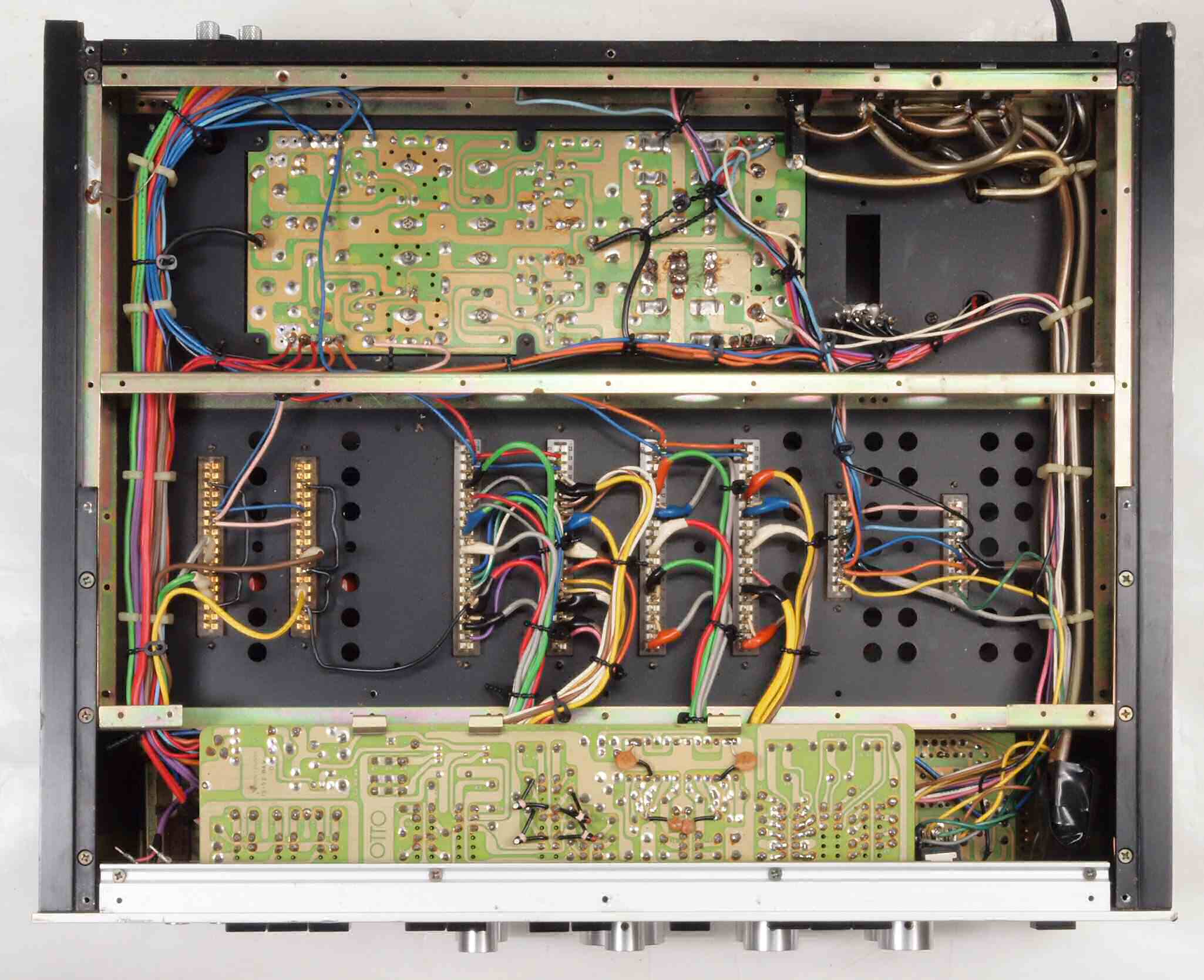 | C. 修理状況。 画像をクリックすると、大きく(横幅2050ドット)表示されます。 C0. 修理中 基板を取り去ったシャーシ。 EQアンプ基板のみ金メッキカードエッジコネクター。 |