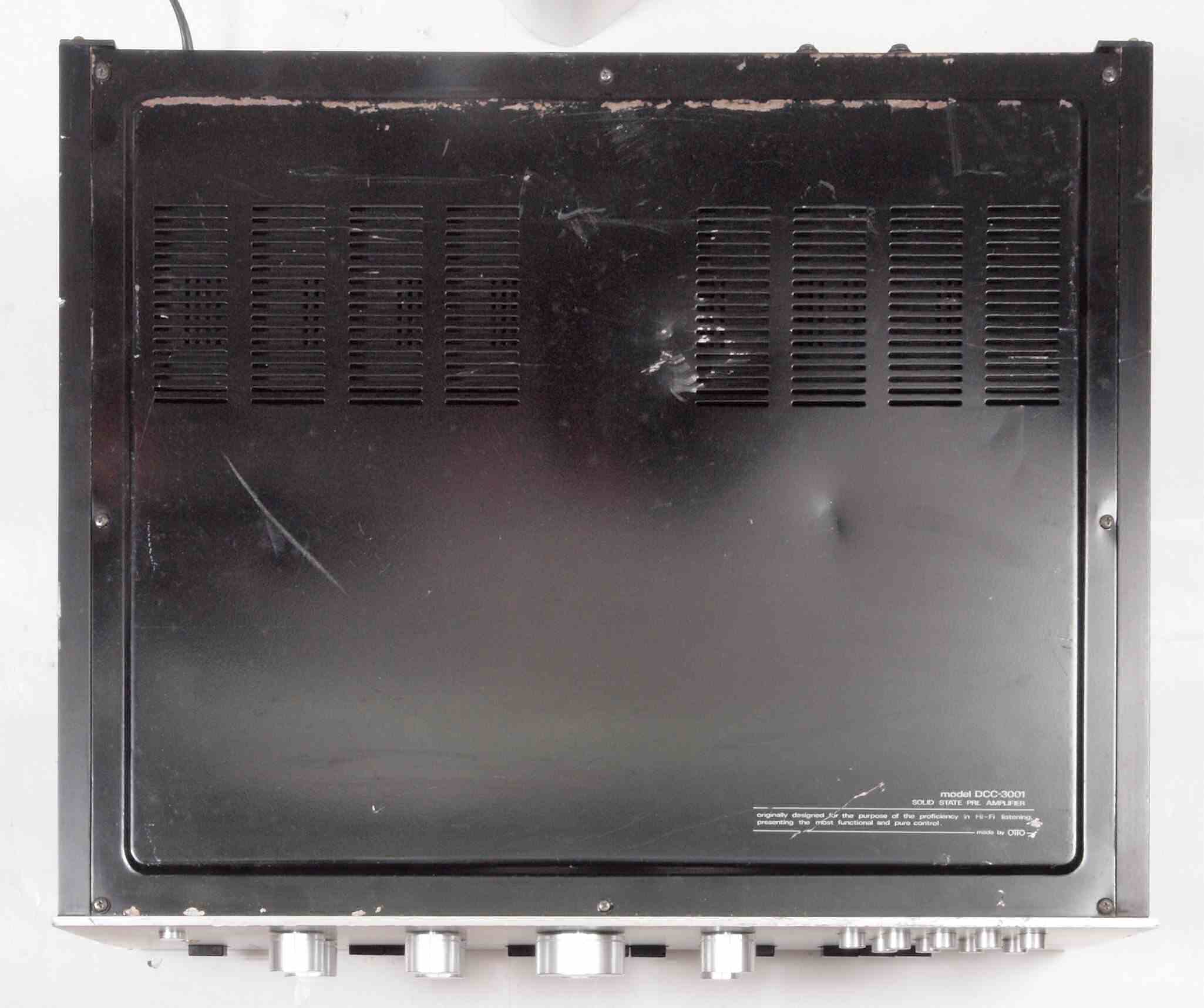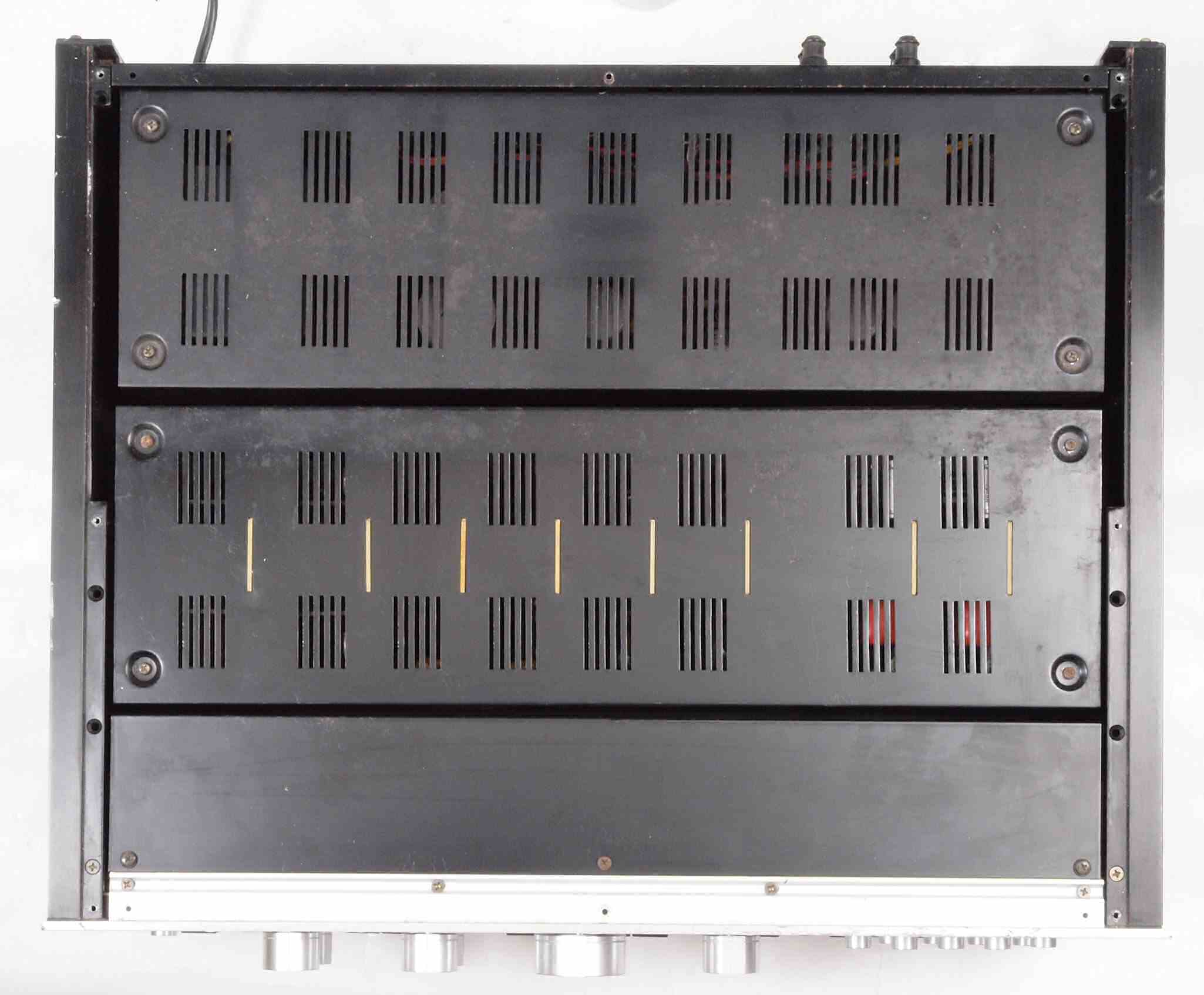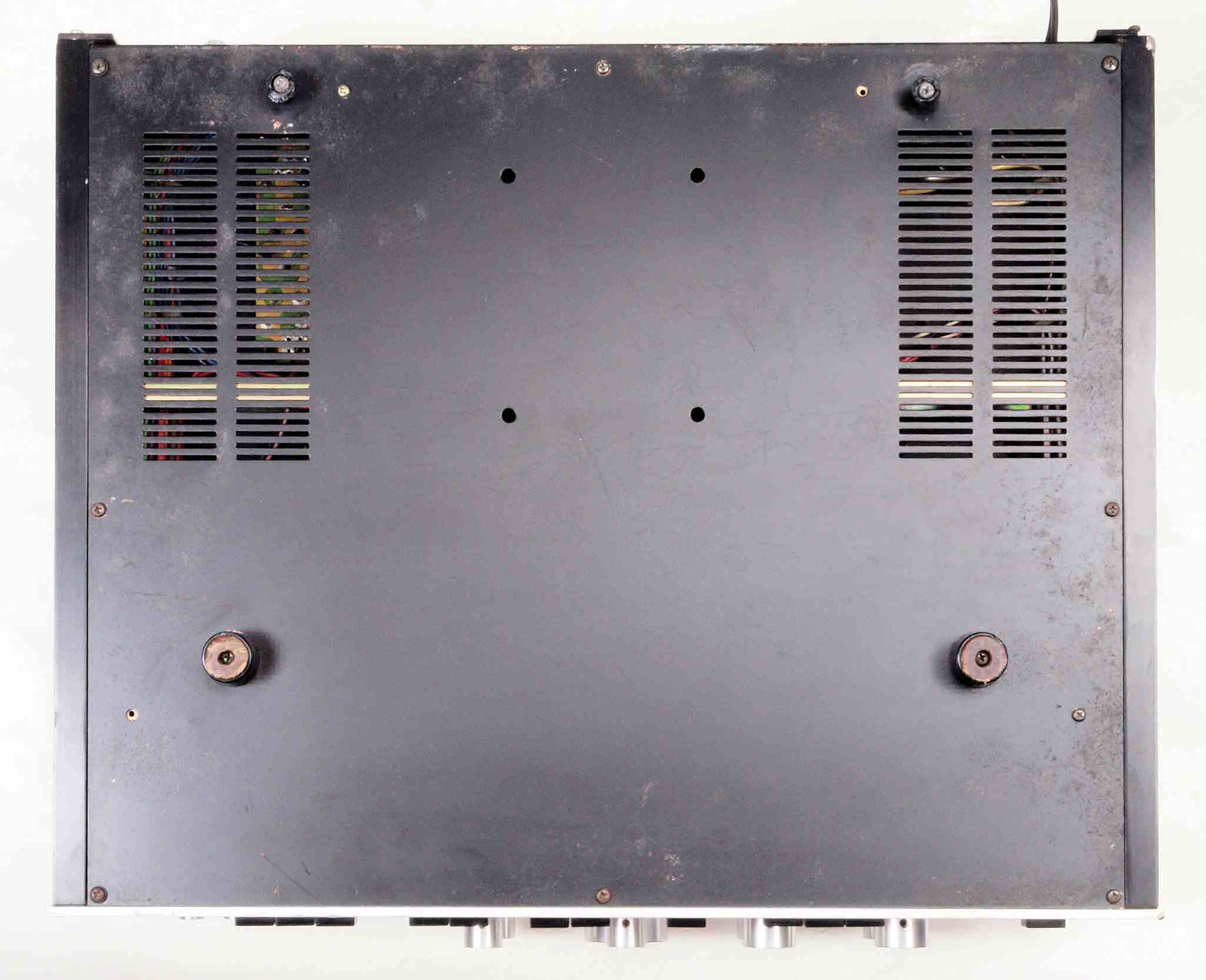 | C. 修理状況。 画像をクリックすると、大きく(横幅2050ドット)表示されます。 C0. 修理中 基板を取り去ったシャーシ。 EQアンプ基板のみ金メッキカードエッジコネクター。 |