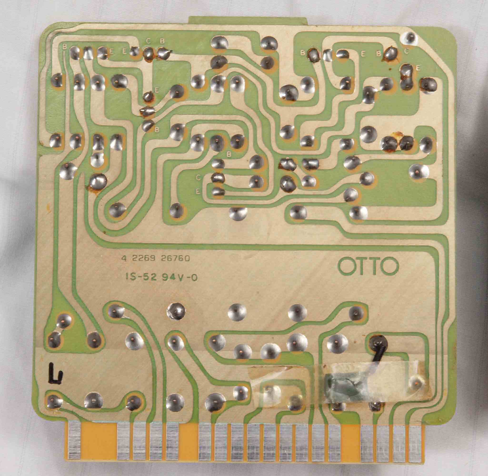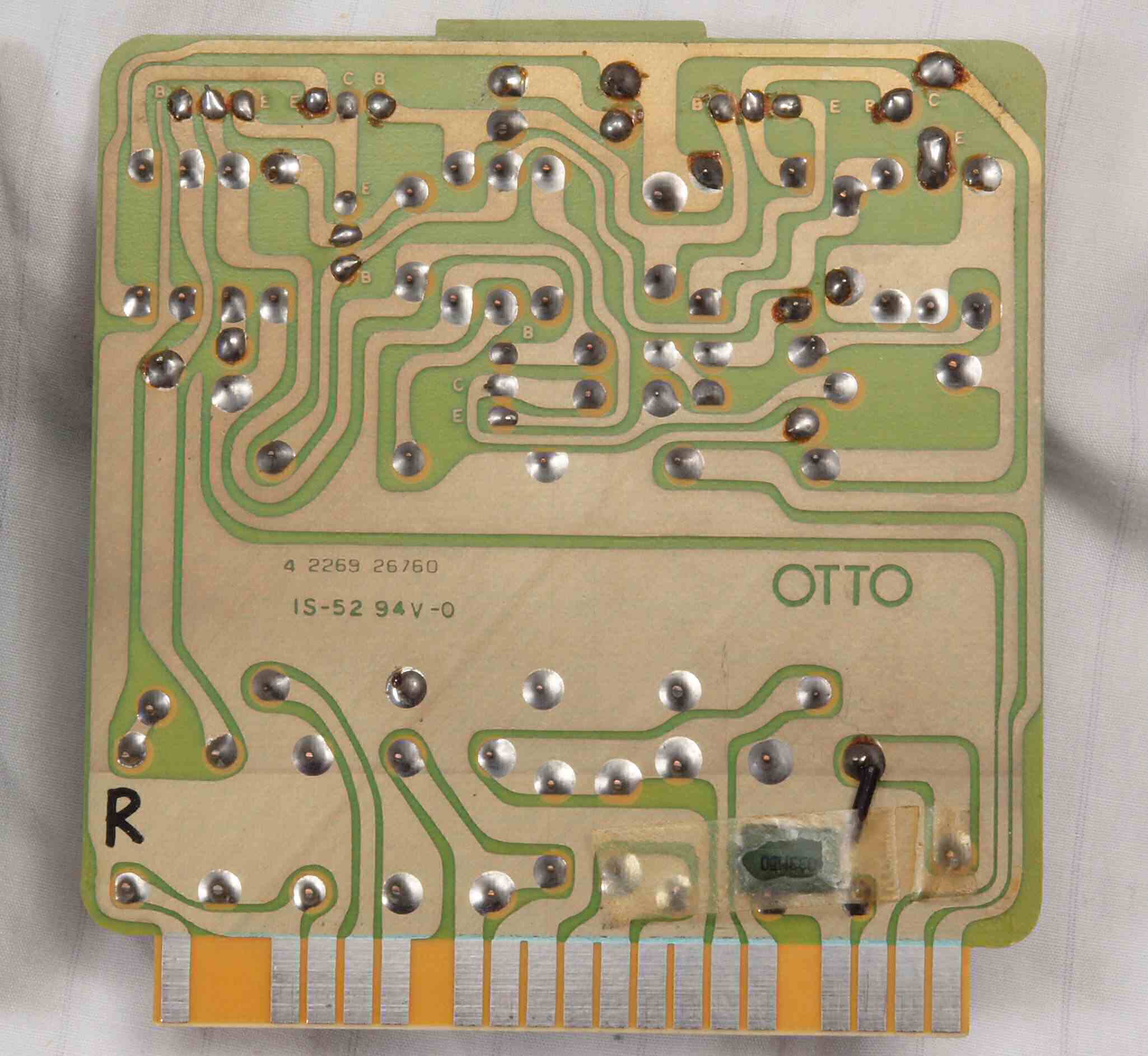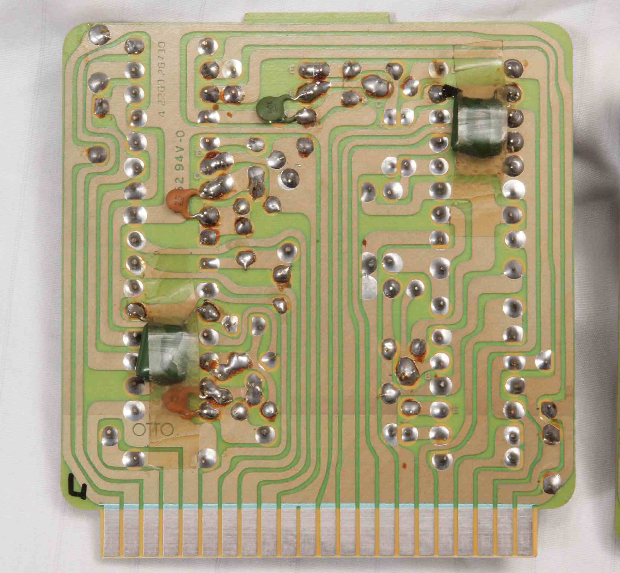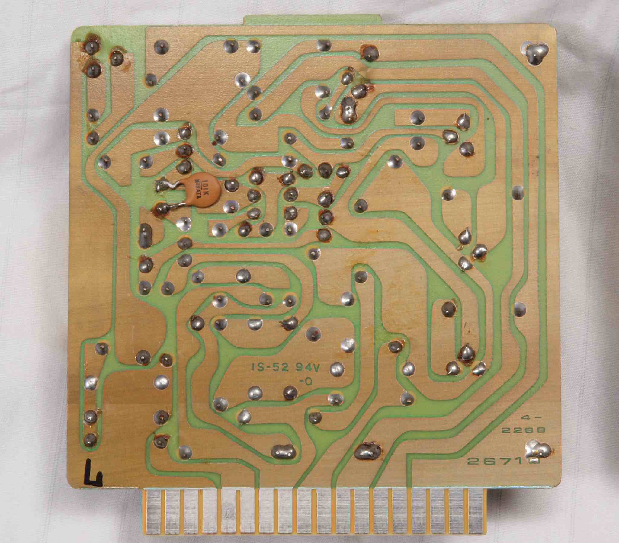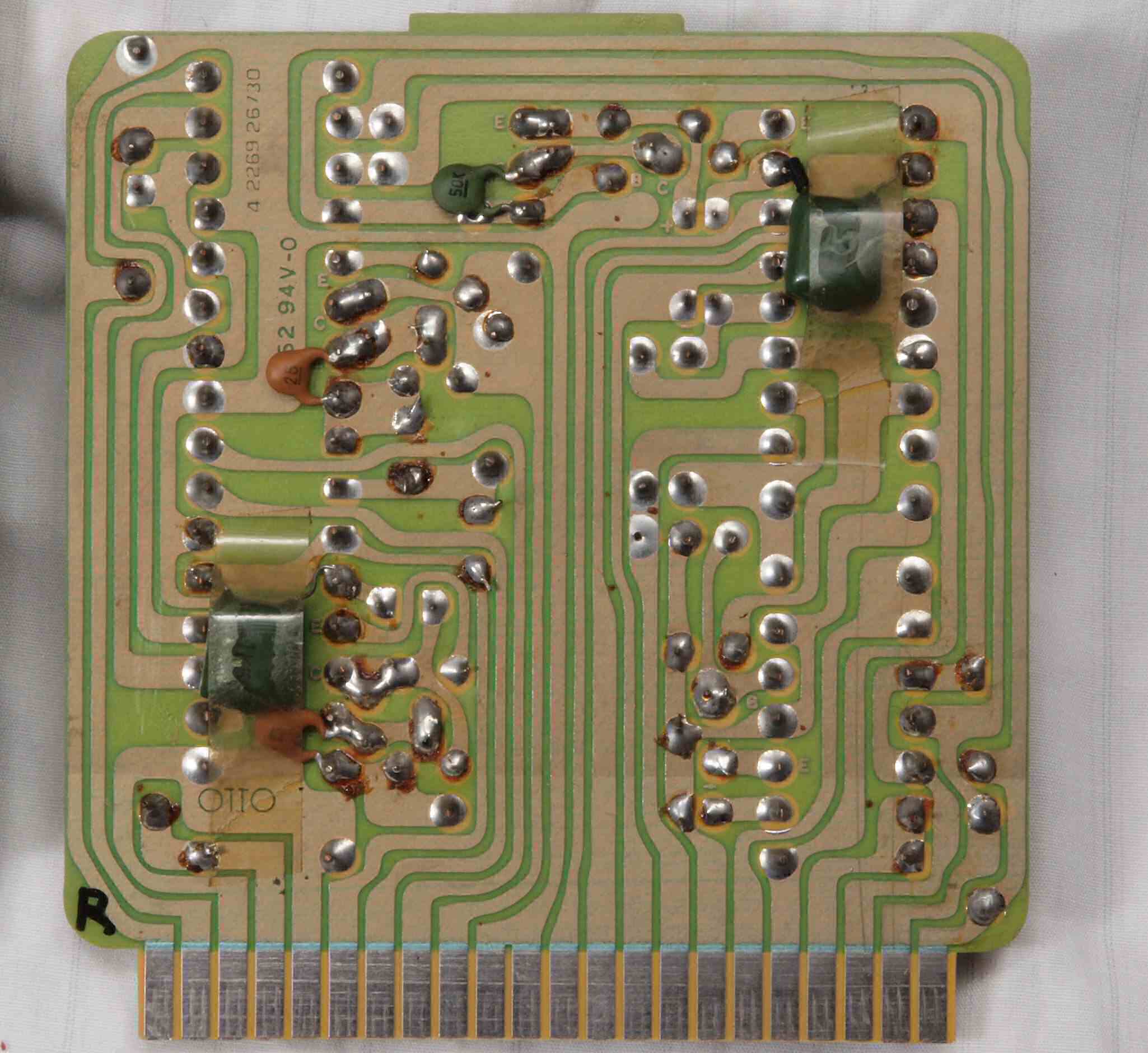 | C13. 修理前 R側EQアンプ基板裏。 金メッキカードエッジコネクターなのに基板はハンダメッキ? | ||||||||||||||||||||||||||||||||||||||||||||||||||||||||||||||||||||||||