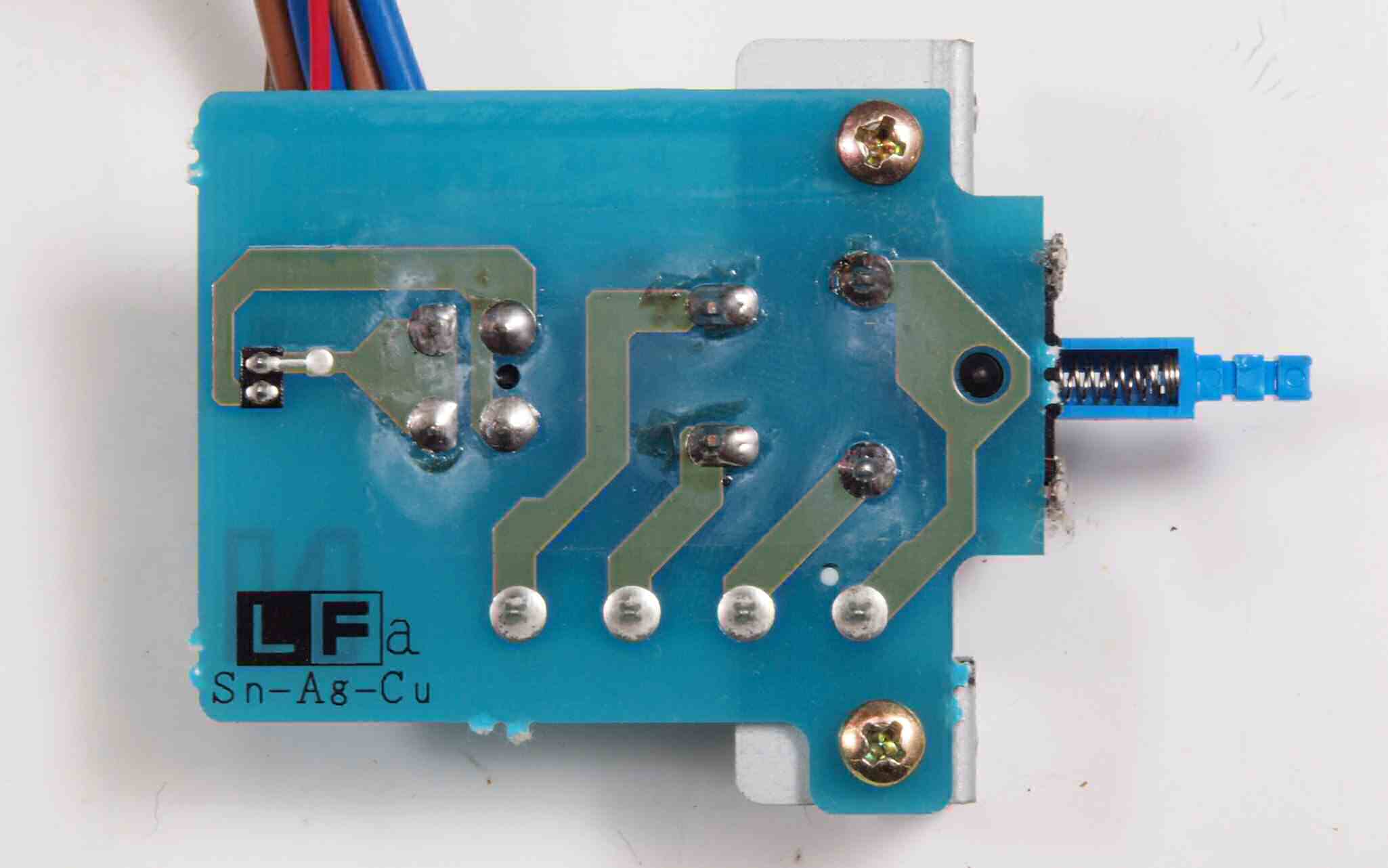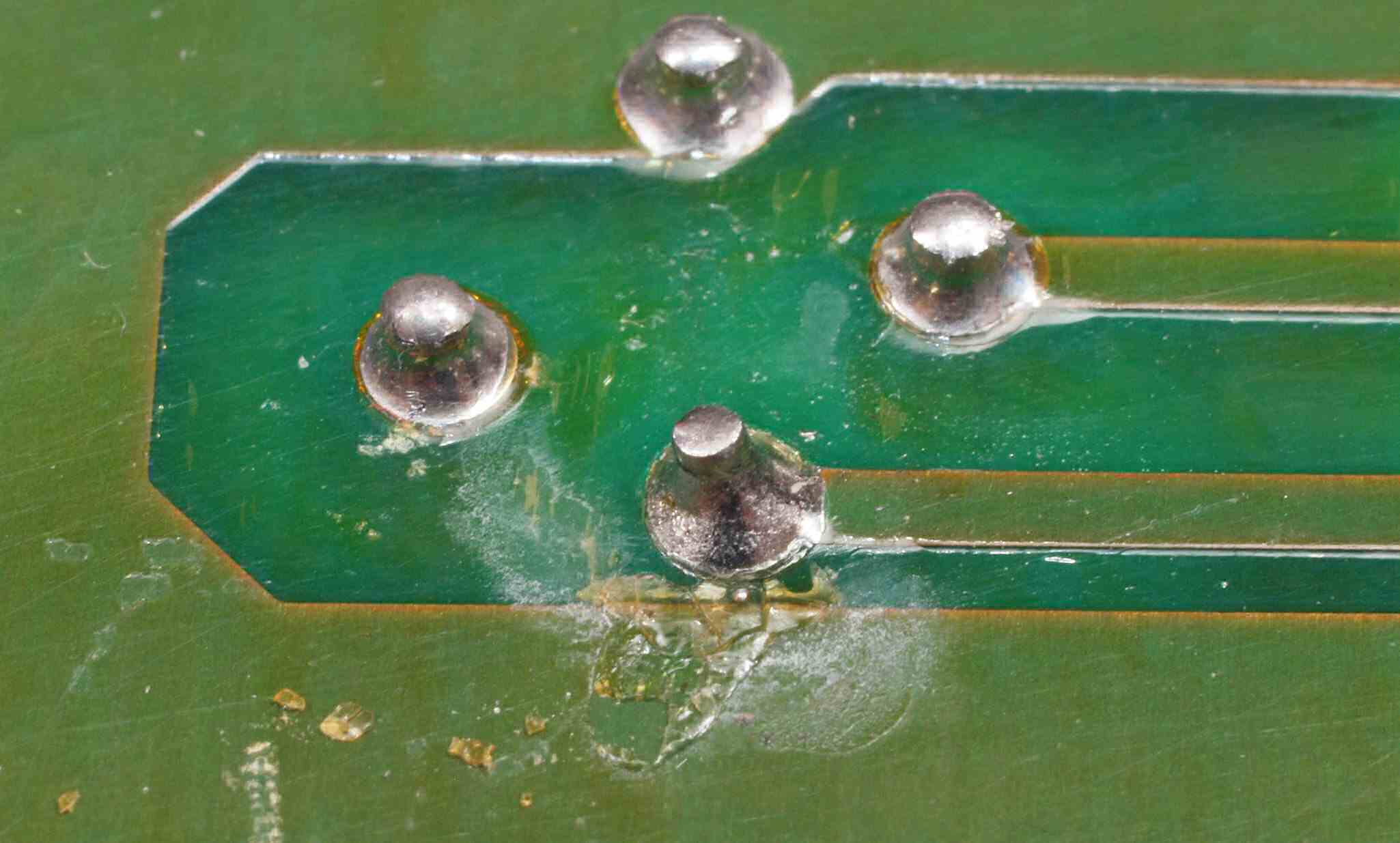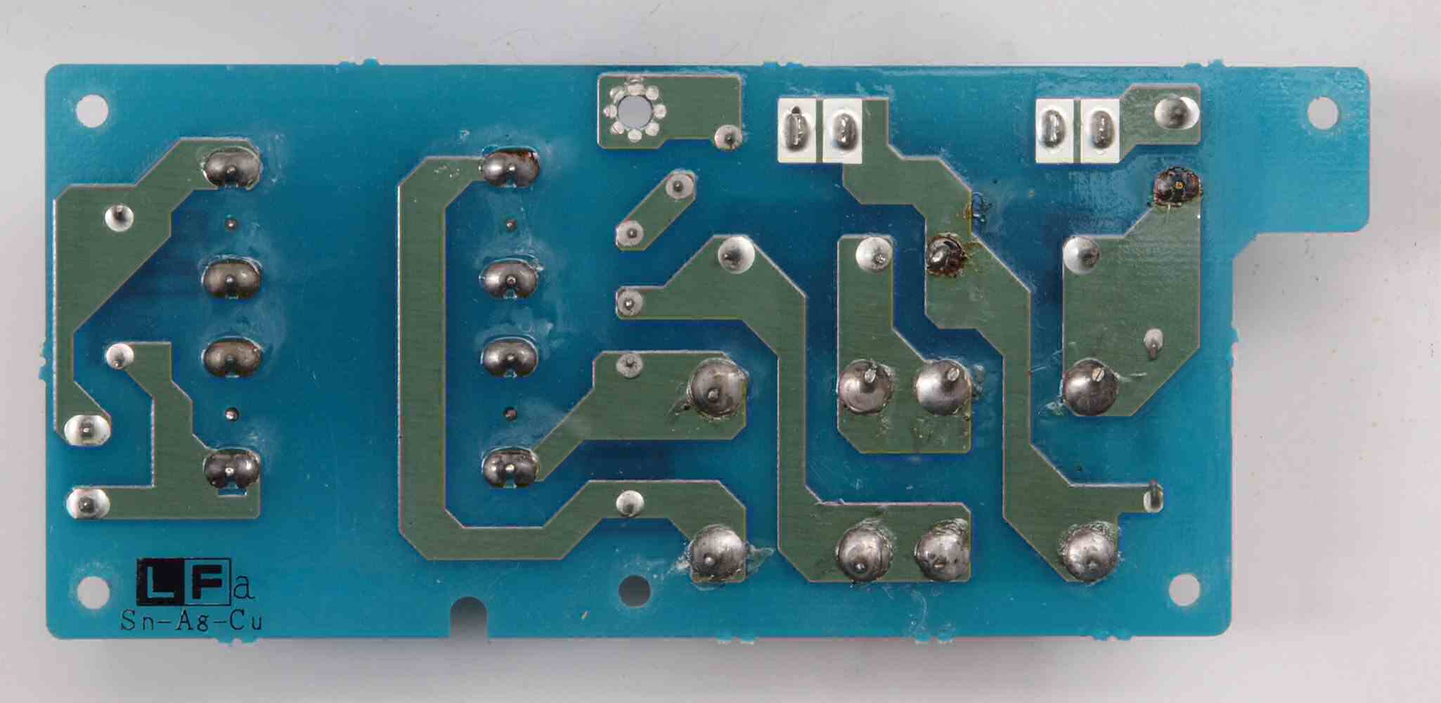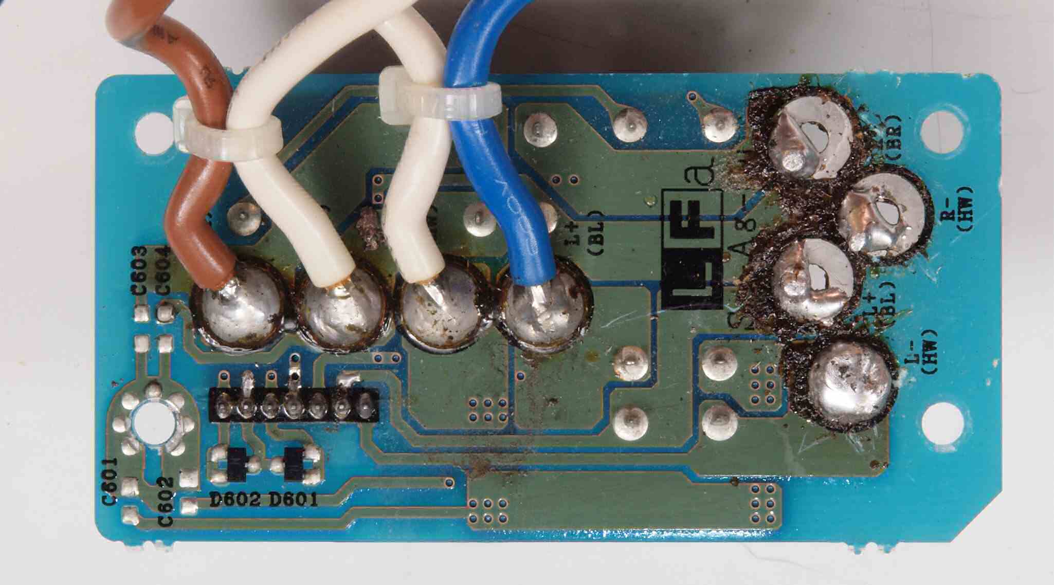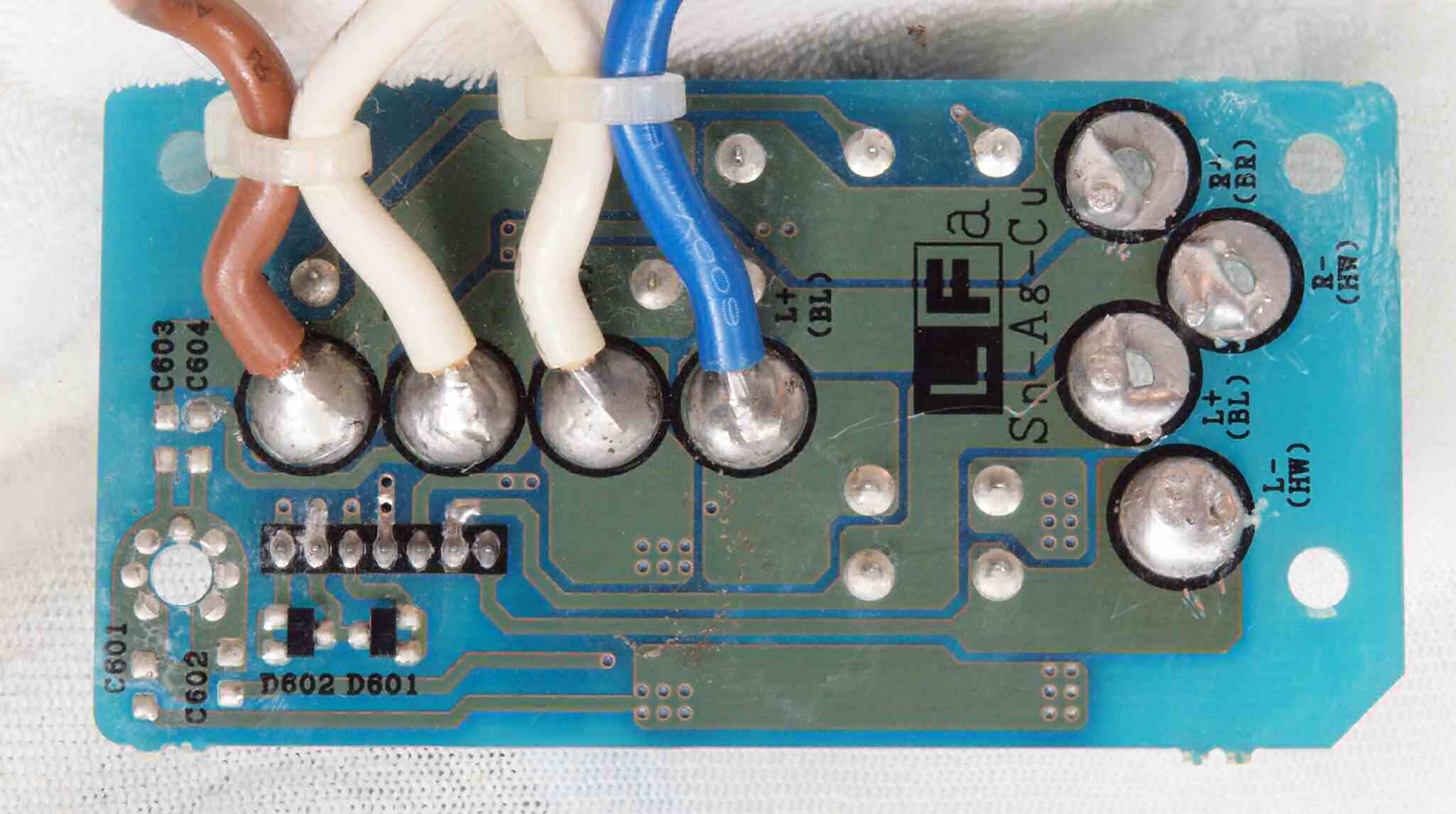 C63. 修理中 SP接続リレー基板裏。何回もアンプからの出力線が半田付けされてフラックスで見えないので洗浄する。